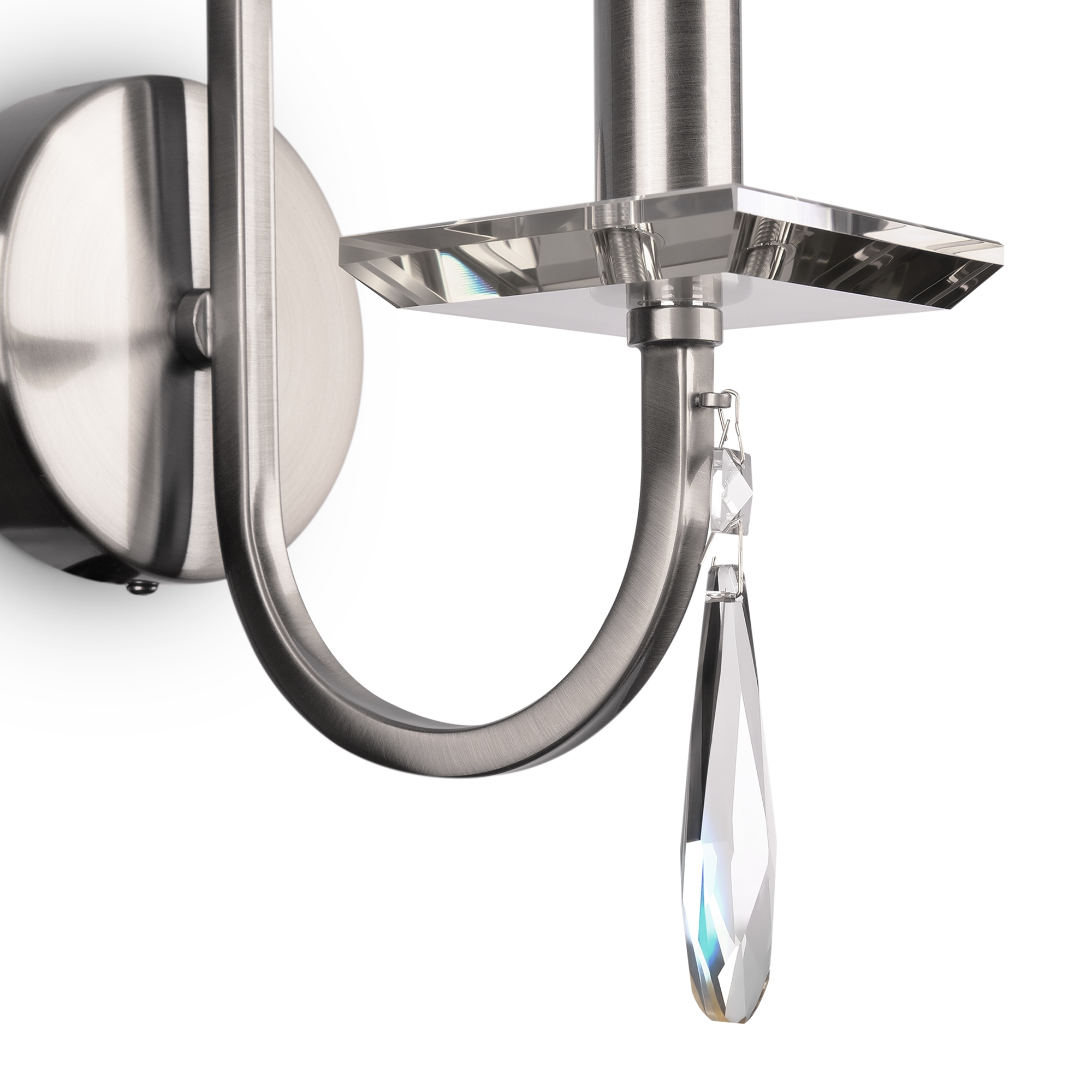 Металлическая арматура в двух оттенках: латунь и никель. Классическая форма плафона в виде свечи. Торшер и настольная лампа имеют тканевые абажуры. Белые – для арматуры цвета никель, оттенка кремовый шампань – для латунной. Декор – прозрачные хрустальные подвесы каплевидной формы. Торшер с цоколем Е27, лампа, бра и люстры – Е14.