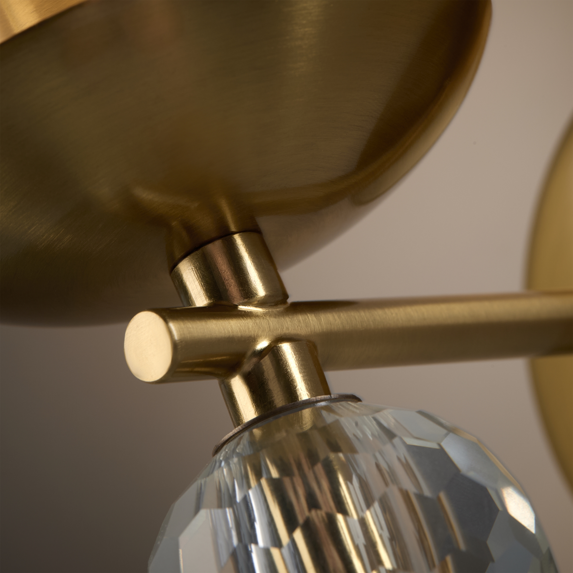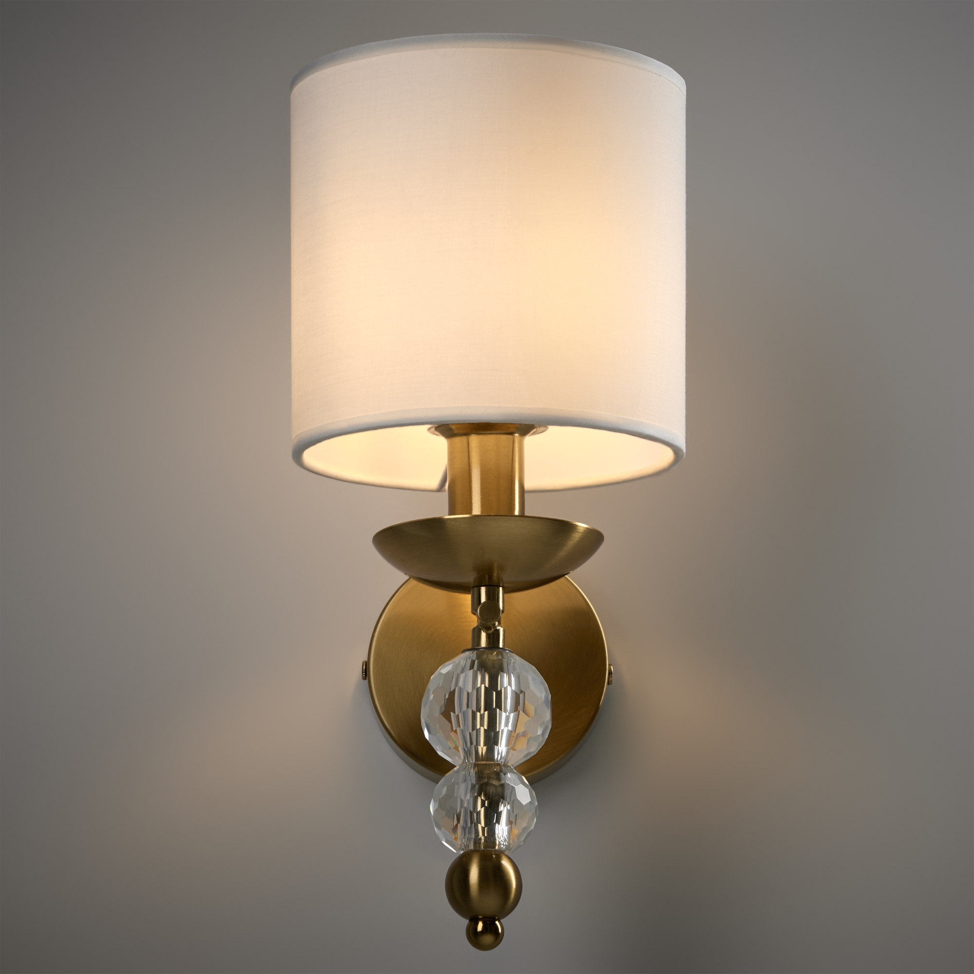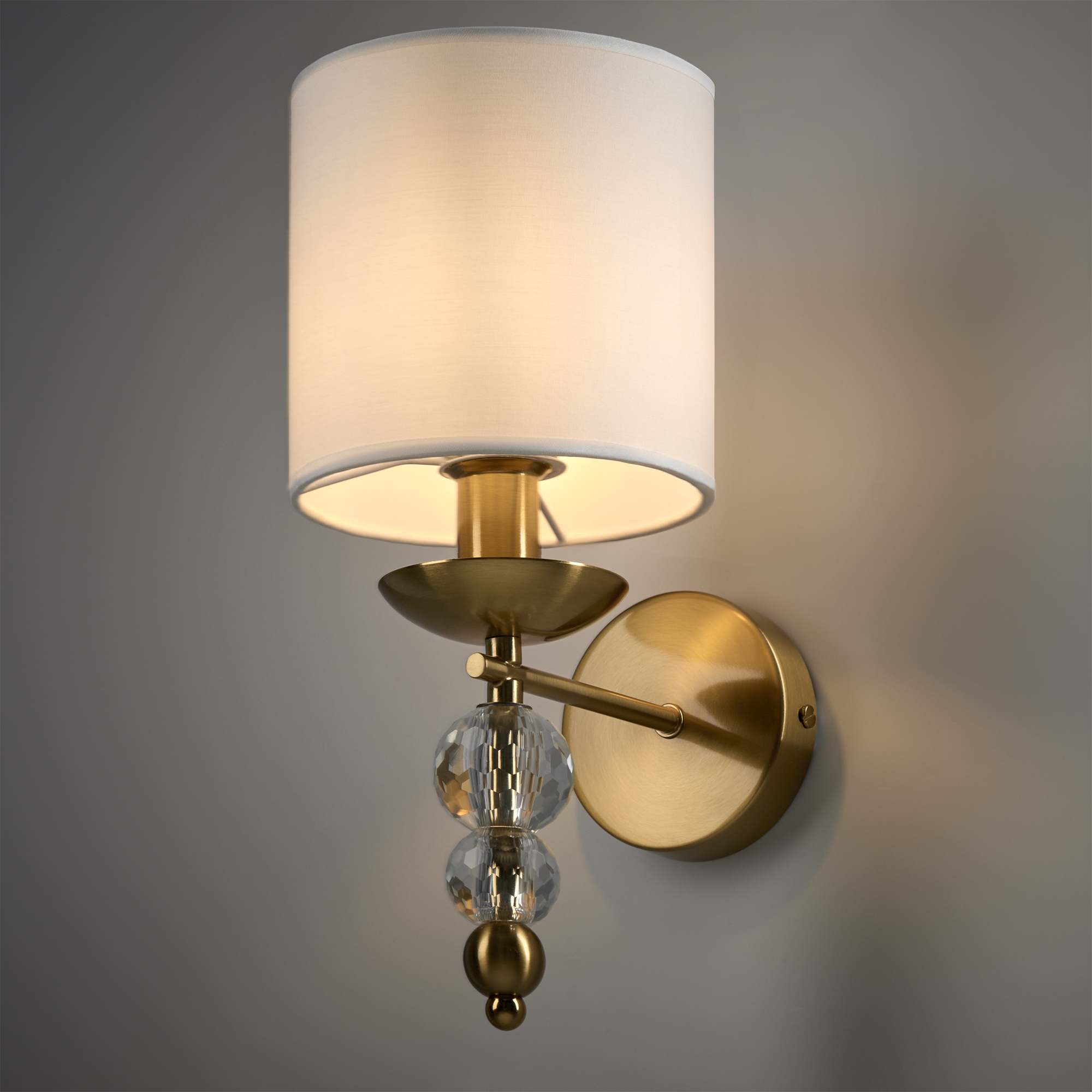 Материал абажура — ткань, цвет — белый. Металлическая арматура в цвете латунь обрамлена хрустальными бусинами. Источник света — лампы с цоколем Е14. Степень защиты — IP20.