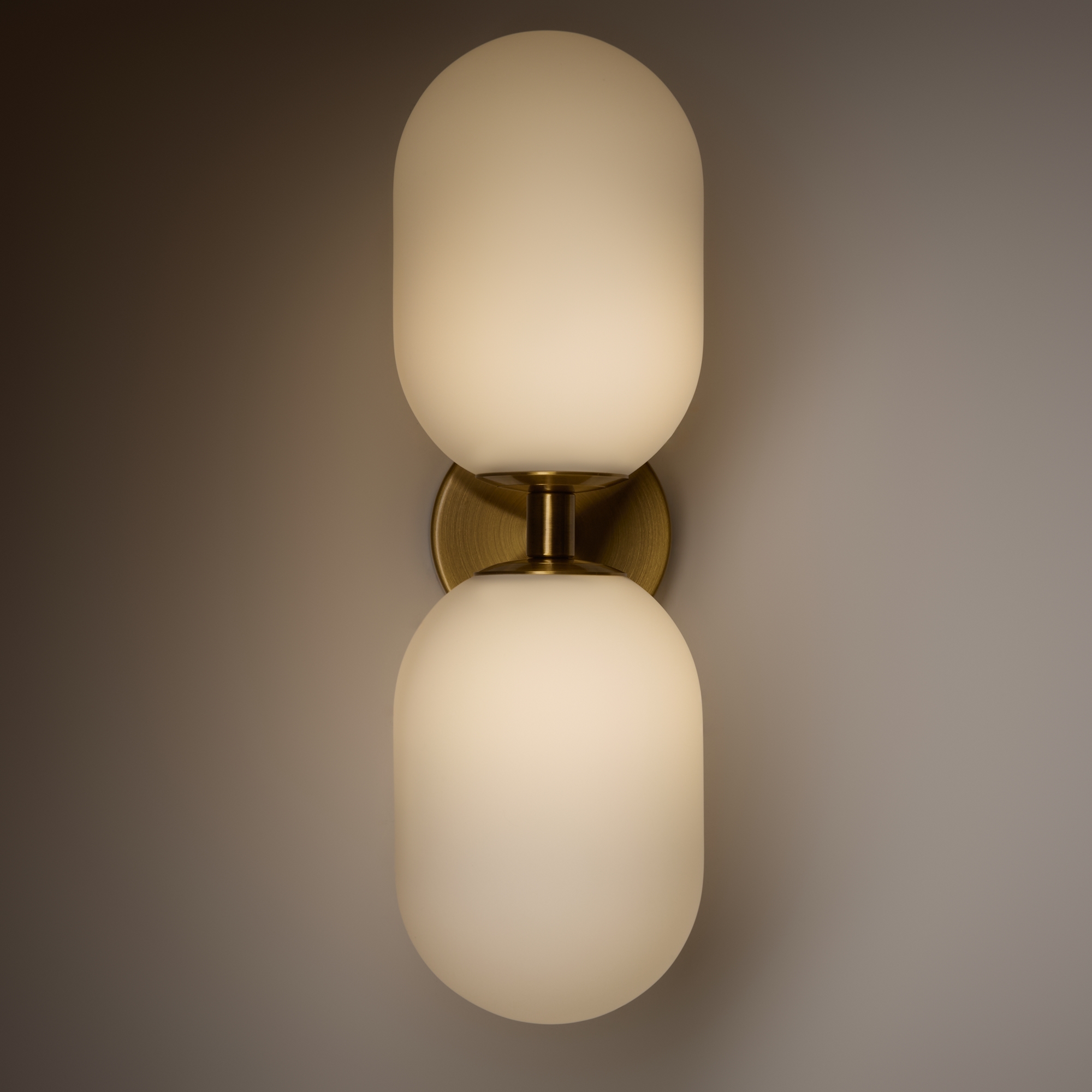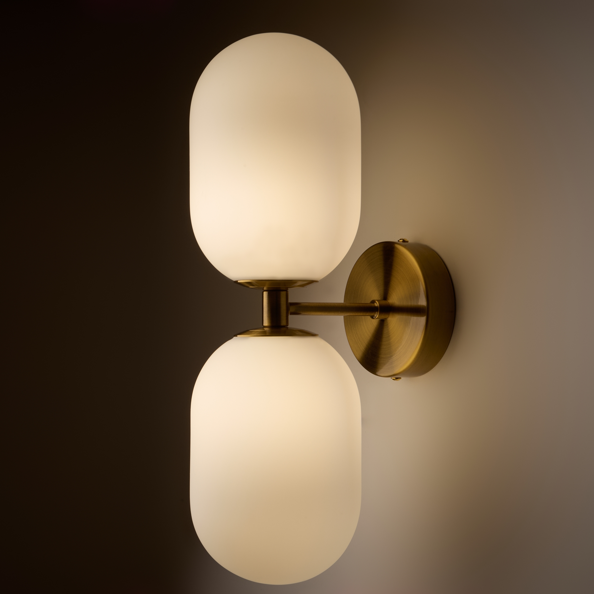 Арматура из металла цвета латуни. Плафоны овальной формы из белого матового стекла. Форма плафонов дает рассеянный свет, максимальная пропускная способность. Источник света лампа. Цоколь G9. Широкая линейка позволяет организовать комплексное освещение в едином стиле.