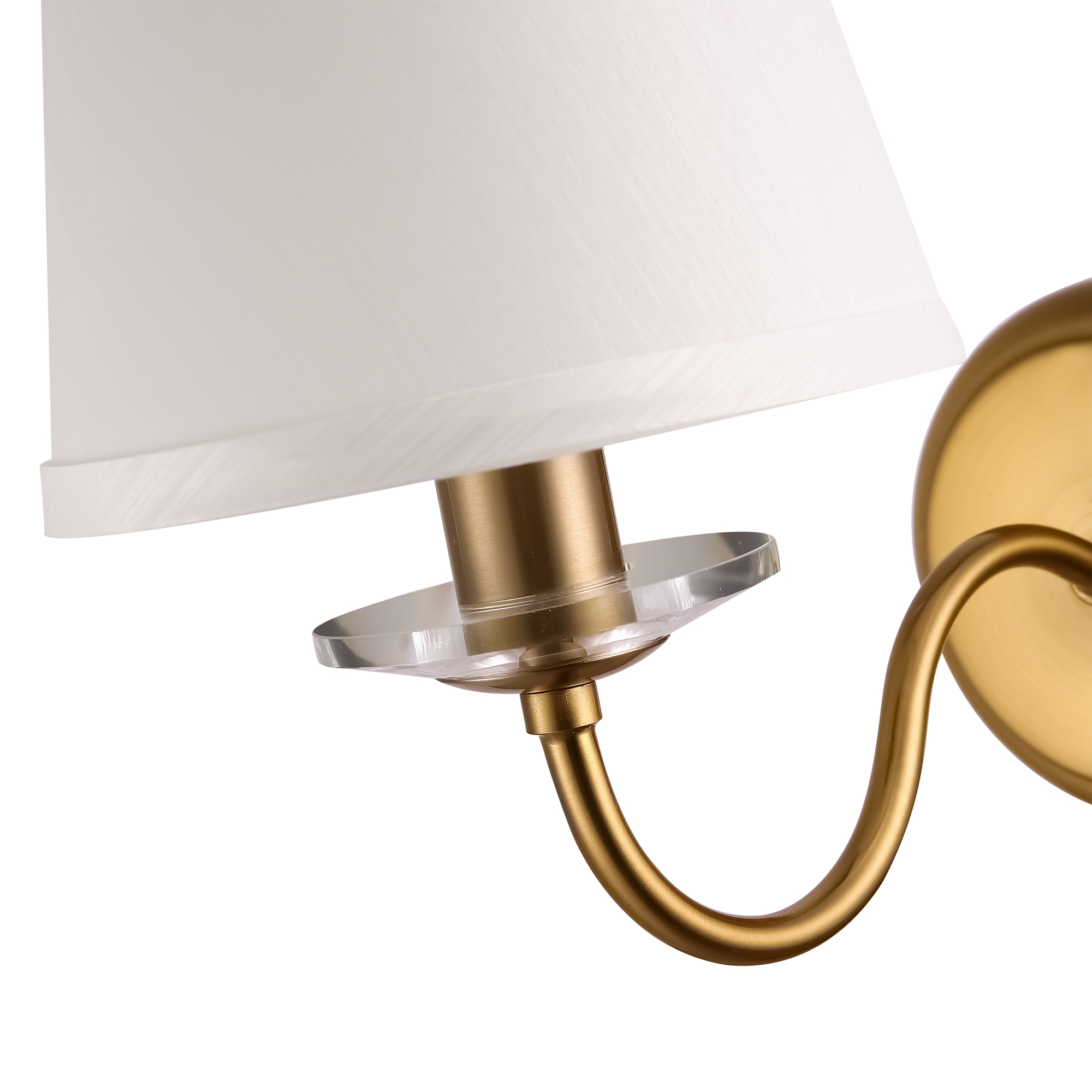 Металлическая арматура в двух оттенках на выбор: латунь и никель. Абажуры – текстиль белого цвета. Декоративные элементы из прозрачного стекла. Источник света – лампа с цоколем E14.
