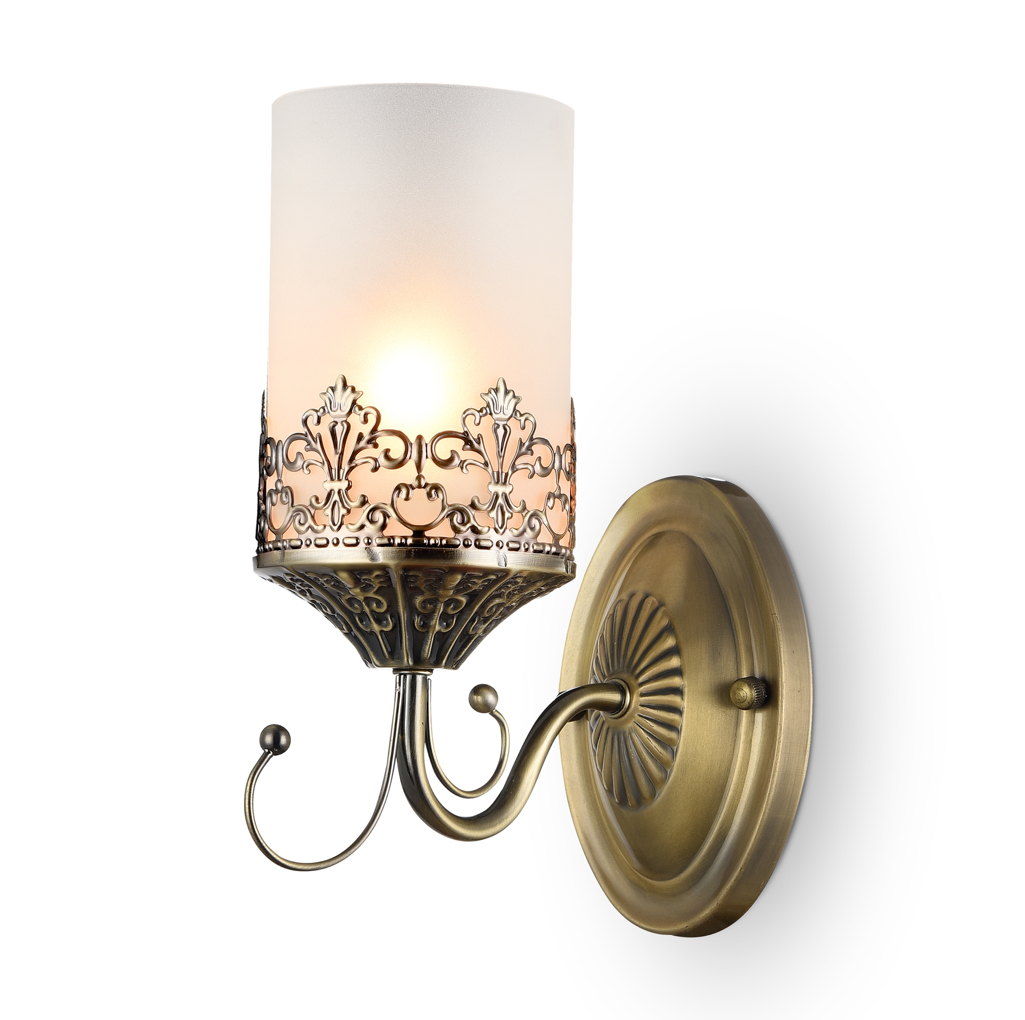 Нарядные и элегантные светильники — прекрасное решение для интерьеров в классическом стиле. Металлическая арматура окрашена в бронзовый цвет, цилиндрические плафоны из матового стекла обрамлены резным узором из металла, который перекликается с орнаментом основания. Дополняют дизайн нити из кристаллов.