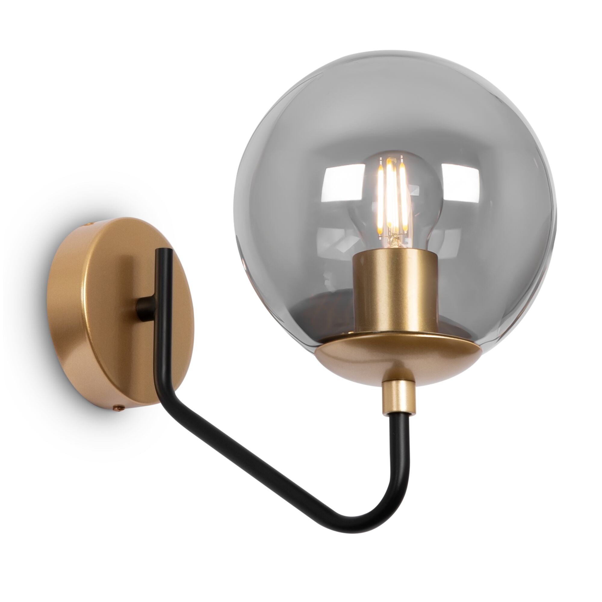 Металлическая арматура. Цвет – матовый черный с золотом. Плафоны-сферы из глянцевого стекла дымчатого оттенка. Широкий ассортимент для комплексного освещения. Источник света – лампа с цоколем E27.