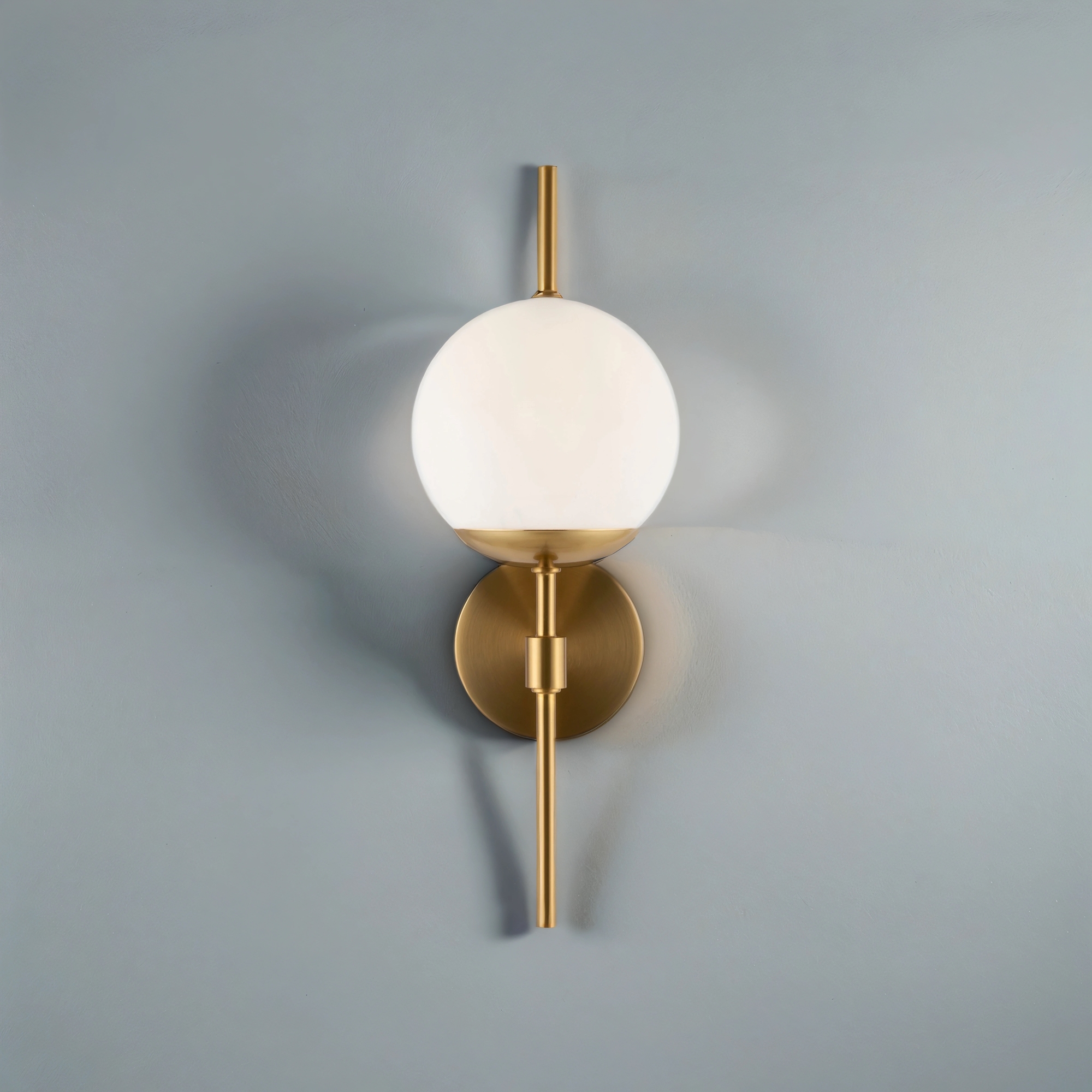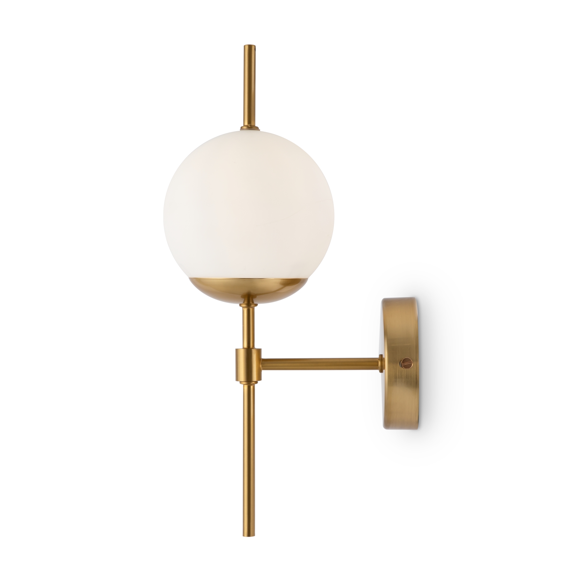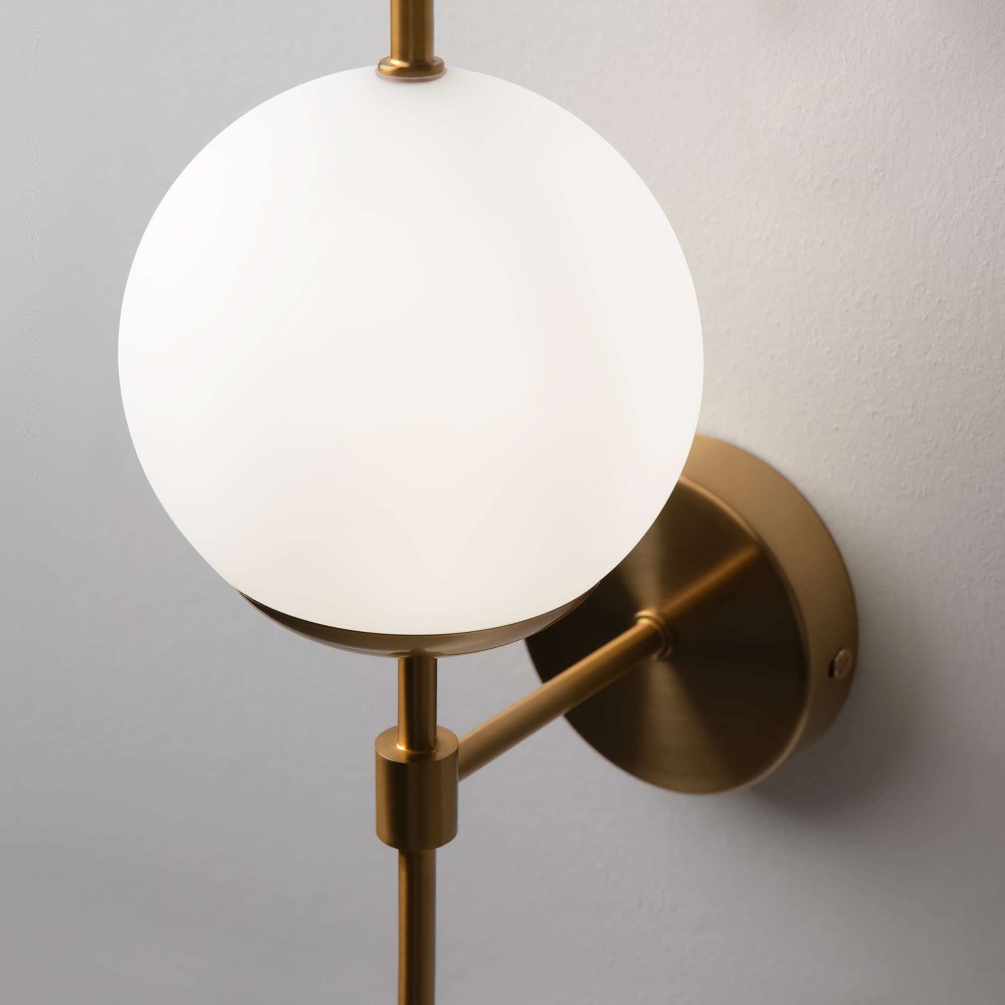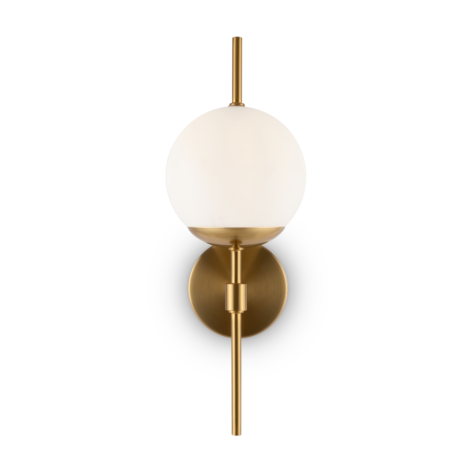 Арматура из металла. Цвет – латунь. Плафоны – матовое белое стекло. Трендовая геометрия в дизайне: арматура «пронизывает» плафоны-сферы. Источник света – лампа с цоколем Е27.