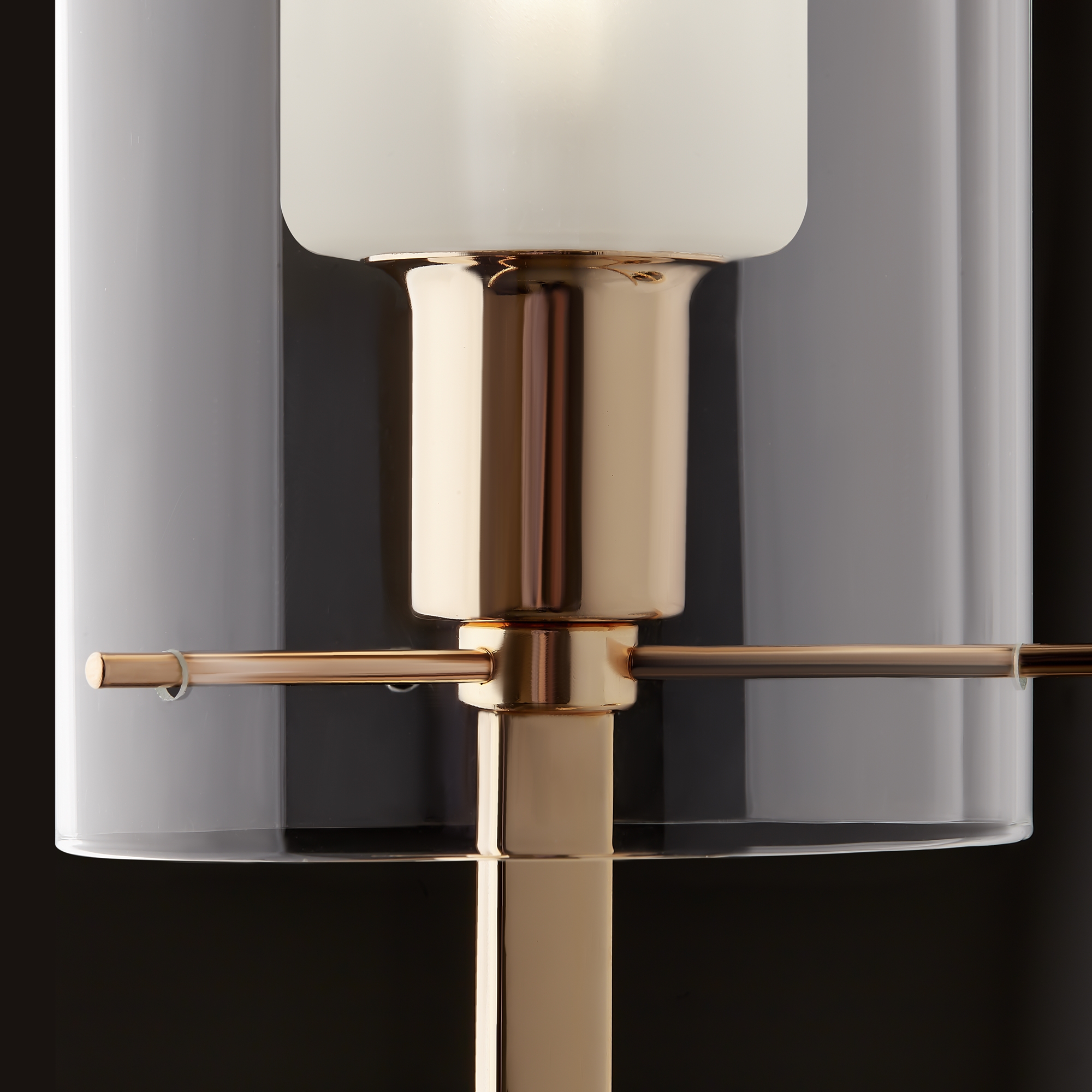 Металлическая арматура оттенка французского золота. Двойные стеклянные плафоны: матовые внутри, прозрачные снаружи. Лаконичная геометрия с симметричным расположением элементов. Источник света – лампа с цоколем E14.