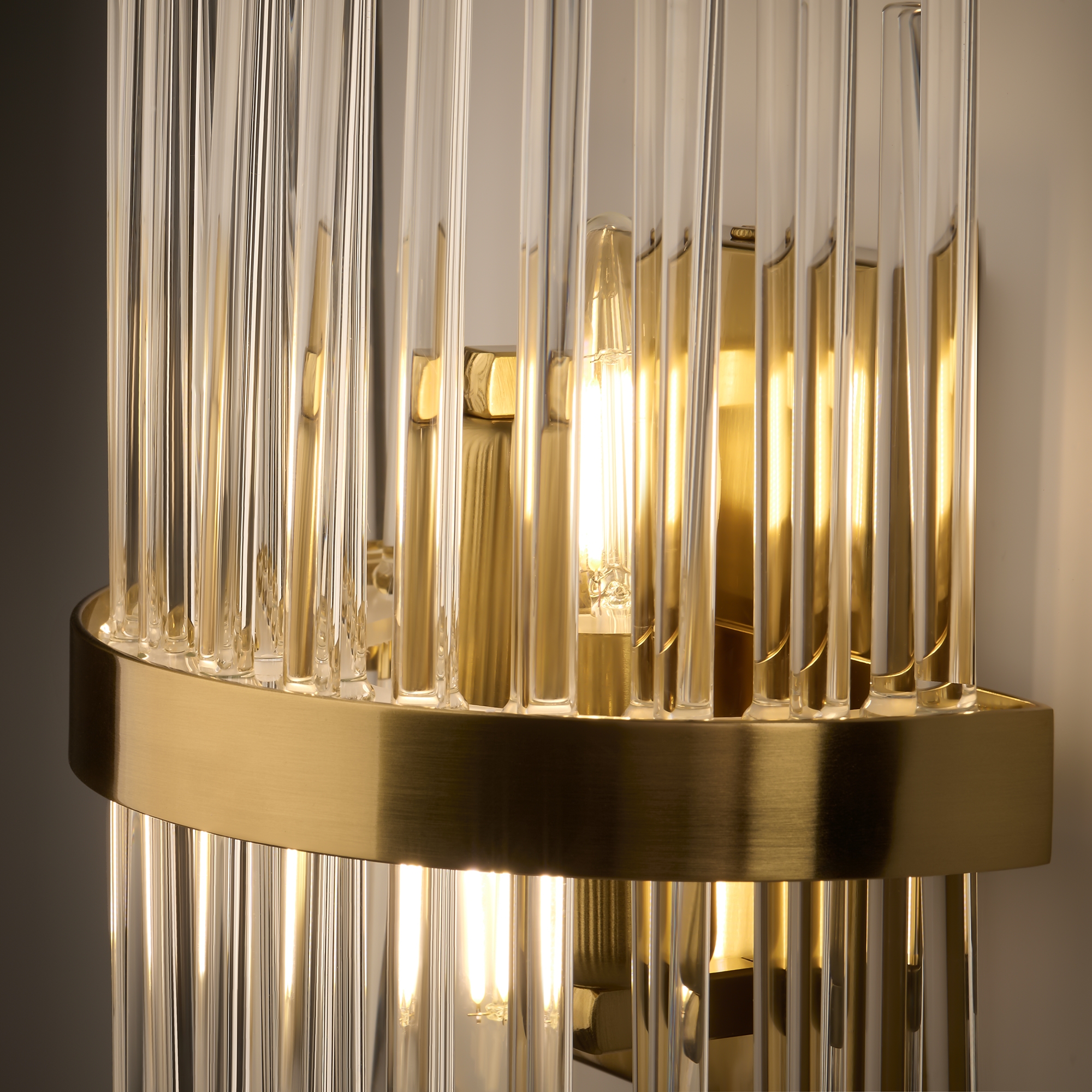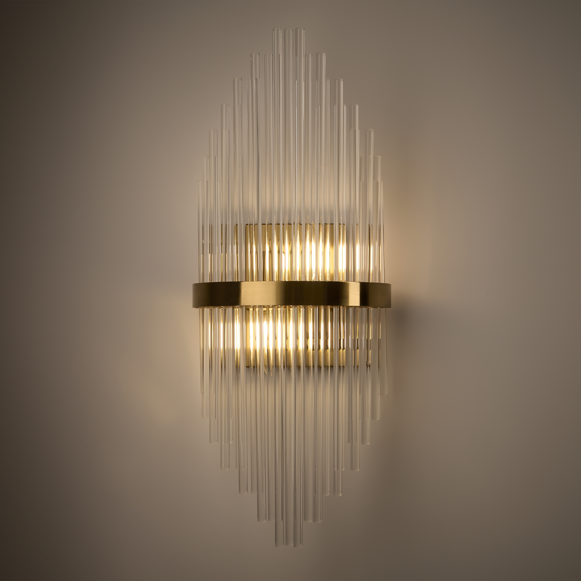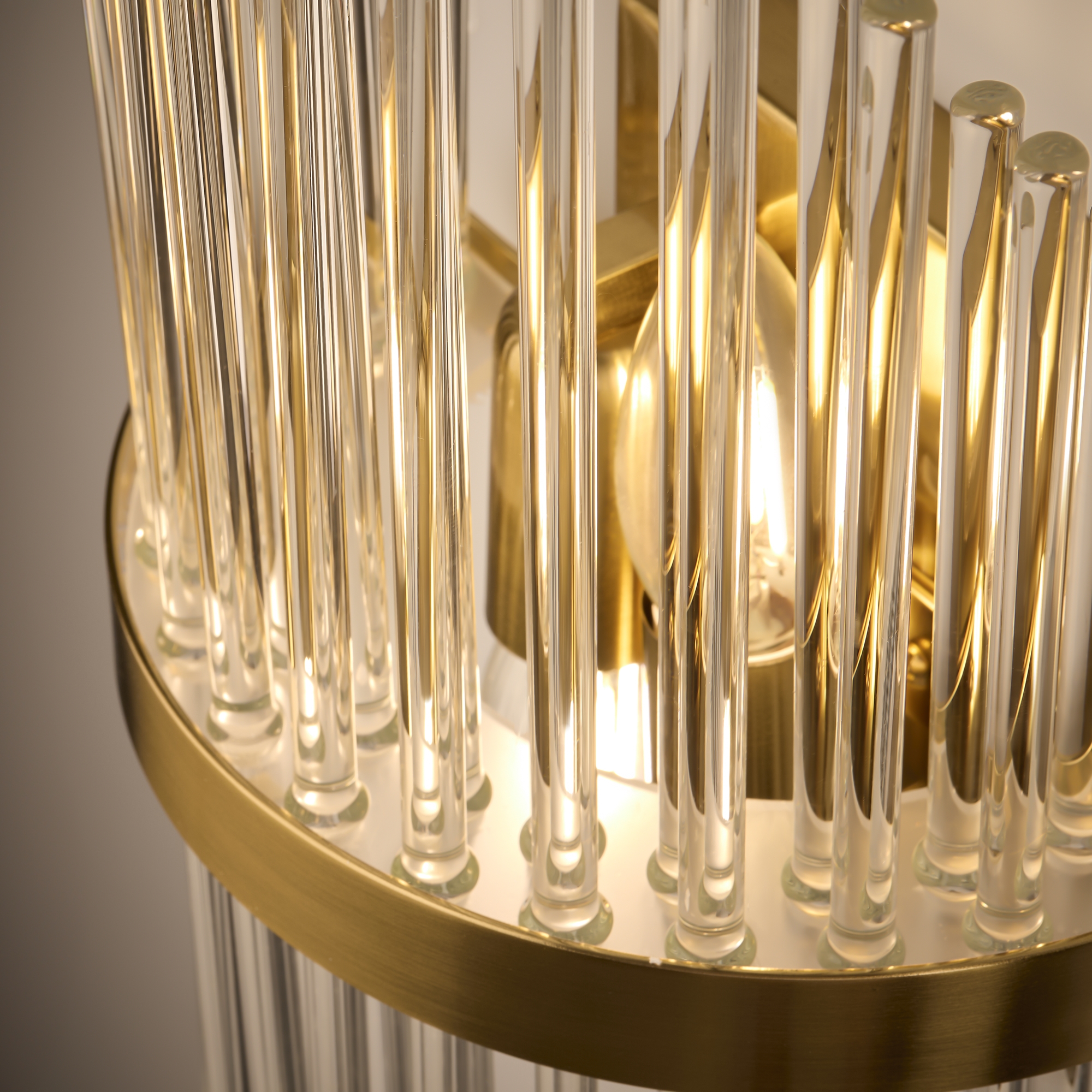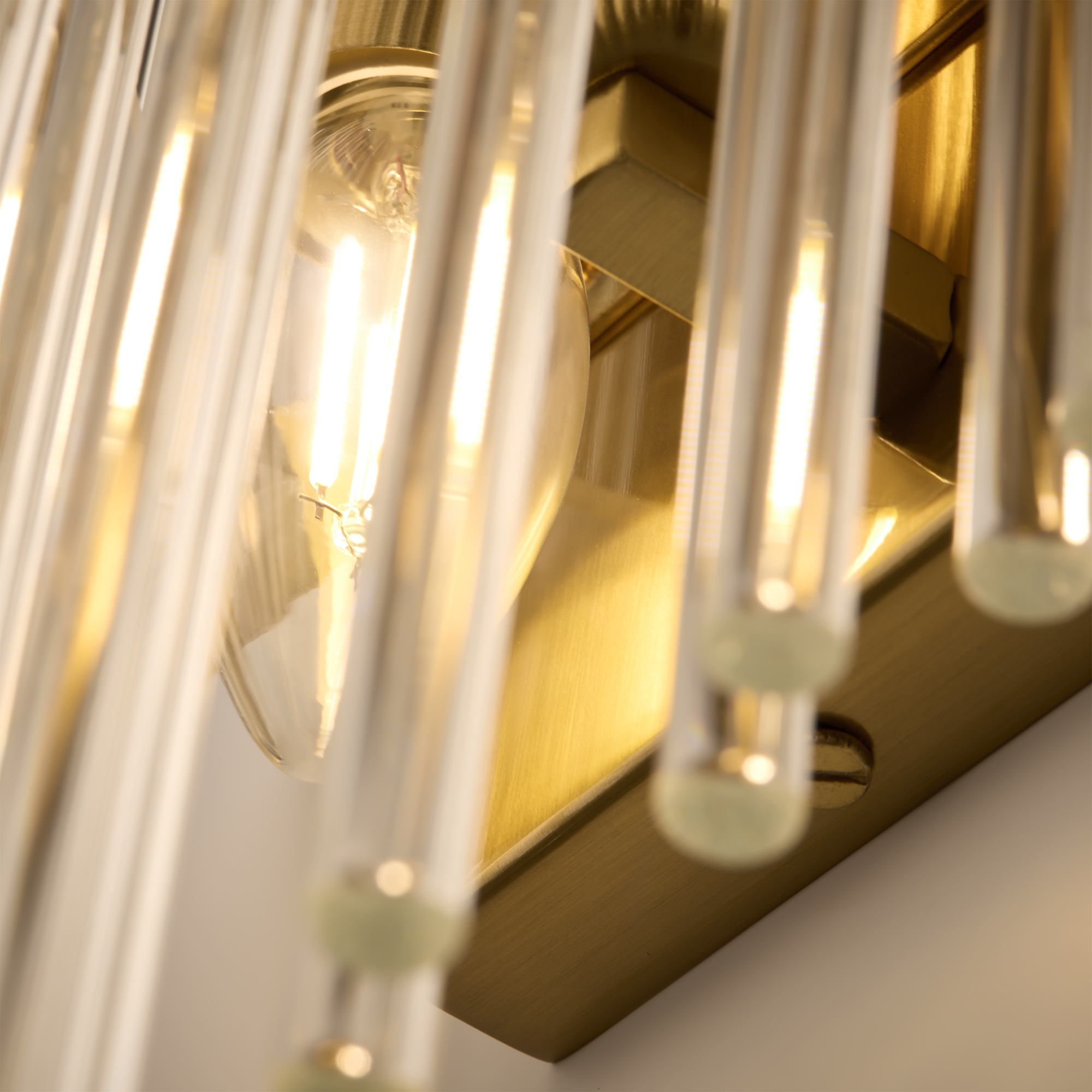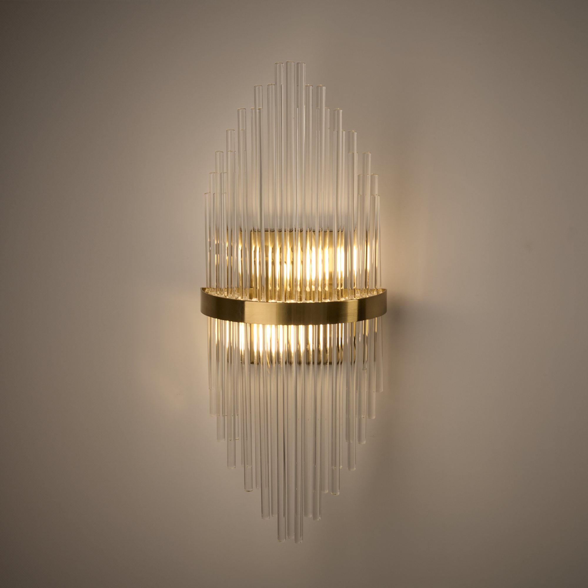 Металлическая арматура, цвет - латунь. Декоративные элементы - прозрачные стеклянные трубки, обрамленные в металлической кольцо в тон арматуре. Источник света - лампа с цоколем Е14.