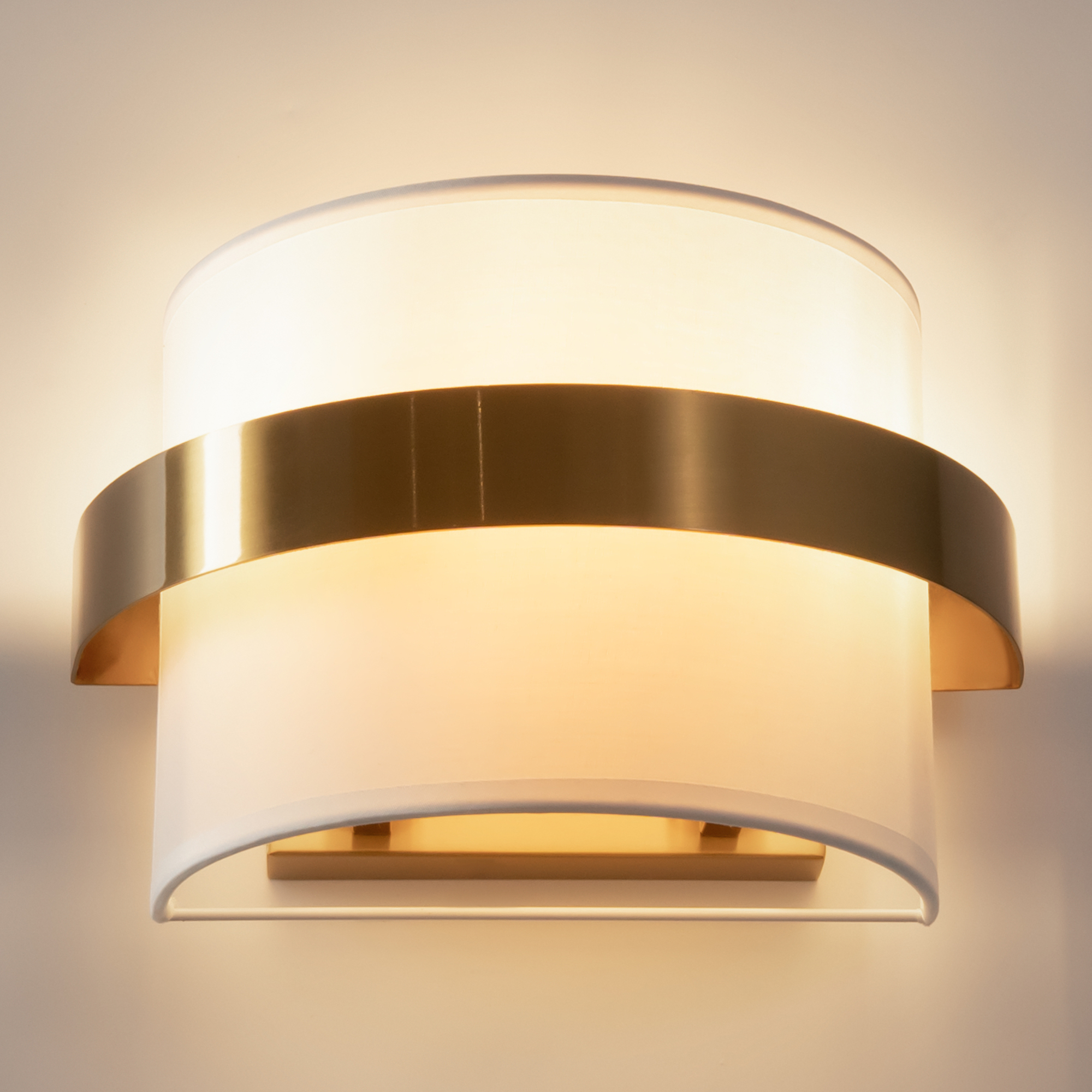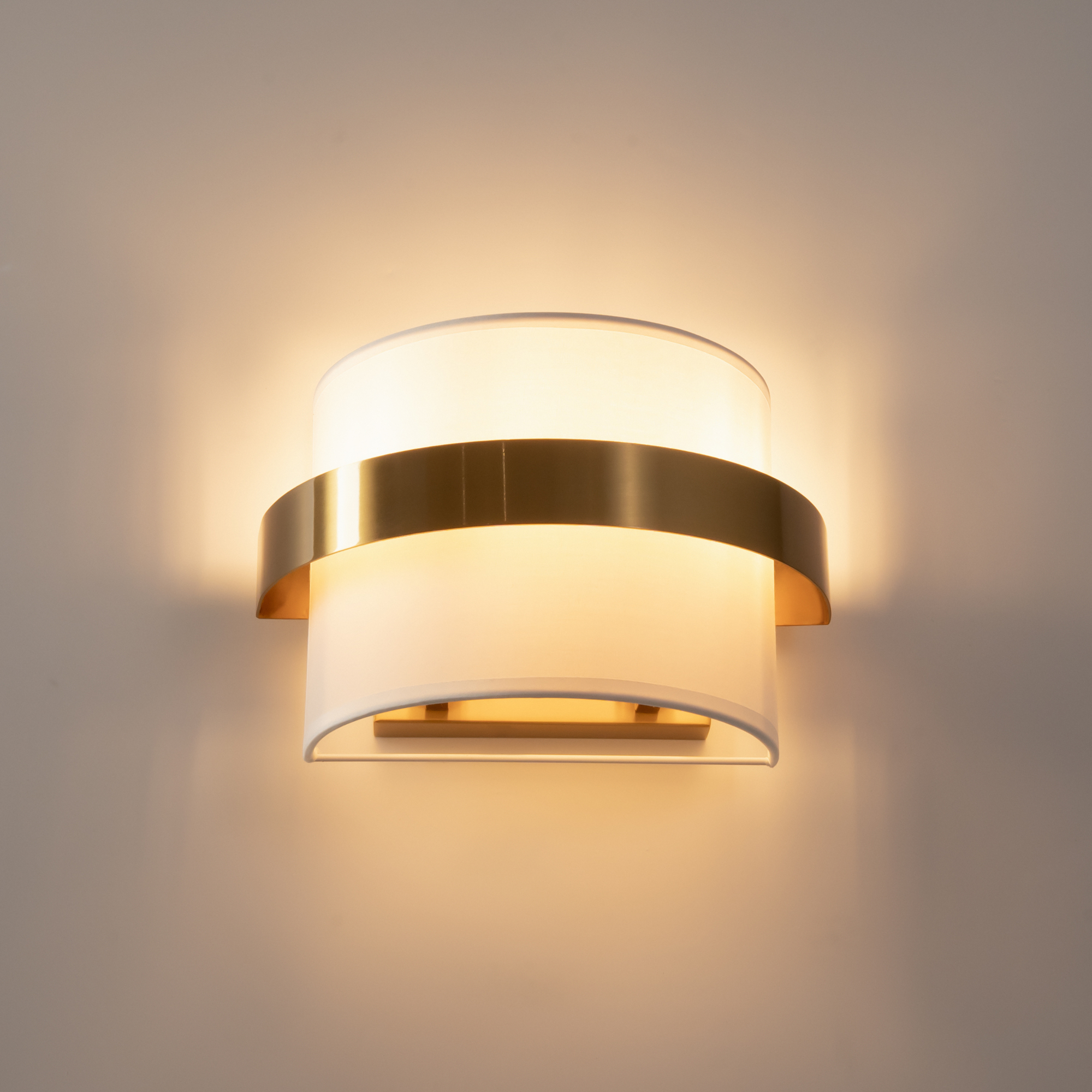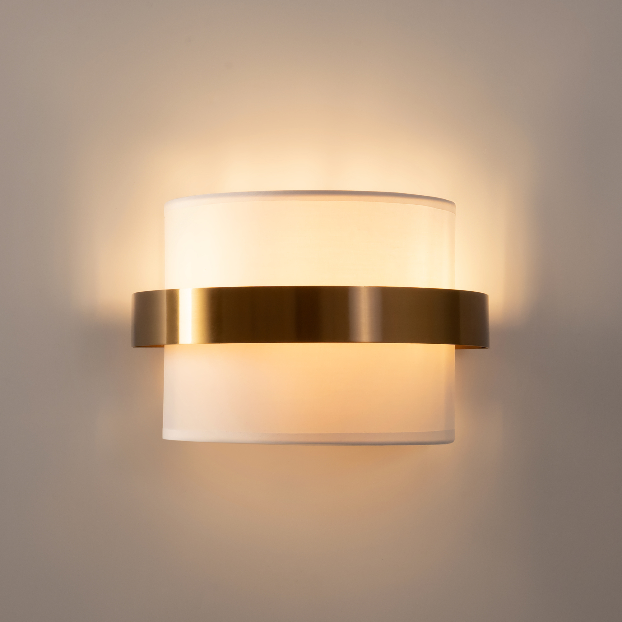 Цилиндрической формы абажур из ткани белого цвета. Декоративная парящая окантовка из металла в цвет арматуры. Регулируется по длине. Компактные размеры подходят для низких потолков и небольших интерьеров. Металлическая арматура, цвет - латунь и никель. Источник света — лампа с цоколем Е14, E27 и для настенного бра дополнительный LED с температурой свечения 3000 K.