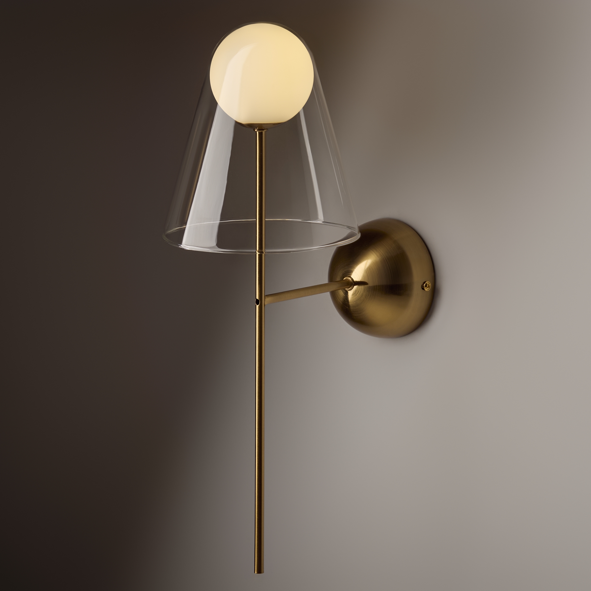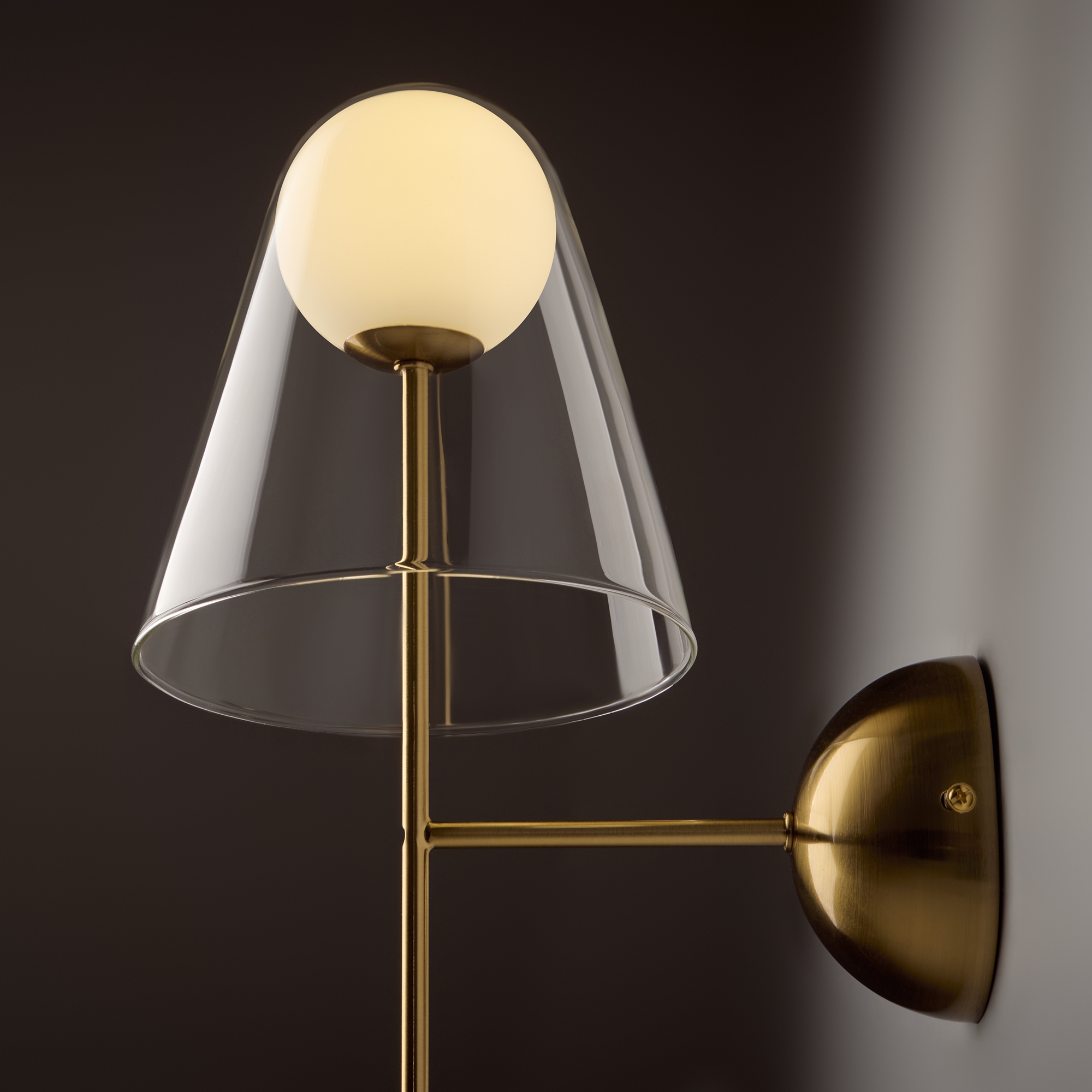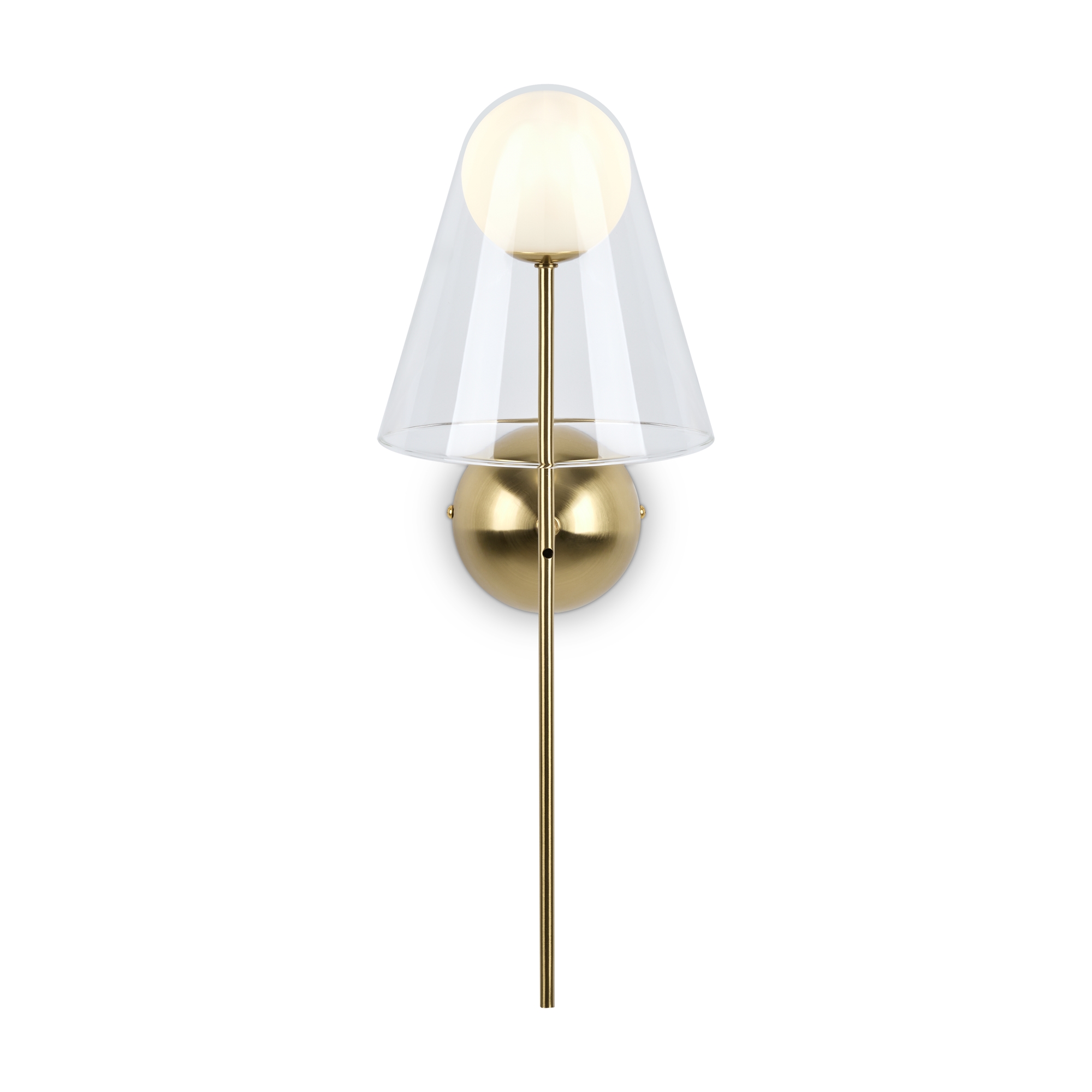 Арматура — металл, цвет — латунь. Двойные плафоны из стекла. Внешний — прозрачный в форме конуса плавно обрамляет контуры внутреннего матового сферического плафона. Свежий взгляд в дизайне на комбинацию форм и фактур. Источником света служит лампа с цоколем G9.