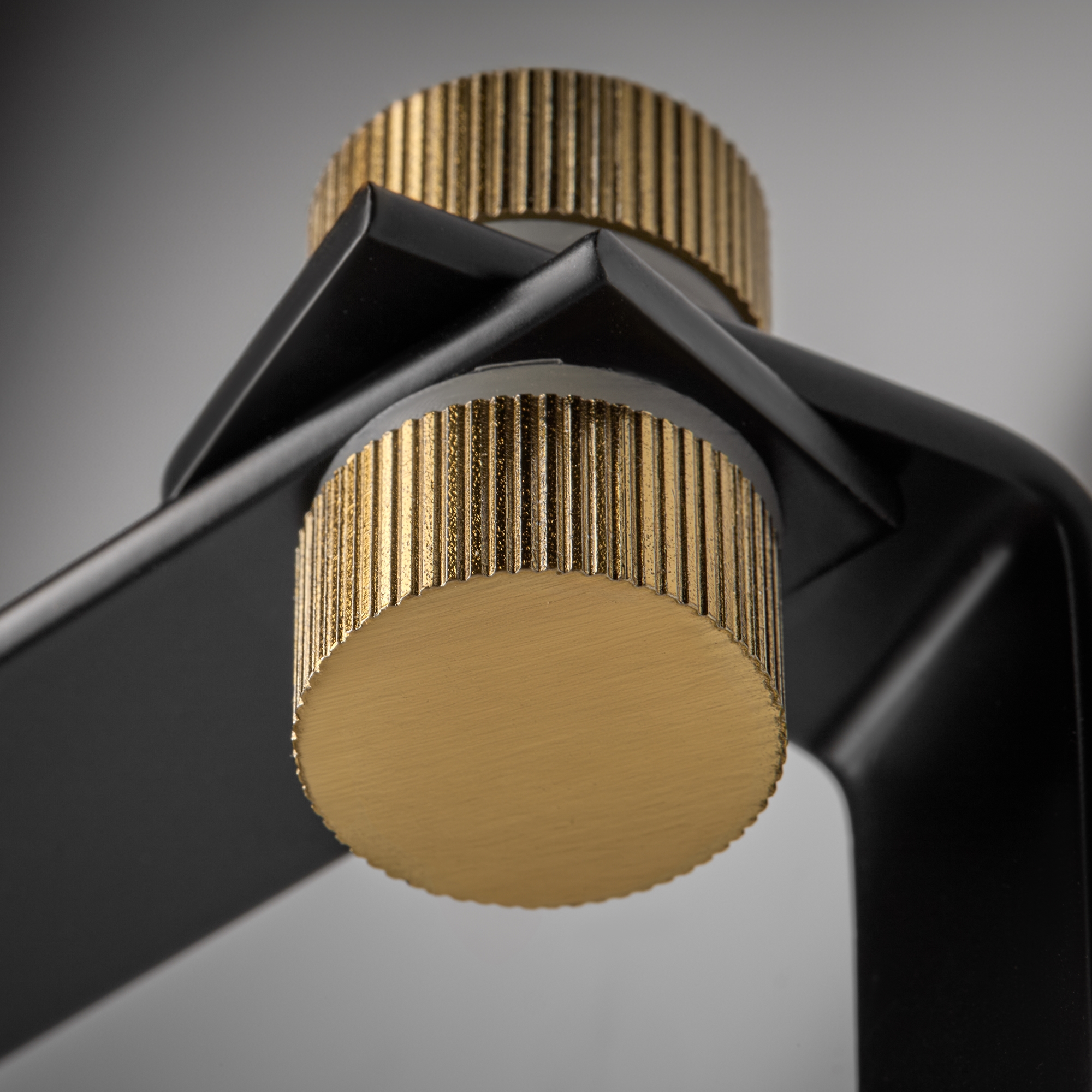 Металлический корпус, цвет — чёрный. Декоративные металлические элементы цвета латунь. Функциональный корпус с поворотным механизмом. Дизайн на стыке современности и ретро стиля. Источник света — лампа с цоколем Е27.