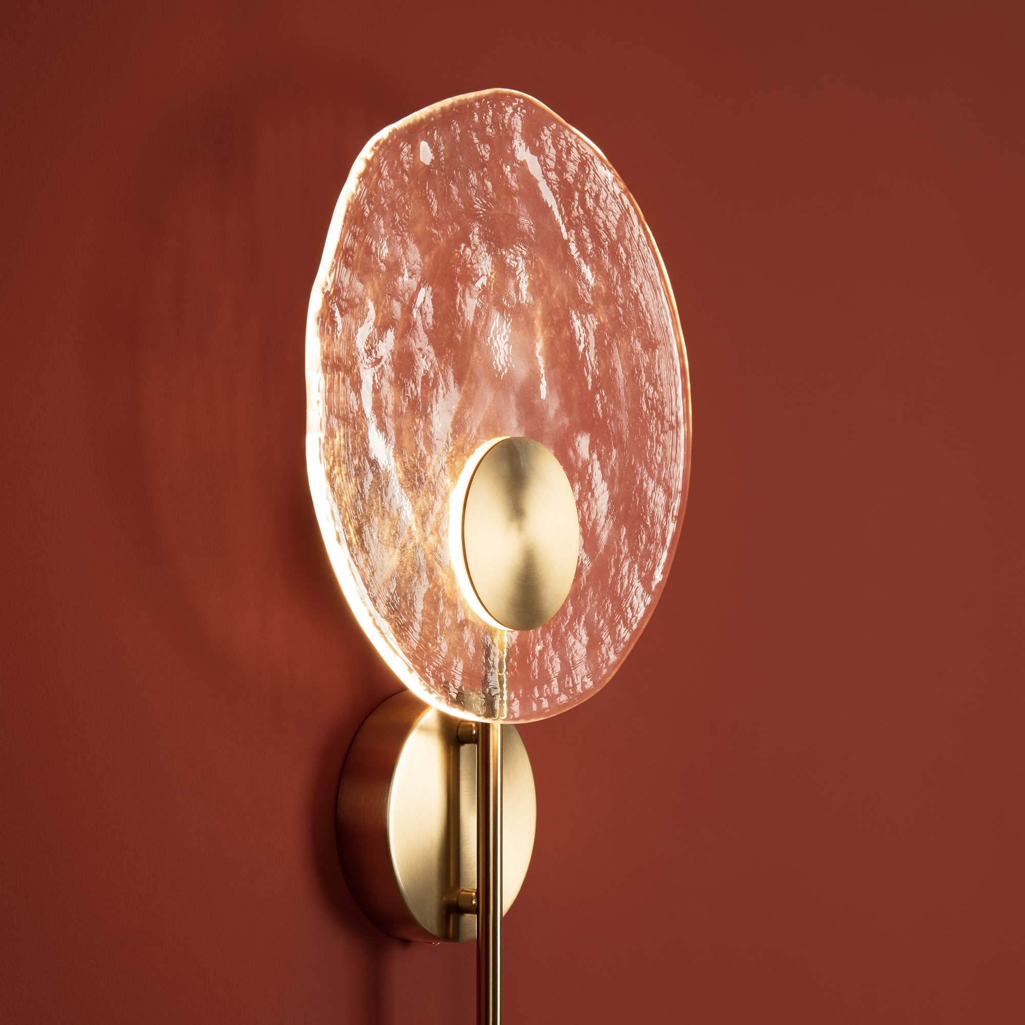 Материал арматуры — металл, цвет — латунь. Настенные светильники оснащены LED-источником света с цветовой температурой 2700К. Уникальное стекло ручного производства обеспечивает равномерное свечение всей поверхности плафона. Для достижения наилучшего светового эффекта рекомендуется использовать в сочетании с основными источниками света.