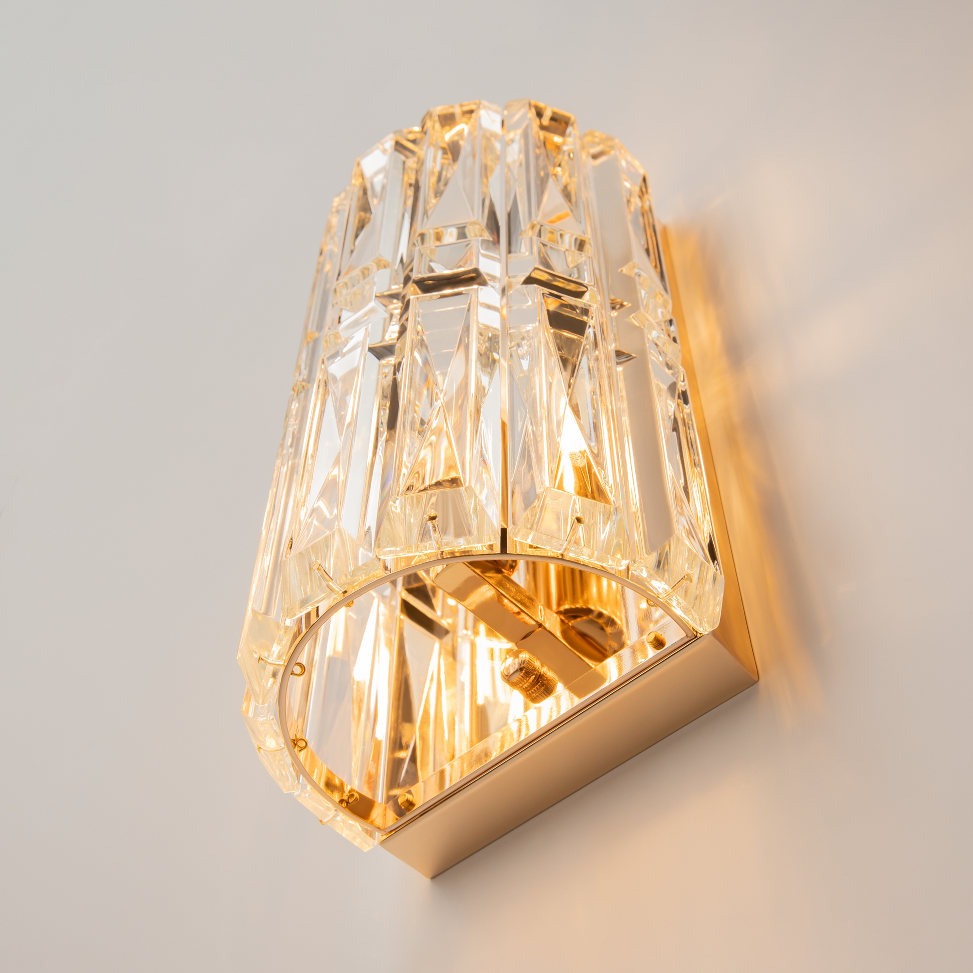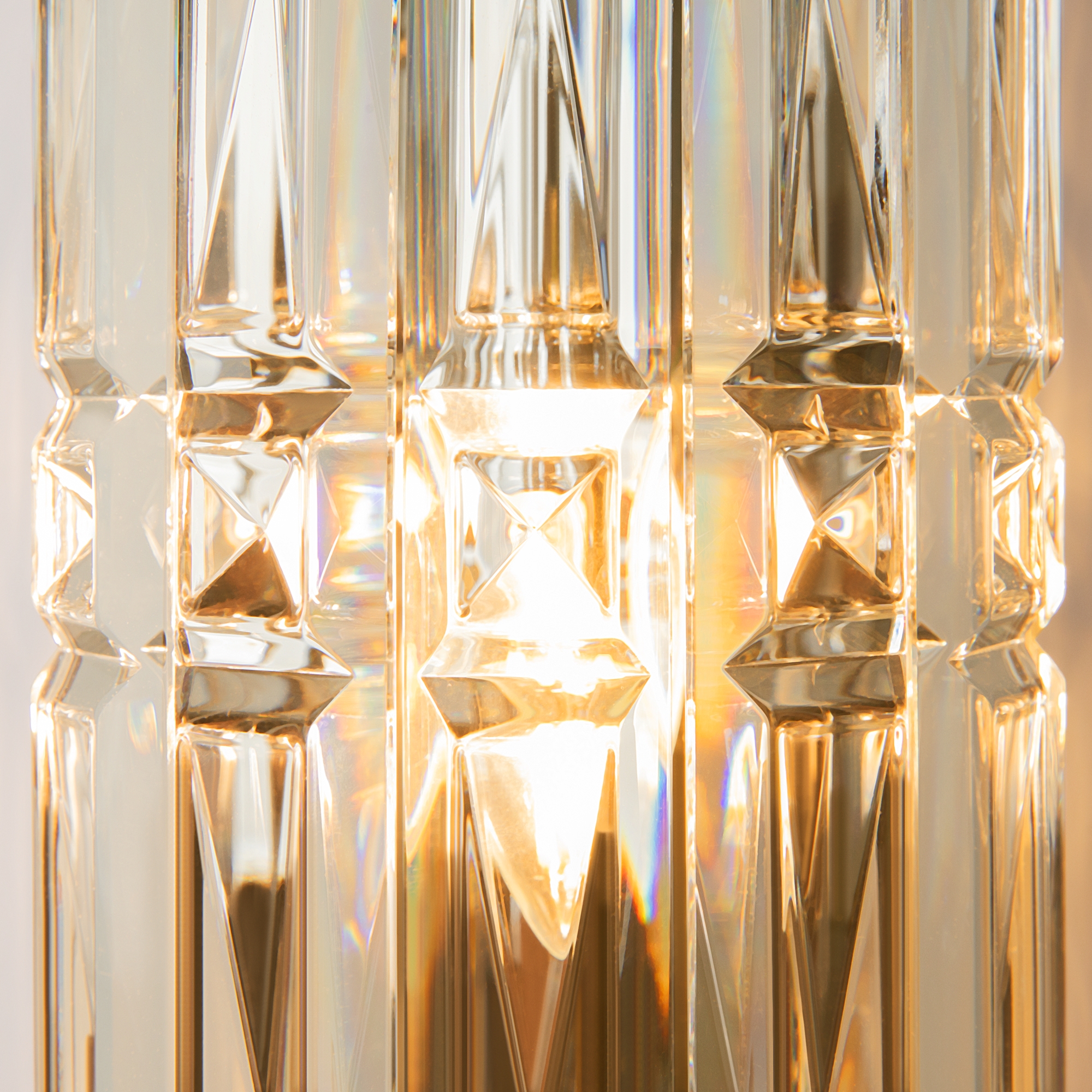 Материал арматуры – металл, оттенки – хром и золото. Декор – прозрачные стек лянные кристаллы. Архитектурная огранка декоративных элементов. Цоколь Е14.