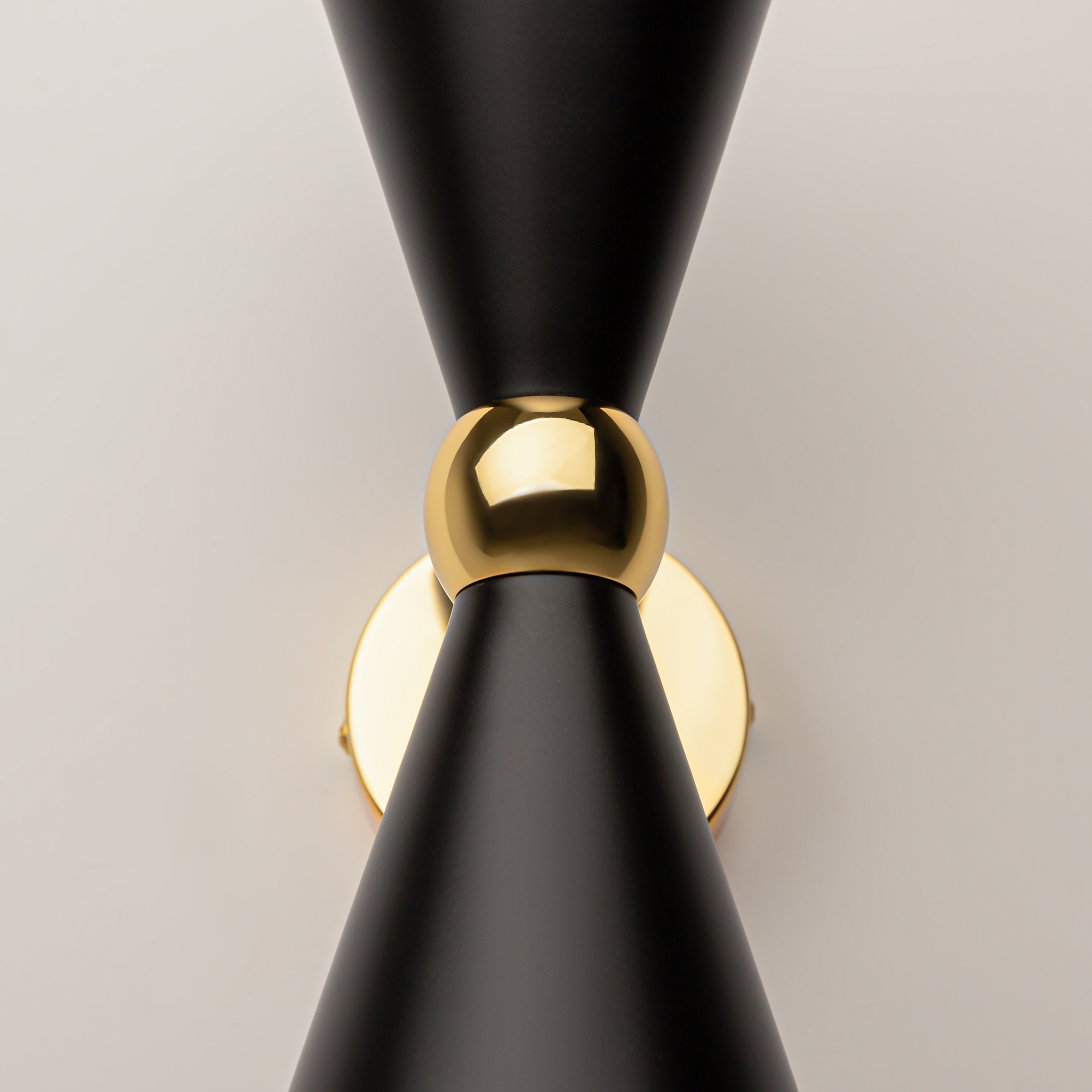 Материал арматуры - металл, оттенок – золото. Металлические плафоны изнутри окрашены в золотой цвет. Внешняя сторона в двух вариантах оттенков: черный и белый. Поворотный механизм, рожки вращаются.