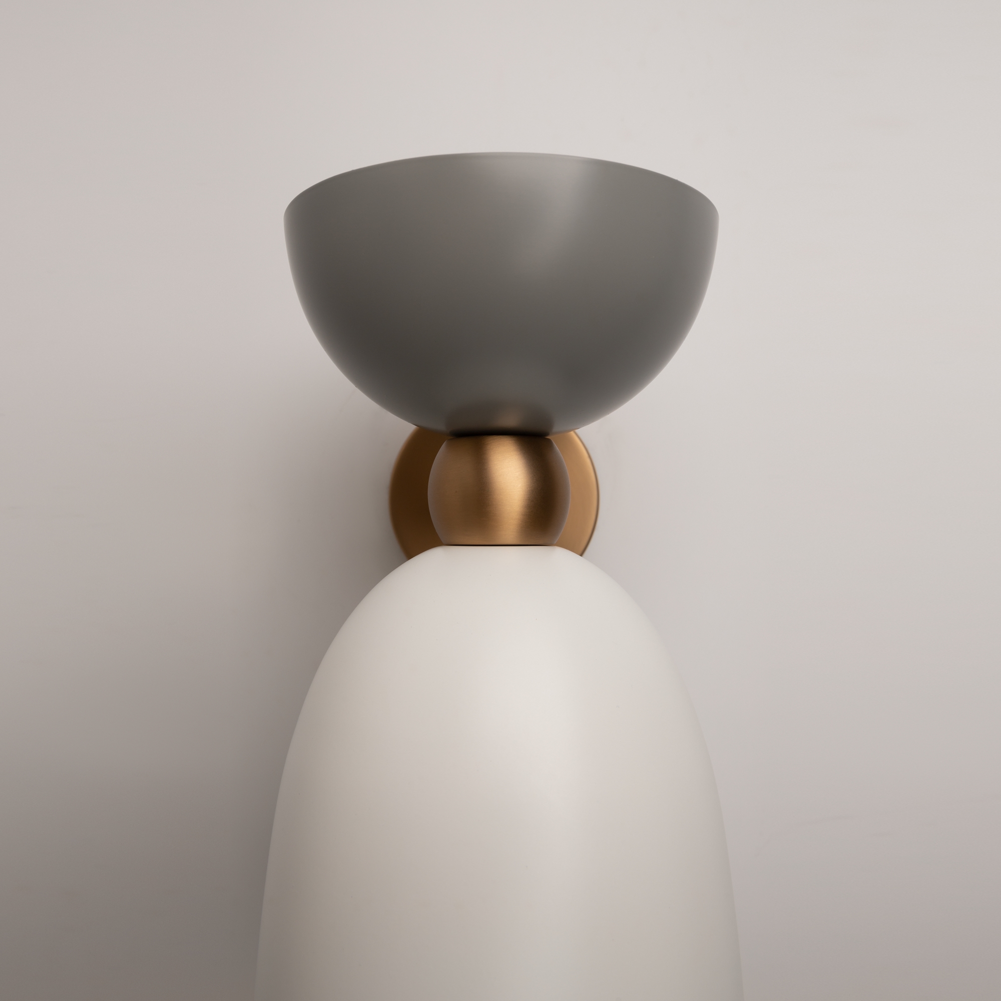 Арматура из металла, оттенки – латунь, белый. Металлические плафоны в двух цветовых решениях: белый + серый, голубой + бирюзовый. Оригинальная форма колокольчика. Поворотный механизм в плафонах для направленной подсветки.