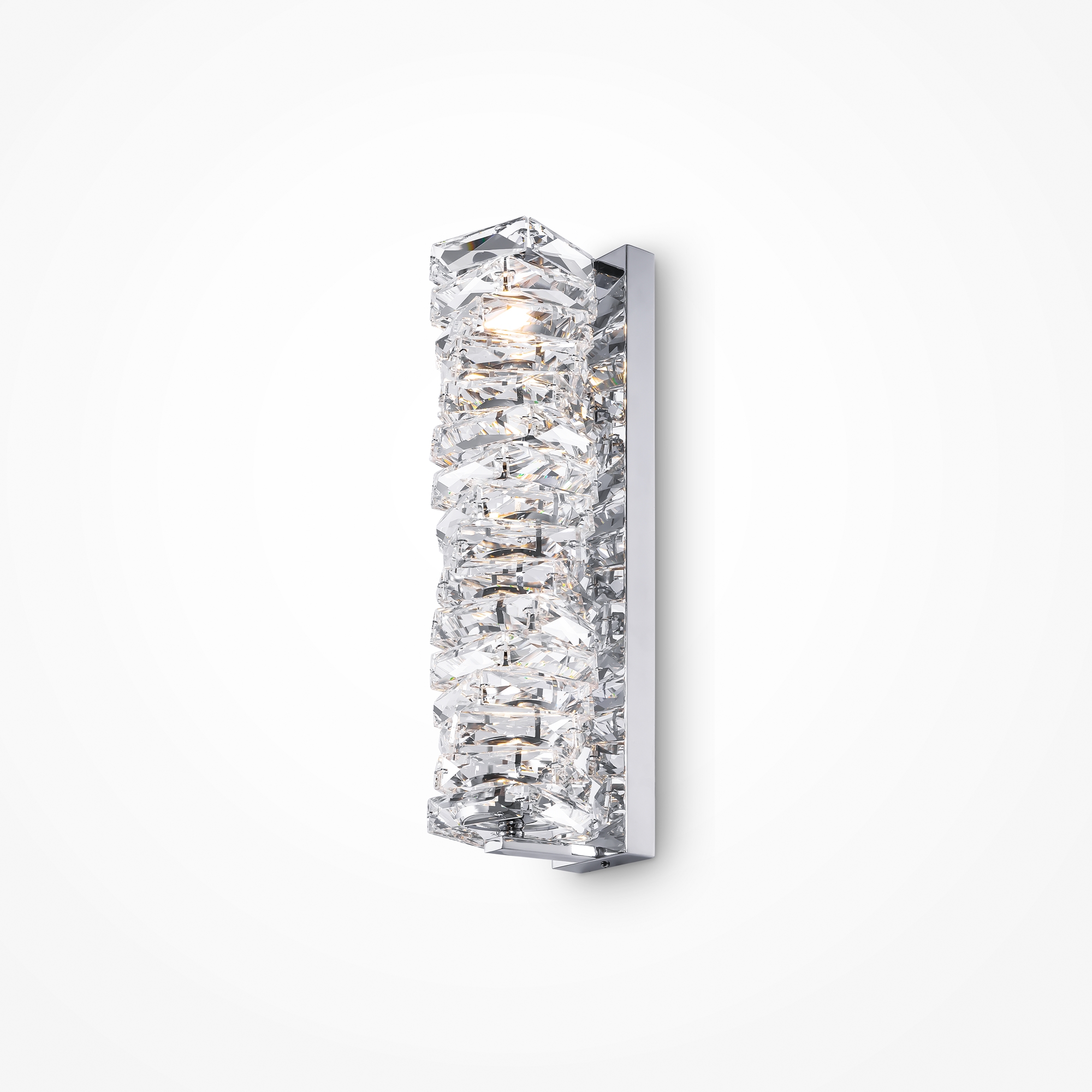 Арматура из нержавеющей стали и стекла, цвет арматуры – хром. Фактурный плафон с декором из стеклянного массива. Источник света – светодиоды с цветовой температурой 3000К.