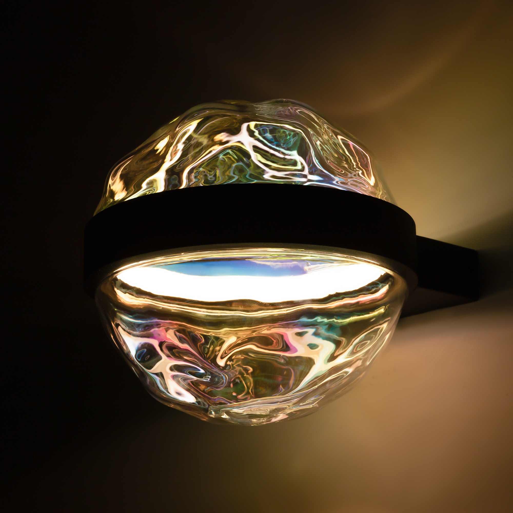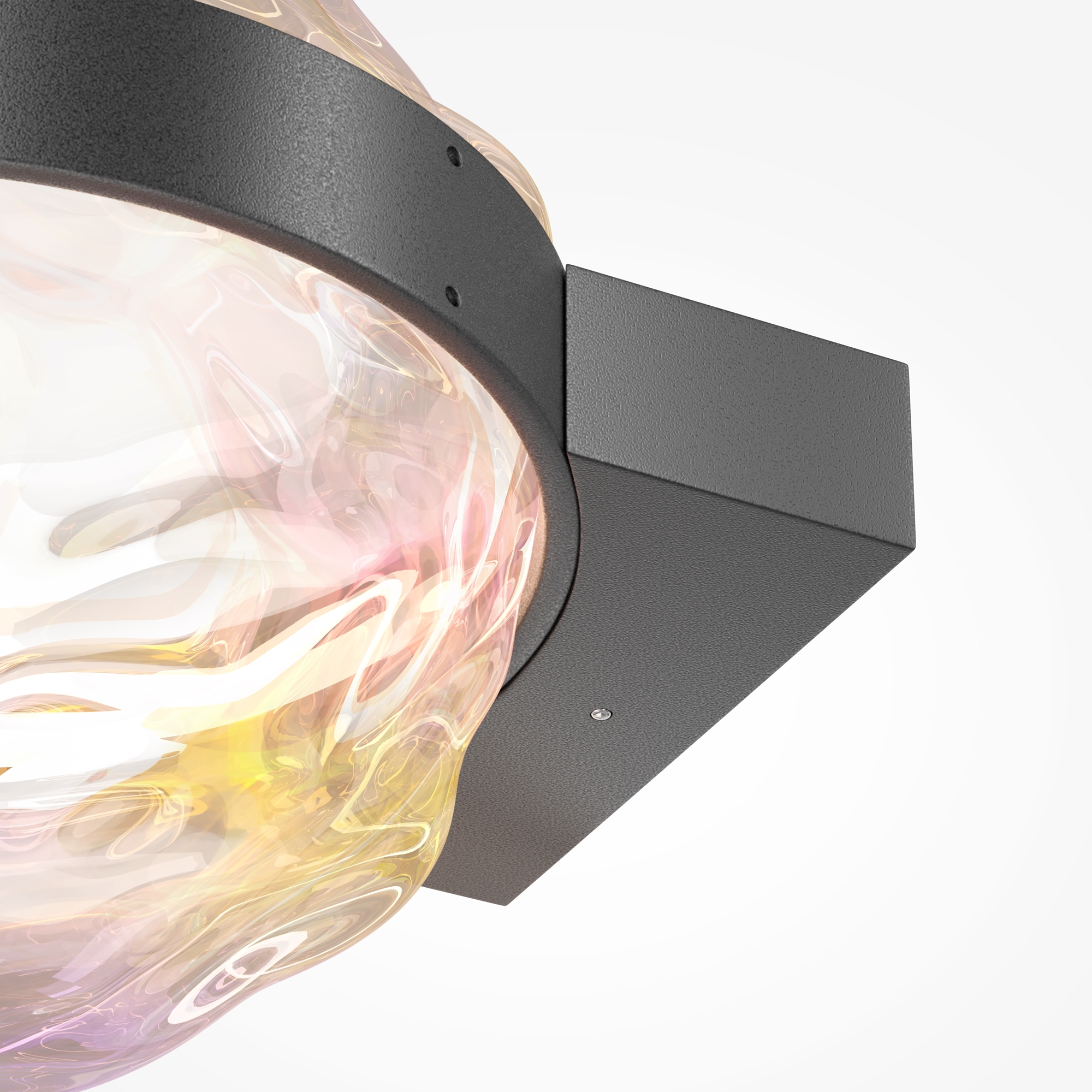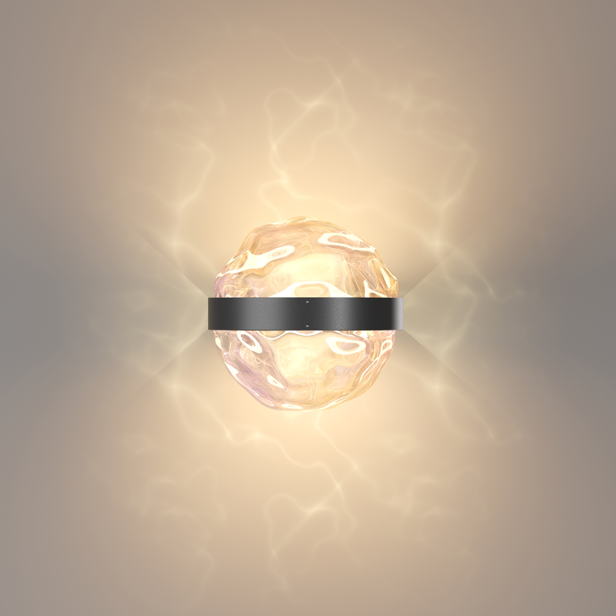 Цвет арматуры — черный. Материал арматуры — металл. Материал плафона — литое стекло с эффектом «multicolor». Оригинальный волнообразный дизайн плафона. LED-элемент в форме кольца вокруг плафона. Цветовая температура 3000К. Яркие плавные световые орнаменты на окружающих поверхностях. Подвесные модели (одиночные и композиция из трех) и бра. Значительный световой поток благодаря мощной LED-ленте с матовым рассеивателем.