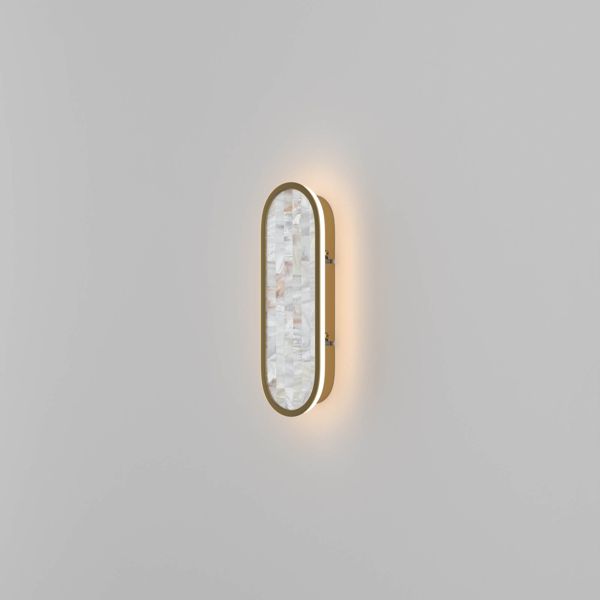 В серии представлены настенные светильники двух размеров и двух поколений. Декоративная мозаика из натурального перламутра играет нежнейшими бликами. Контраст текстур — переливы перламутра и матовая поверхность металла цвета латуни. LED-лента под акриловым рассеивателем создаёт ореол на стене. Предусмотрено трехступенчатое переключение температуры света через вкл-выкл (2700-3000-4000K), позволяющее создавать желаемую атмосферу. Эффектно светильники смотрятся и в комбинации друг с другом.
