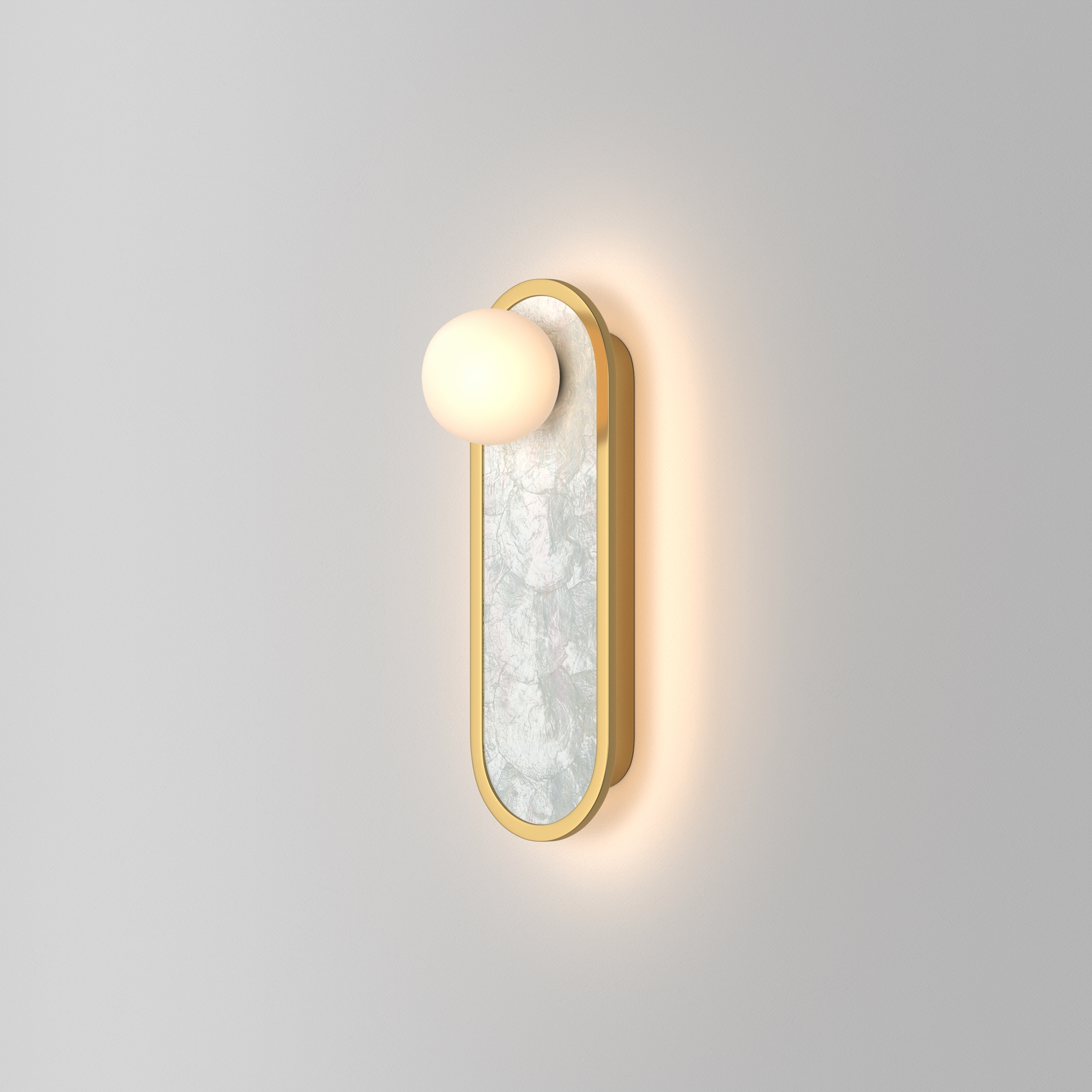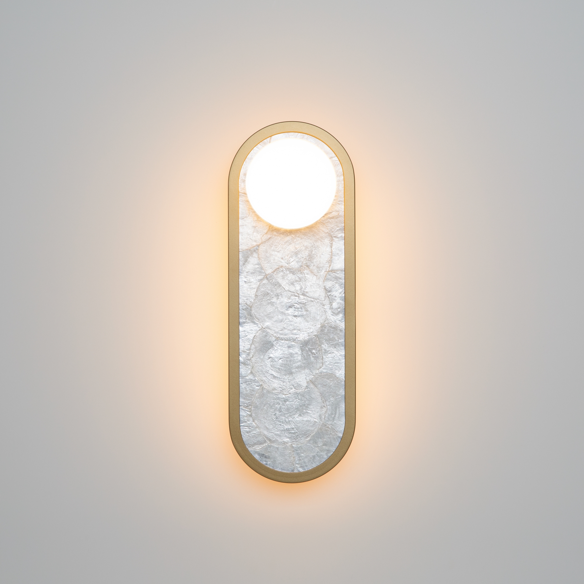 В серии представлены настенные светильники двух размеров и двух поколений. Декоративная мозаика из натурального перламутра играет нежнейшими бликами. Контраст текстур — переливы перламутра и матовая поверхность металла цвета латуни. LED-лента под акриловым рассеивателем создаёт ореол на стене. Предусмотрено трехступенчатое переключение температуры света через вкл-выкл (2700-3000-4000K), позволяющее создавать желаемую атмосферу. Эффектно светильники смотрятся и в комбинации друг с другом.
