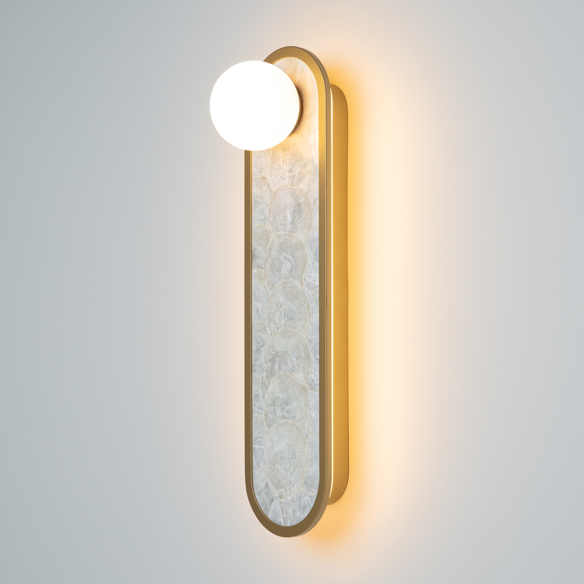 В серии представлены настенные светильники двух размеров и двух поколений. Декоративная мозаика из натурального перламутра играет нежнейшими бликами. Контраст текстур — переливы перламутра и матовая поверхность металла цвета латуни. LED-лента под акриловым рассеивателем создаёт ореол на стене. Предусмотрено трехступенчатое переключение температуры света через вкл-выкл (2700-3000-4000K), позволяющее создавать желаемую атмосферу. Эффектно светильники смотрятся и в комбинации друг с другом.