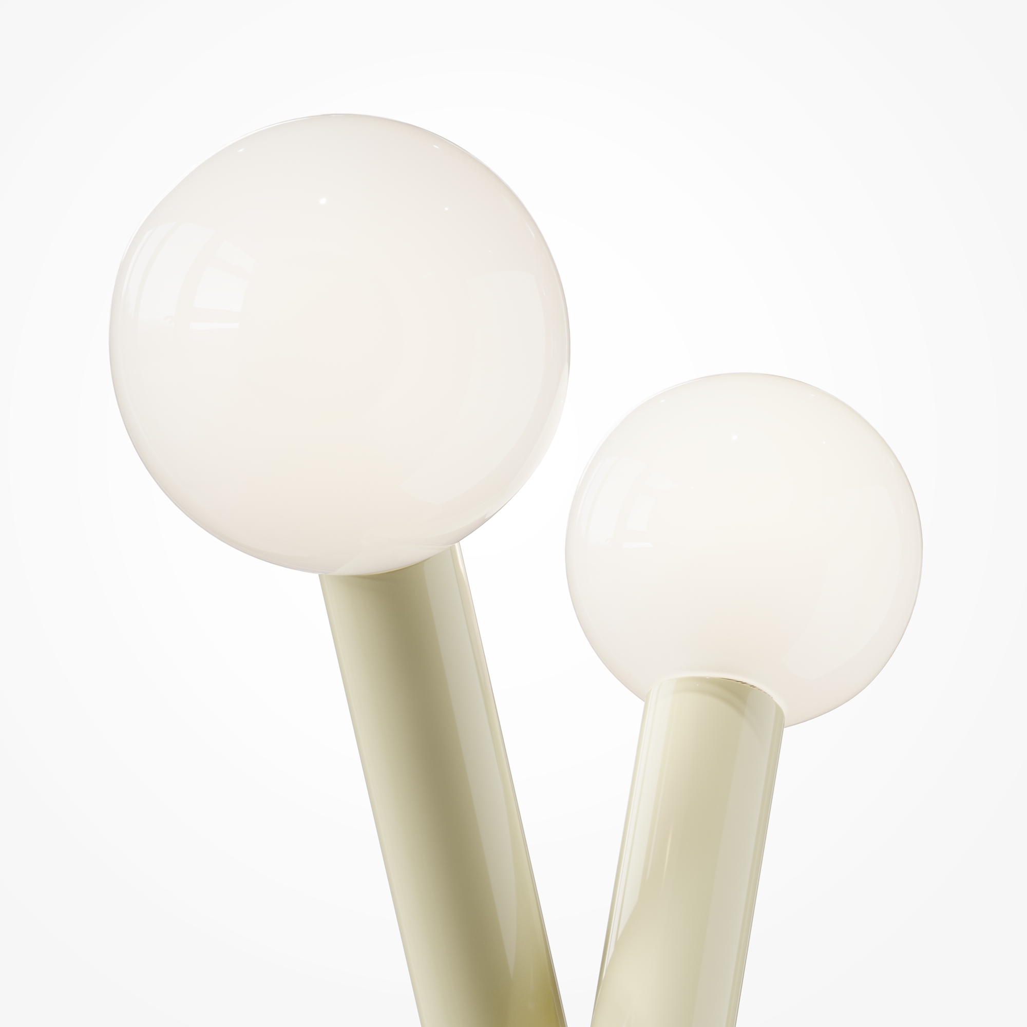 Серия отличается массивной металлической арматурой с органическими изгибами. Представлена в четырех цветовых вариантах: матовый черный, глянцевые латунь, платина и молочно-бежевый. Плафон выполнен из глянцевого белого стекла, скрывающего сменный источник света с цоколем G9. Светильники создают выразительные акценты в интерьере, подходят как для одиночного размещения, так и для создания сложных инсталляций. Рекомендуется для пространств, где важную роль играет художественная составляющая.
