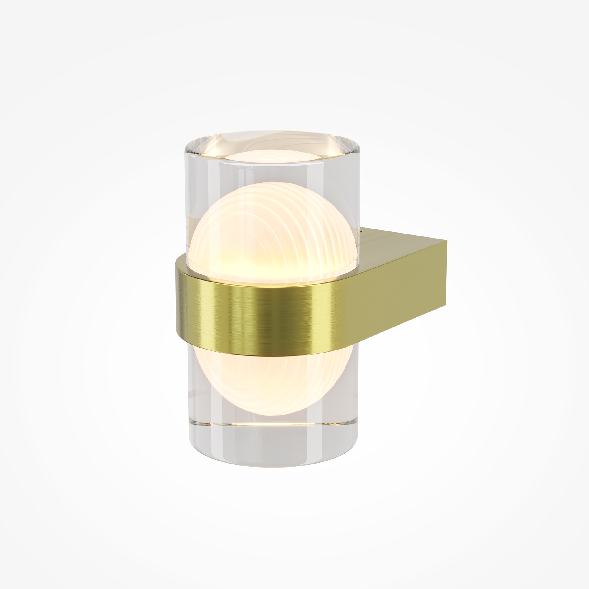 Плафоны из литого стекла, в котором изнутри вырезана и заматирована полусфера. Металлическое основание в цвете сатинированной латуни. Шестигранники вместо стандартных монтажных болтов устраняют визуальный шум. Стеклянные элементы можно вращать, меняя рисунок светового узора. Бра на два плафона можно закрепить вертикально или горизонтально, а модель с одним плафоном использовать как настенный или накладной потолочный светильник. Мягкий ореол света обеспечивает LED-источник (3000К).