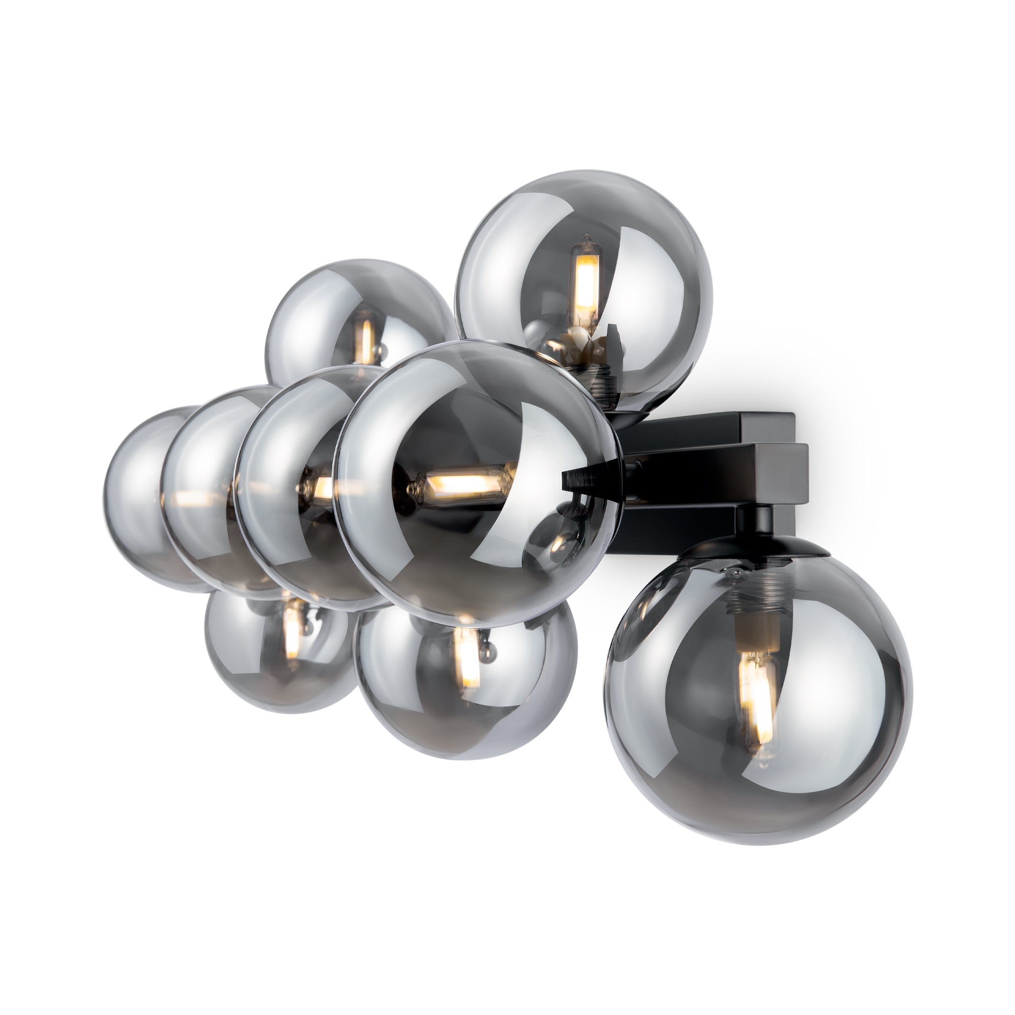 Металлическая арматура в четырех цветах: матовый черный, хром, золото, латунь. Плафоны — выдувное стекло. Цвета — дымчатый, янтарный, коньячный. Дизайн с имитацией молекулярной структуры. Высота подвесных светильников регулируется тросом. Лампа с цоколем G9.
