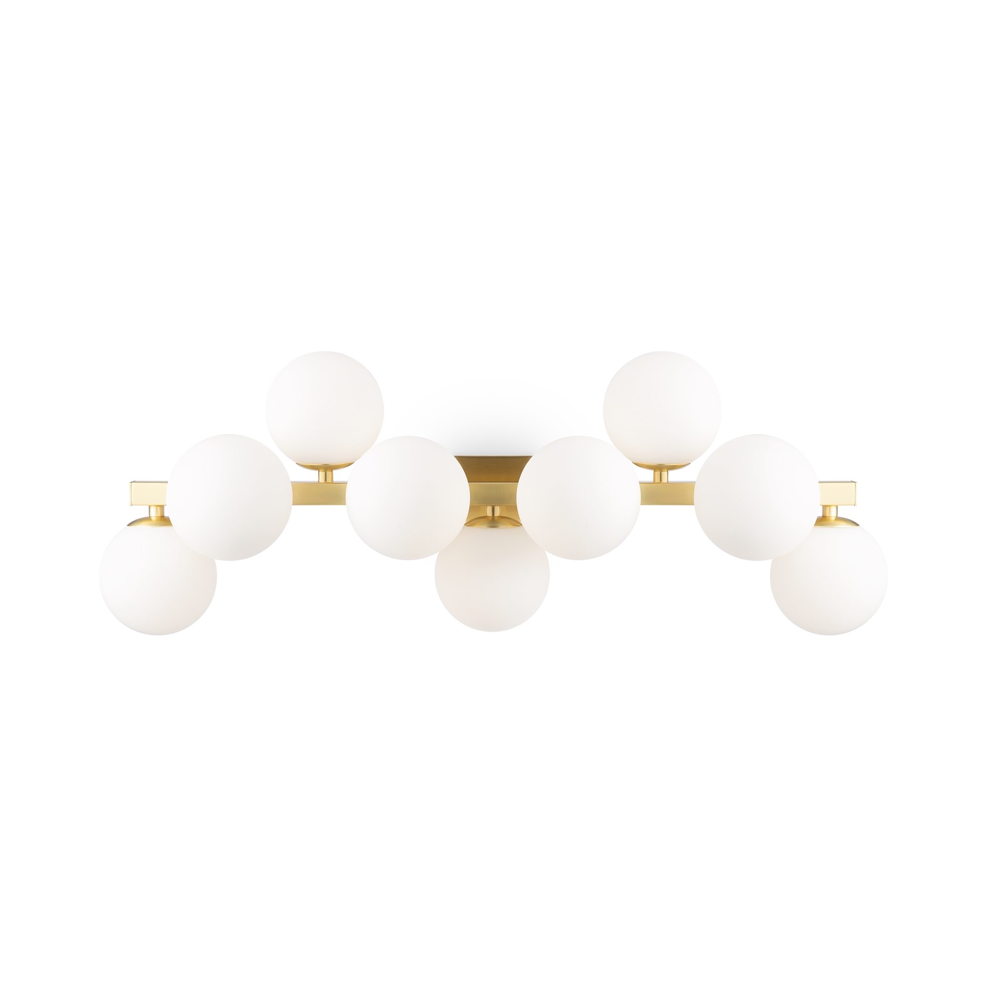Металлическая арматура в четырех цветах: матовый черный, хром, золото, латунь. Плафоны — выдувное стекло. Цвета — дымчатый, янтарный, коньячный. Дизайн с имитацией молекулярной структуры. Высота подвесных светильников регулируется тросом. Лампа с цоколем G9.