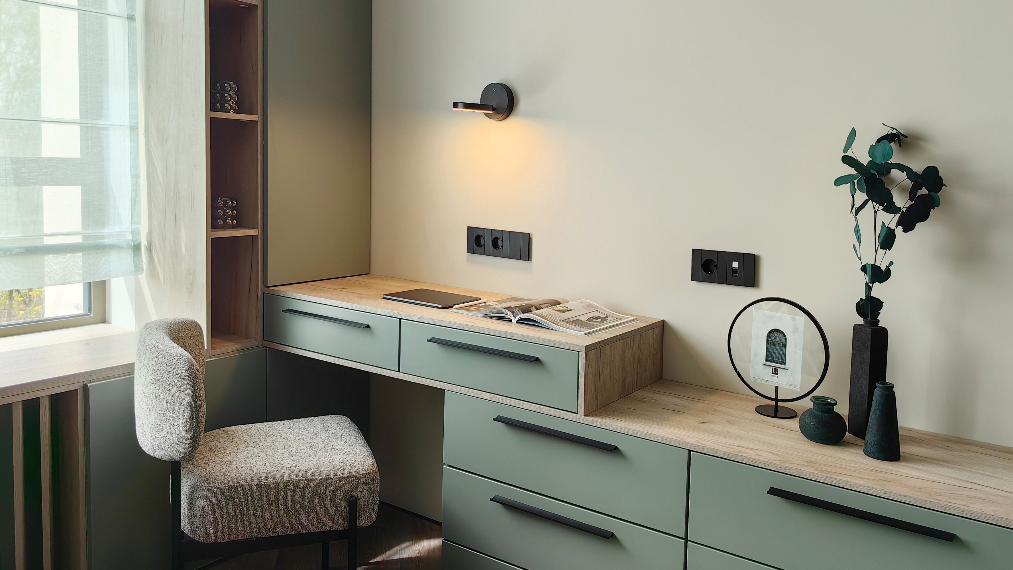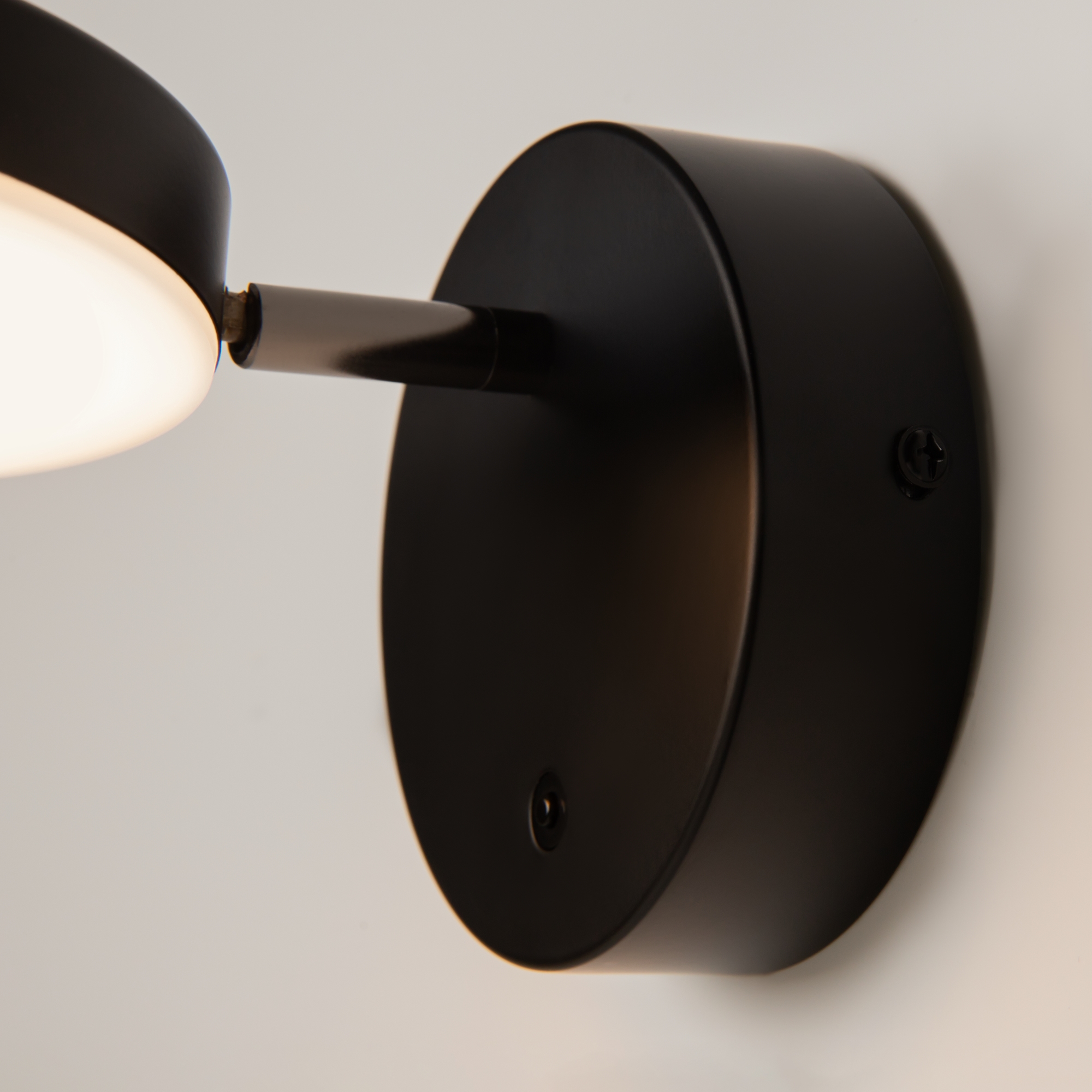 Плафоны и арматура из металла. Цвет рассеивателя — белый, арматура черная или белая. Конструкция предусматривает шарнирный механизм, позволяющий регулировать направление света и высоту светильников. Плафоны вращаются на 90 и 360° (в вертикальной и горизонтальной плоскостях). Угол рассеивания — 120 градусов. Тип света — рассеянный.