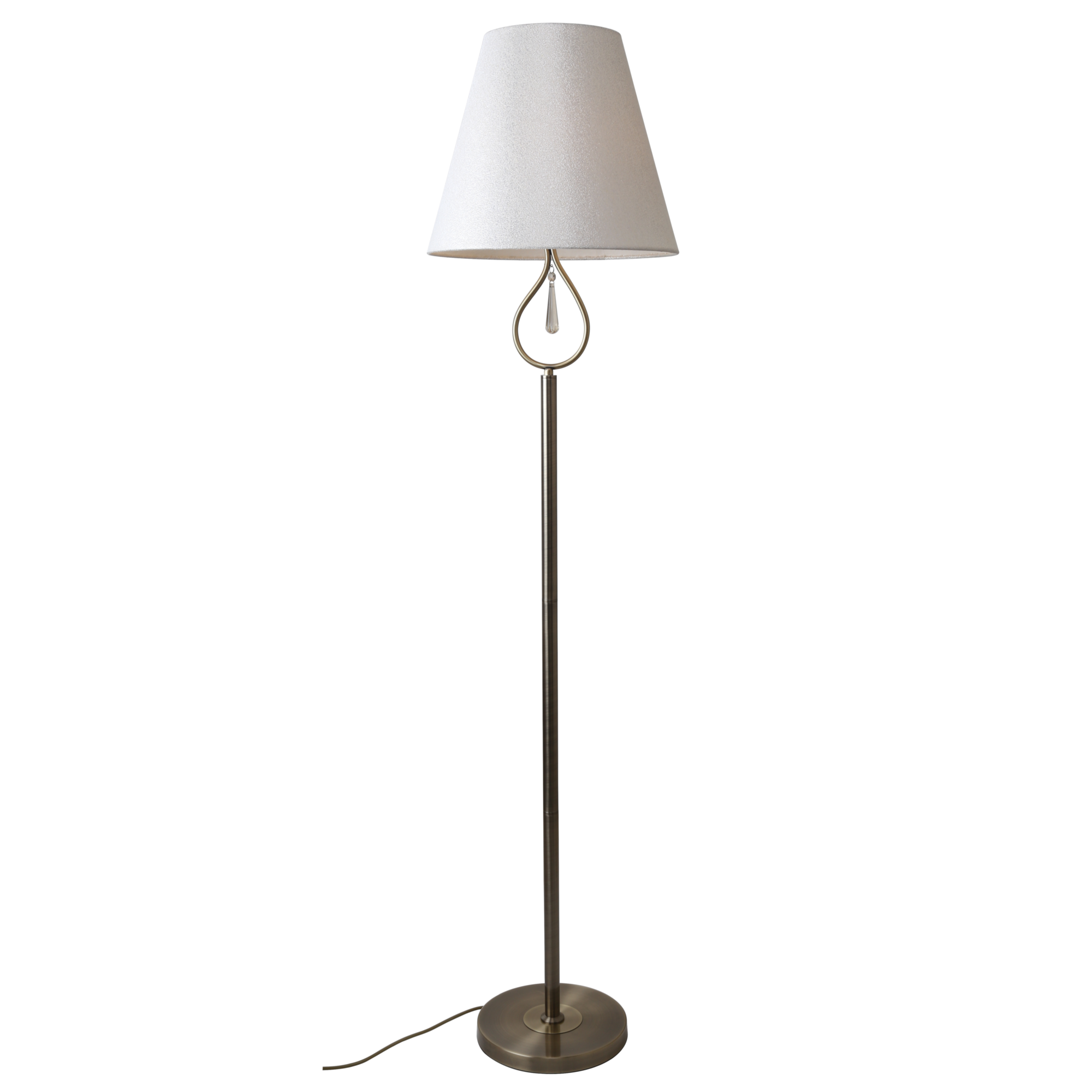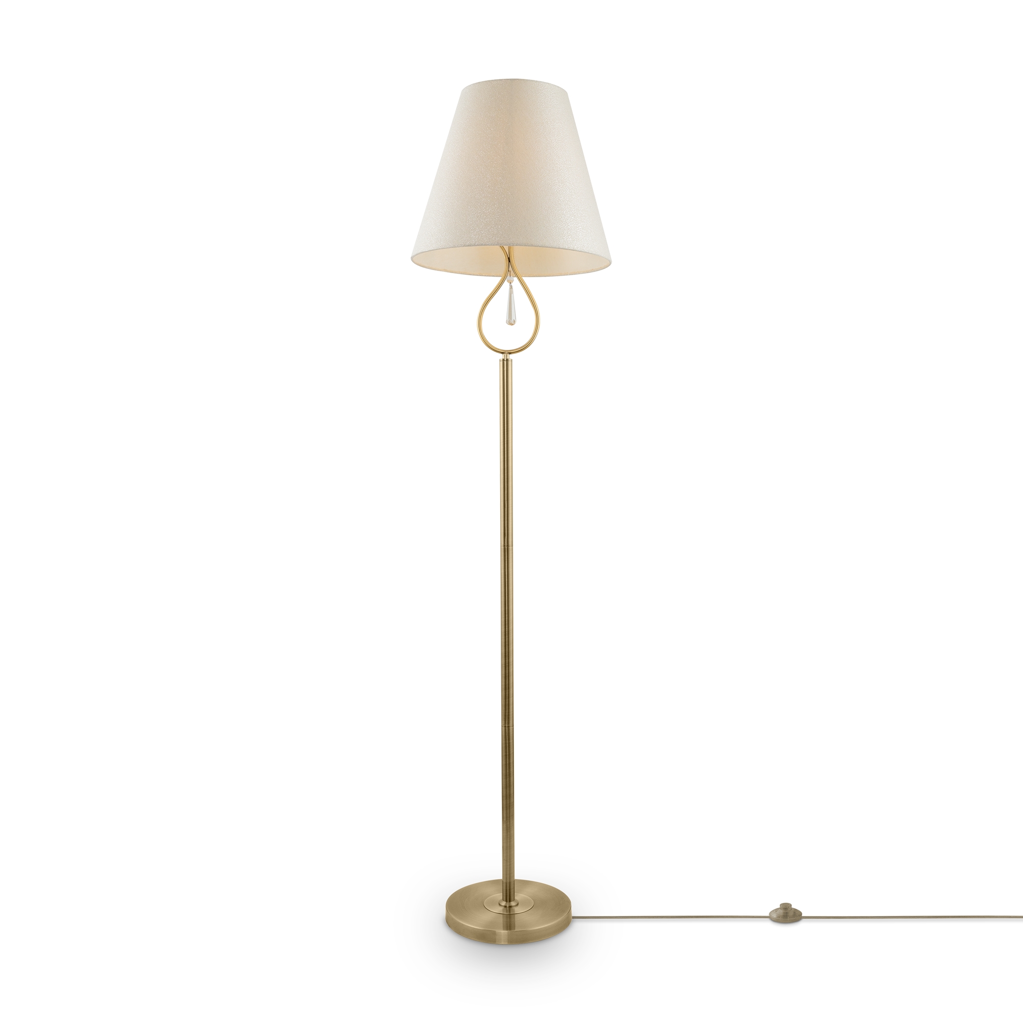 Металлическая арматура. Цвет – латунь. Абажуры из фактурной ткани белого цвета. Декор – хрустальные подвесы каплевидной формы. Одиночный подвес и торшер с цоколем Е27, лампа, бра и люстры – Е14.
