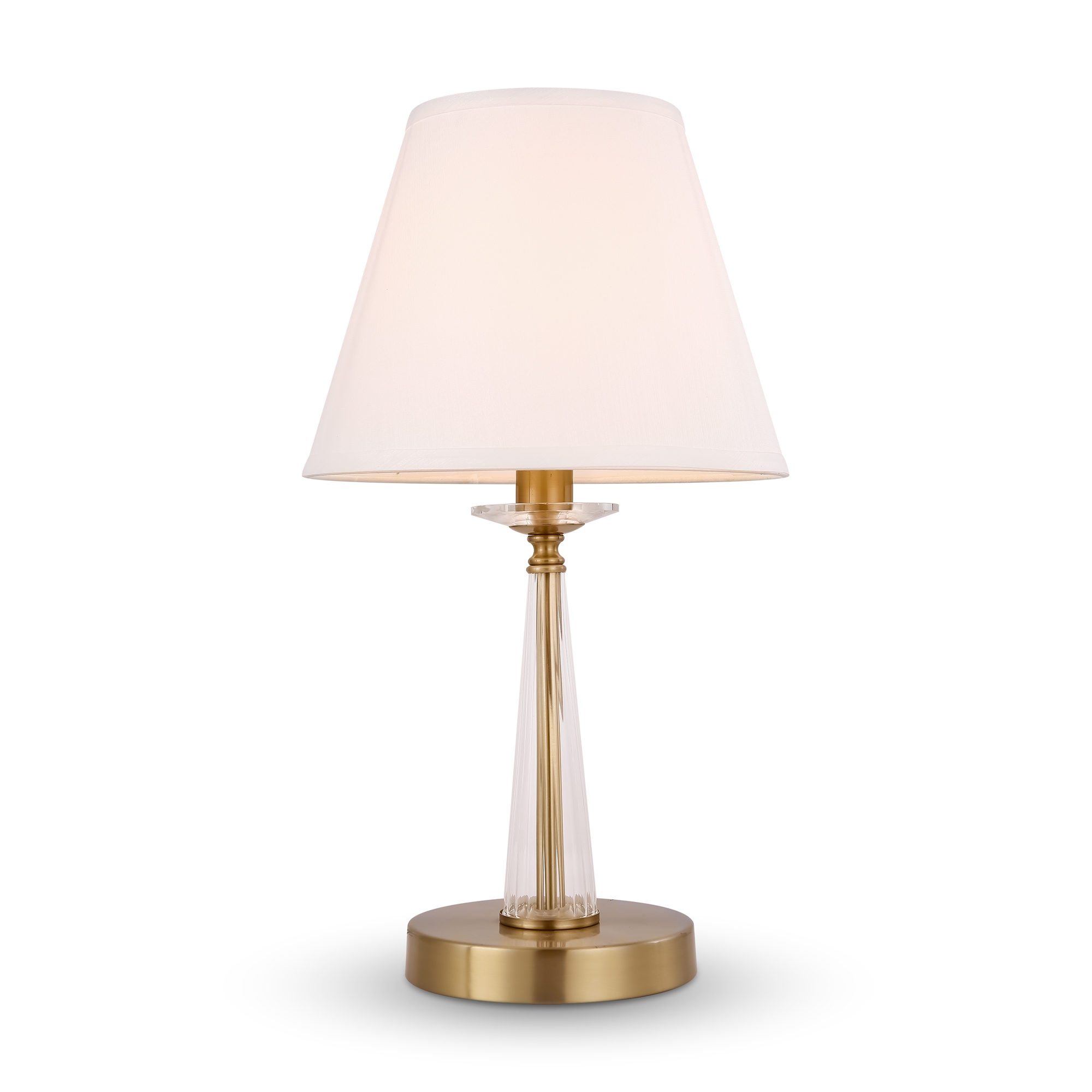Металлическая арматура в двух оттенках на выбор: латунь и никель. Абажуры – текстиль белого цвета. Декоративные элементы из прозрачного стекла. Источник света – лампа с цоколем E14.