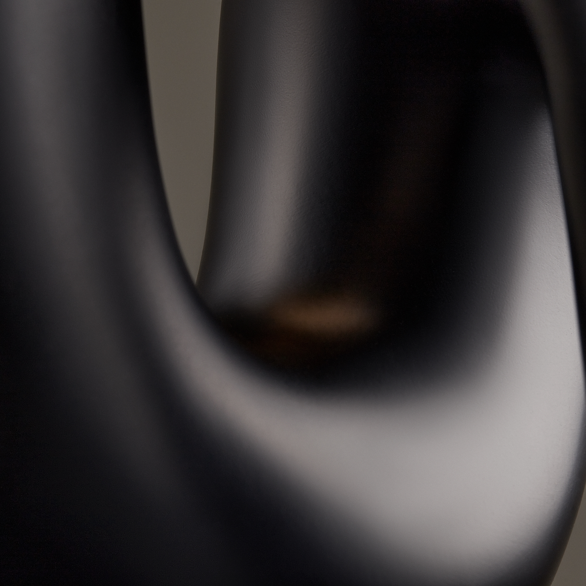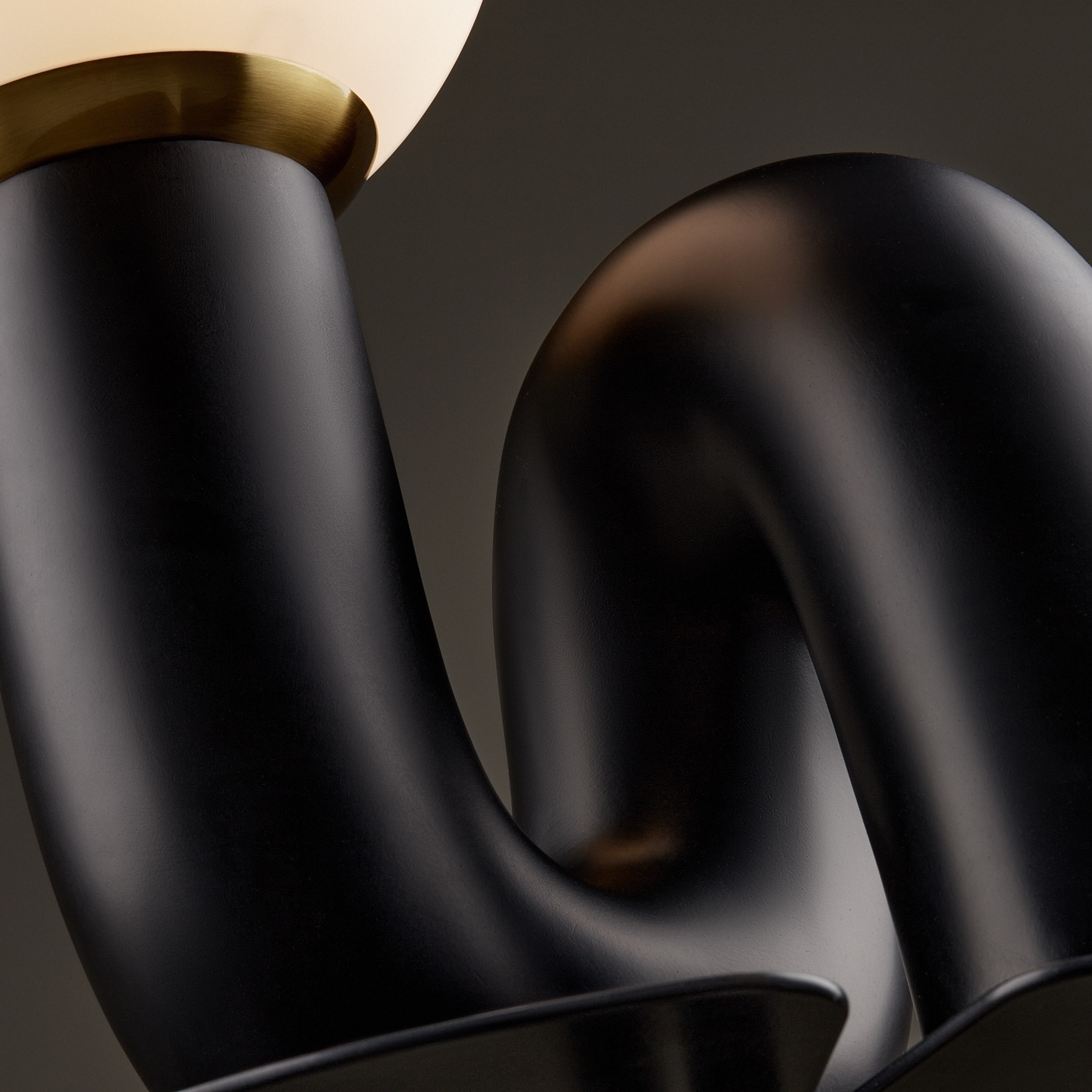 Изогнутое основание светильника выполнено из полирезина, цвет — черный. Плафон-сфера из белого матового стекла создает мягкий заливающий свет. Дизайн светильника воплощает в себе предмет искусства. Источник света — лампа с цоколем E14.
