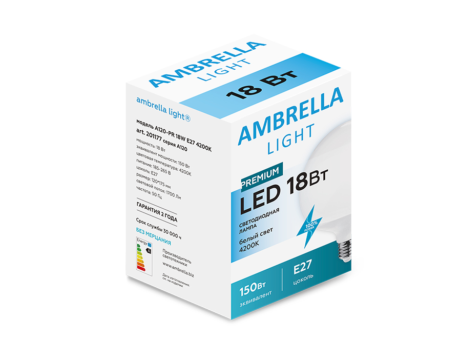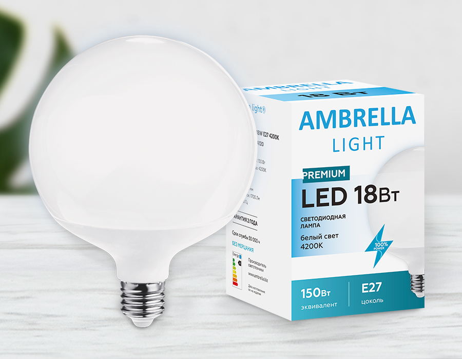 Светодиодная лампа A120, цоколь E27, мощность 18W, класс энергоэффективности А, рассеиватель белый матовый, теплое свечение 4200K, форма "Шар", 165*120.