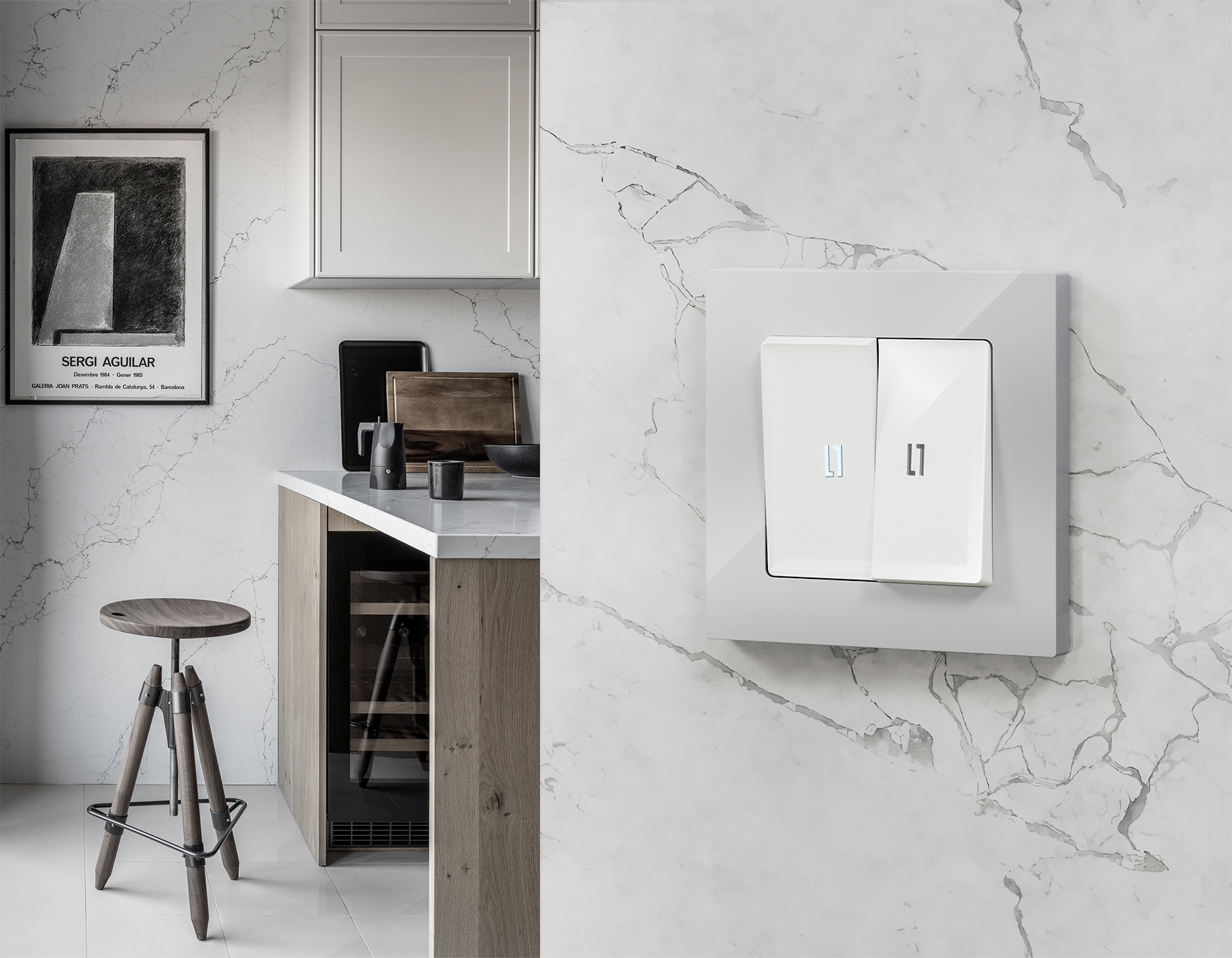 Комплект механизма 2-кл выключателя с самовозвратом с подсветкой 5600K ALFA MA104055 Белый глянец QUANT