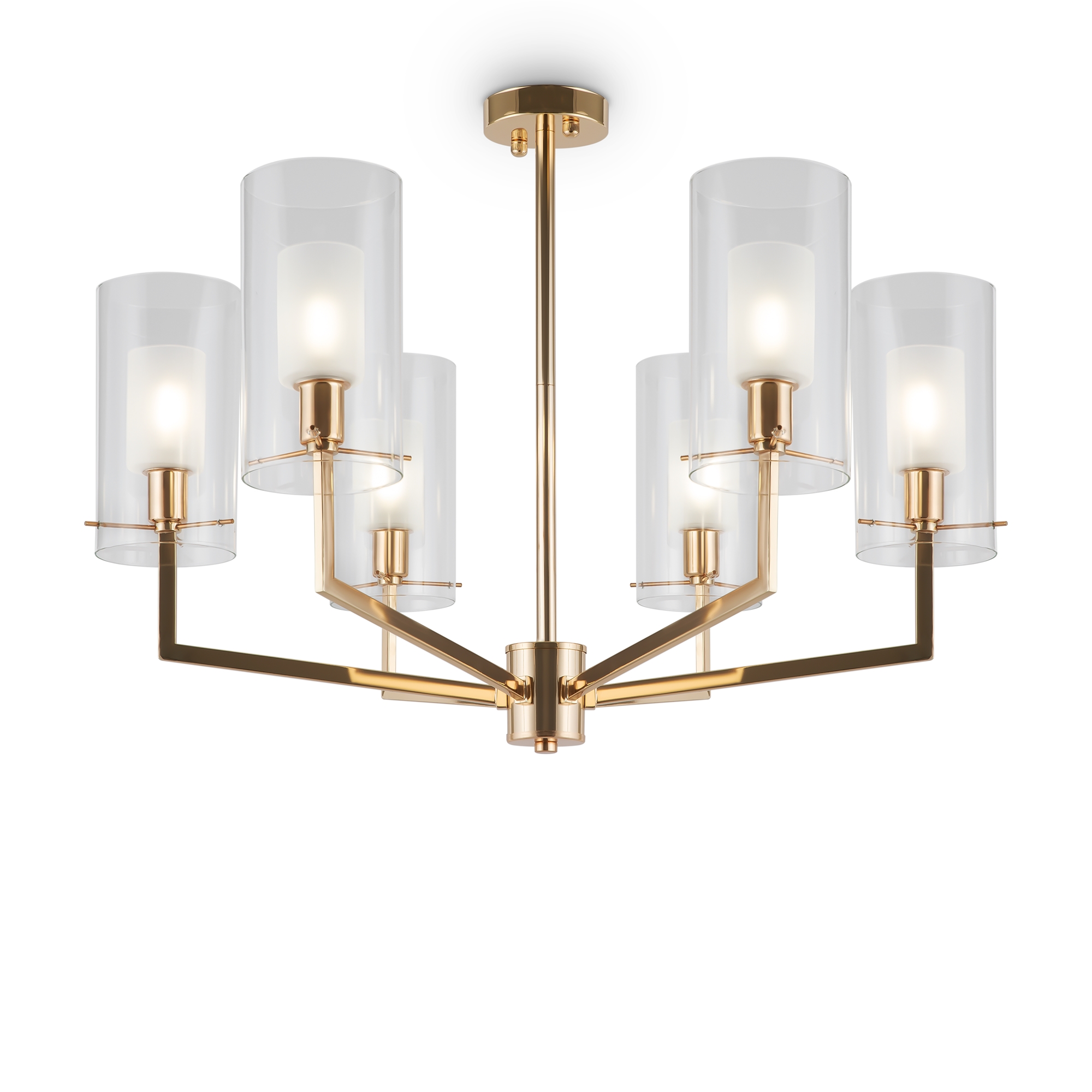 Металлическая арматура оттенка французского золота. Двойные стеклянные плафоны: матовые внутри, прозрачные снаружи. Лаконичная геометрия с симметричным расположением элементов. Источник света – лампа с цоколем E14.