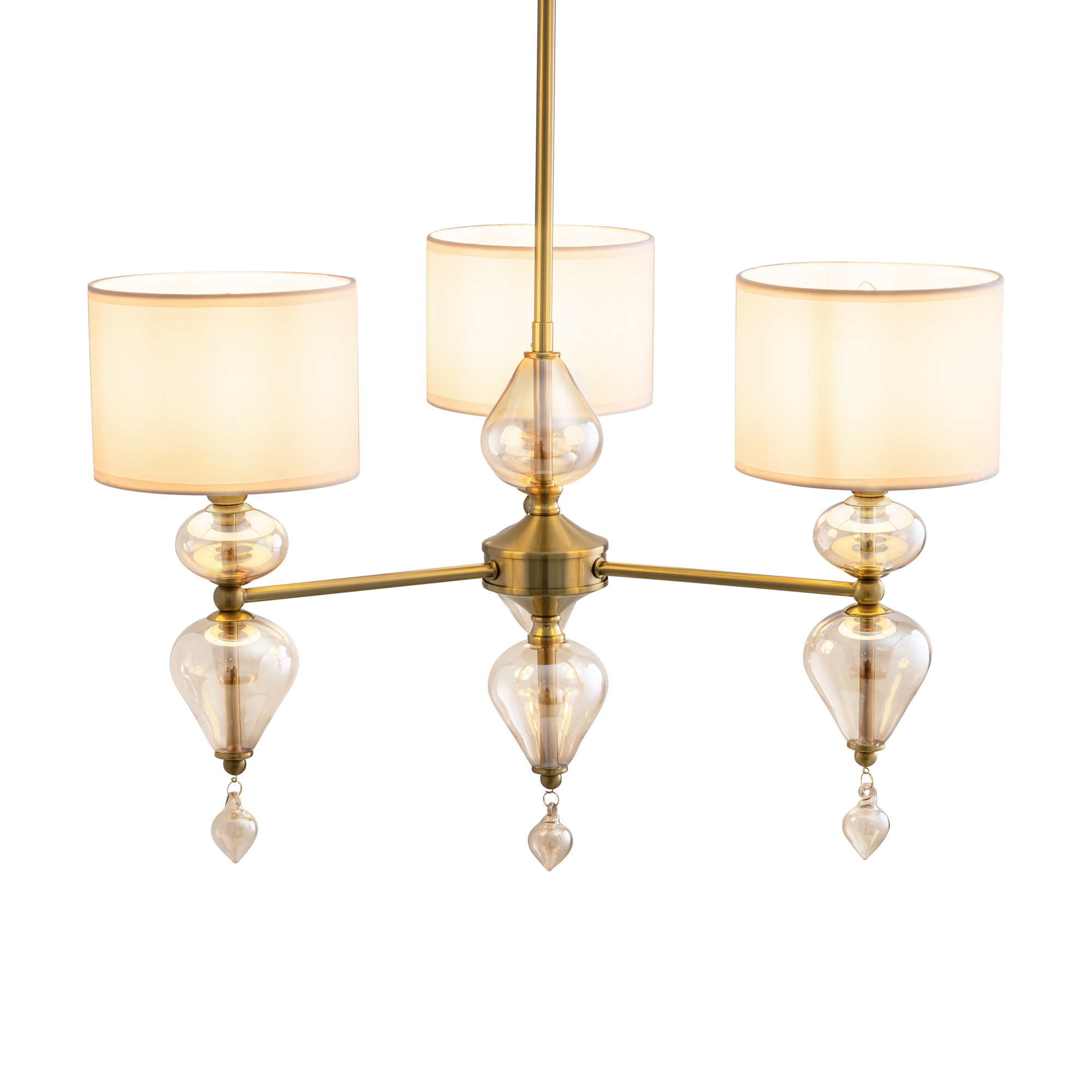 Арматура из металла, цвет — латунь. Плафоны — тканевые, молочного цвета. Металлическая конструкция декорирована выдувными стеклянными элементами с перламутровым напылением. Источником света служит лампа с цоколем Е14.