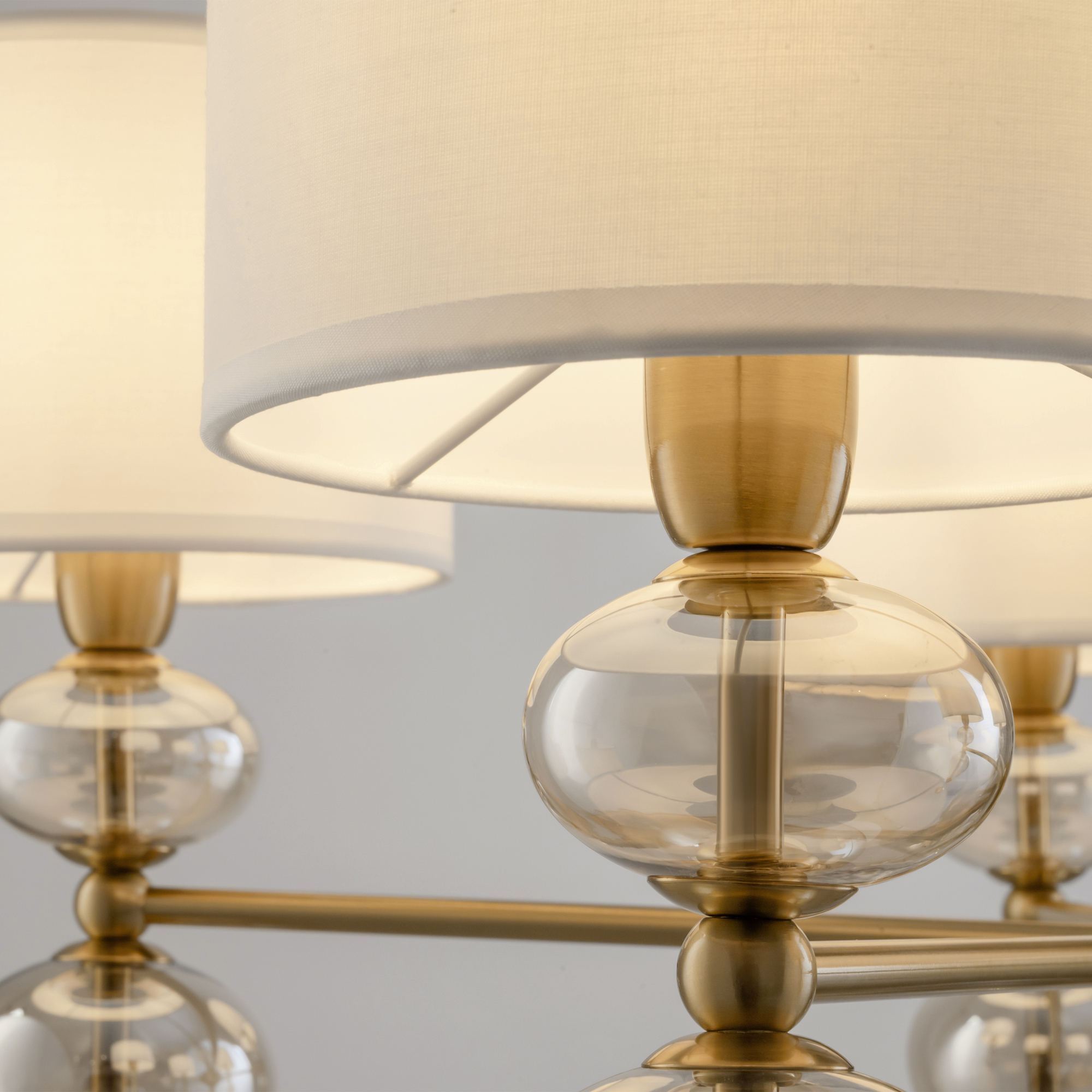 Арматура из металла, цвет — латунь. Плафоны — тканевые, молочного цвета. Металлическая конструкция декорирована выдувными стеклянными элементами с перламутровым напылением. Источником света служит лампа с цоколем Е14.