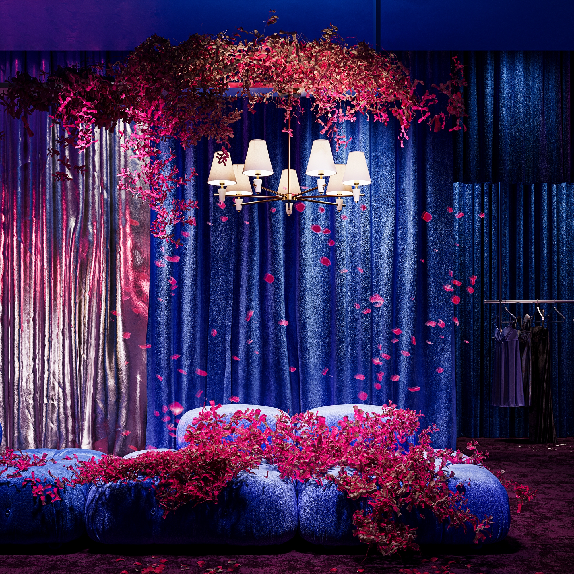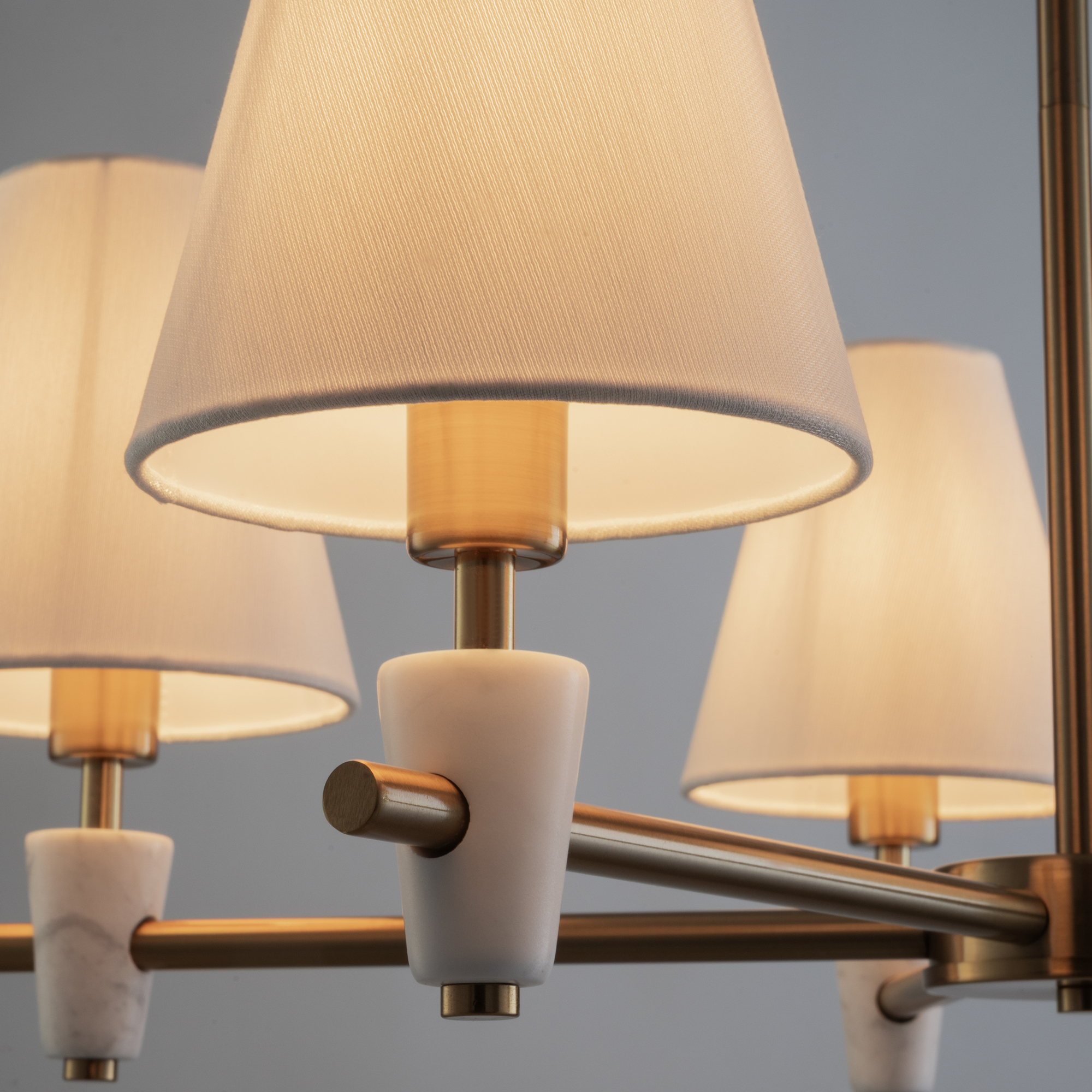 Металлическая арматура в цвете латунь. Дополнительные элементы — минималистичные вставки из натурального белого мрамора. Белые абажуры из ткани в форме конуса. Источник света — лампа с цоколем Е14 или Е27.