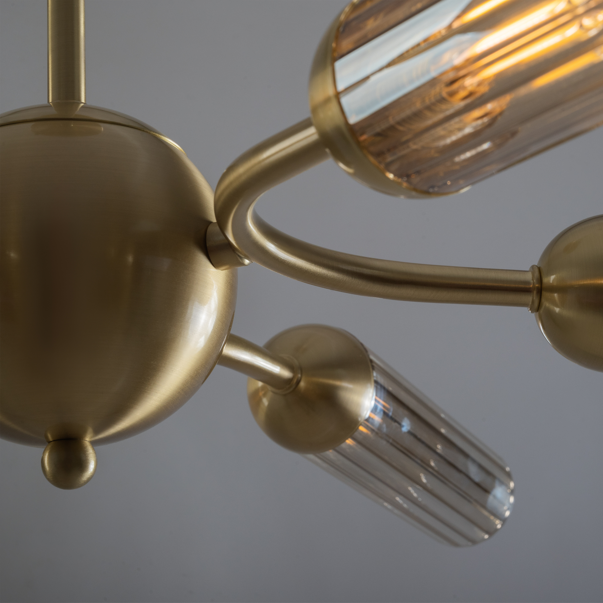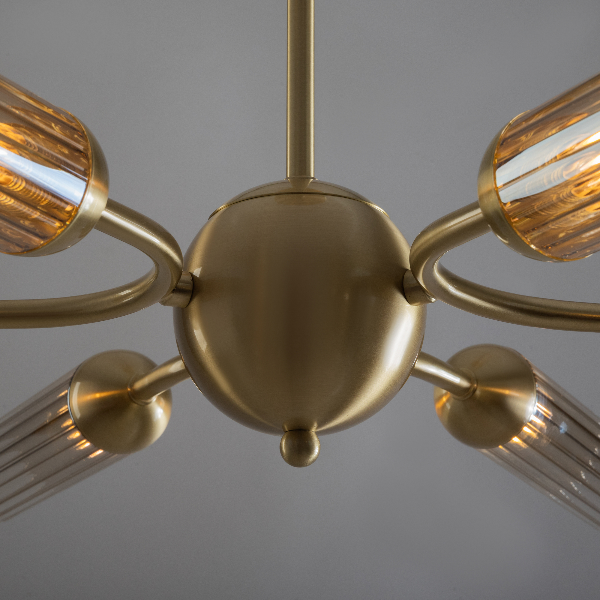 Арматура из металла, цвет — золото. Рельефные плафоны в тренде ZIGZAG. Материал — стекло, цвет — янтарный. Высота подвесных светильников регулируется. Плафоны закреплены на металлическую сферу. Источник света — лампа с цоколем G9.