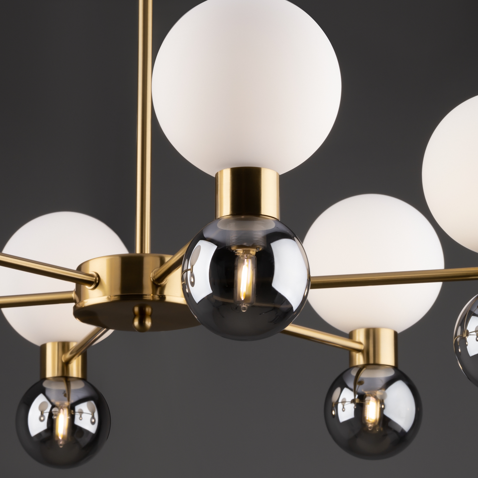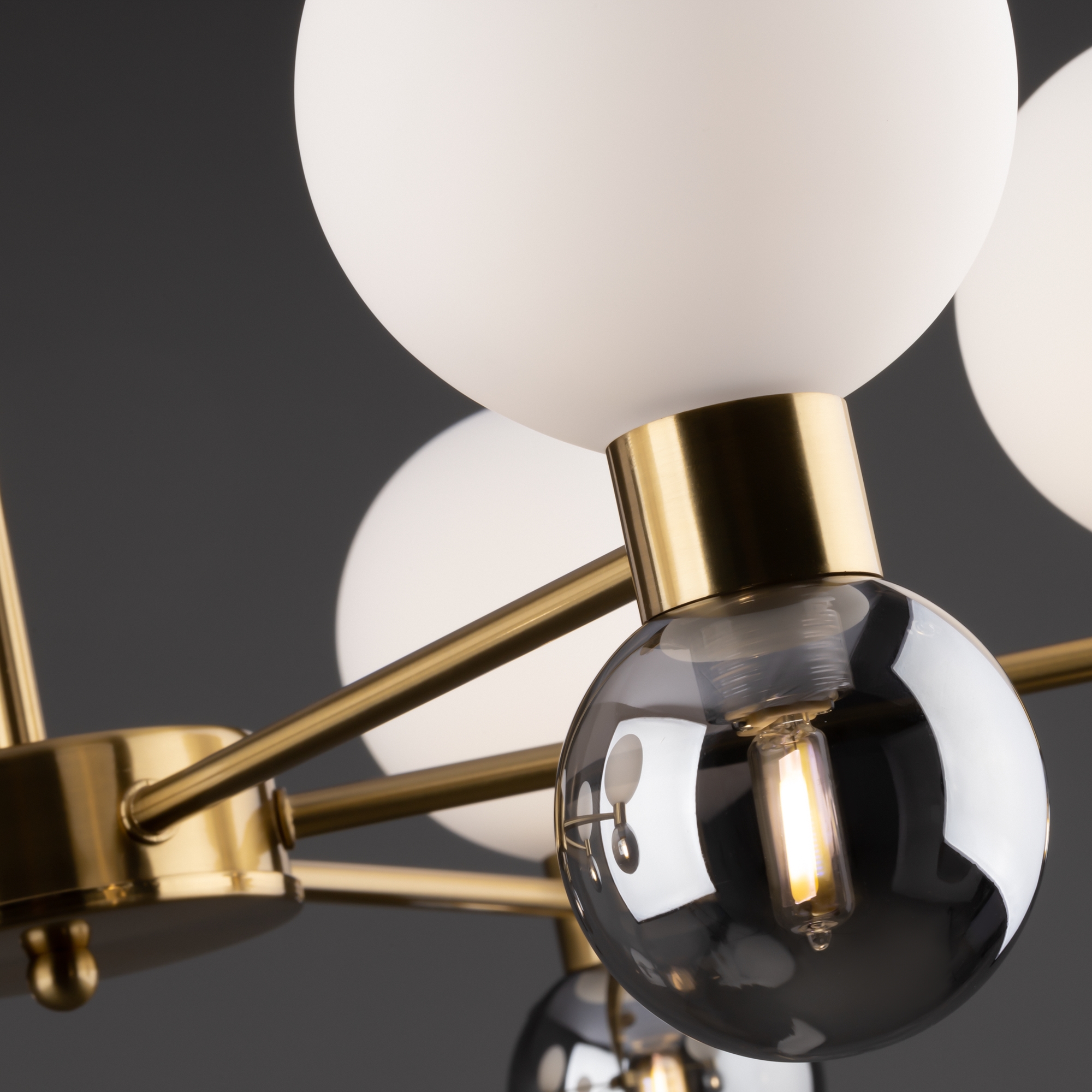 Металлическая арматура в цвете латунь. Открытые сферические плафоны в 2-х цветах: тёплый белый и тёмный гальванизированный. Плафоны разделены металлической вставкой в цвет арматуры. Источником света является лампа с цоколем G9. Для бра - цоколь Е27.