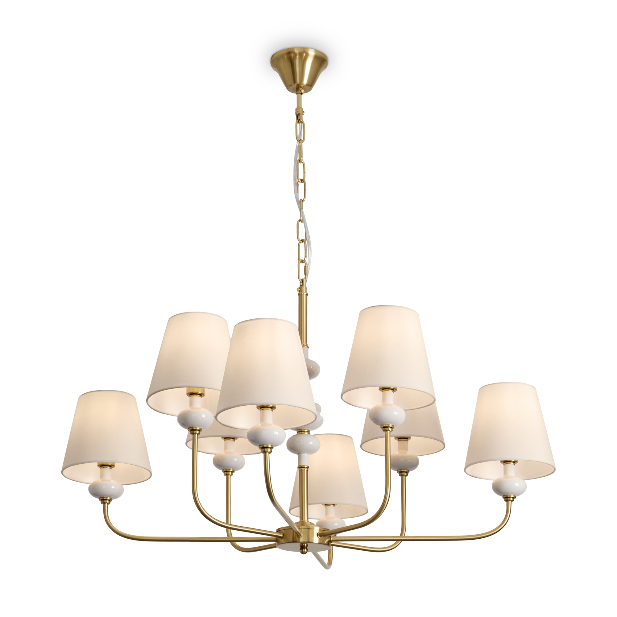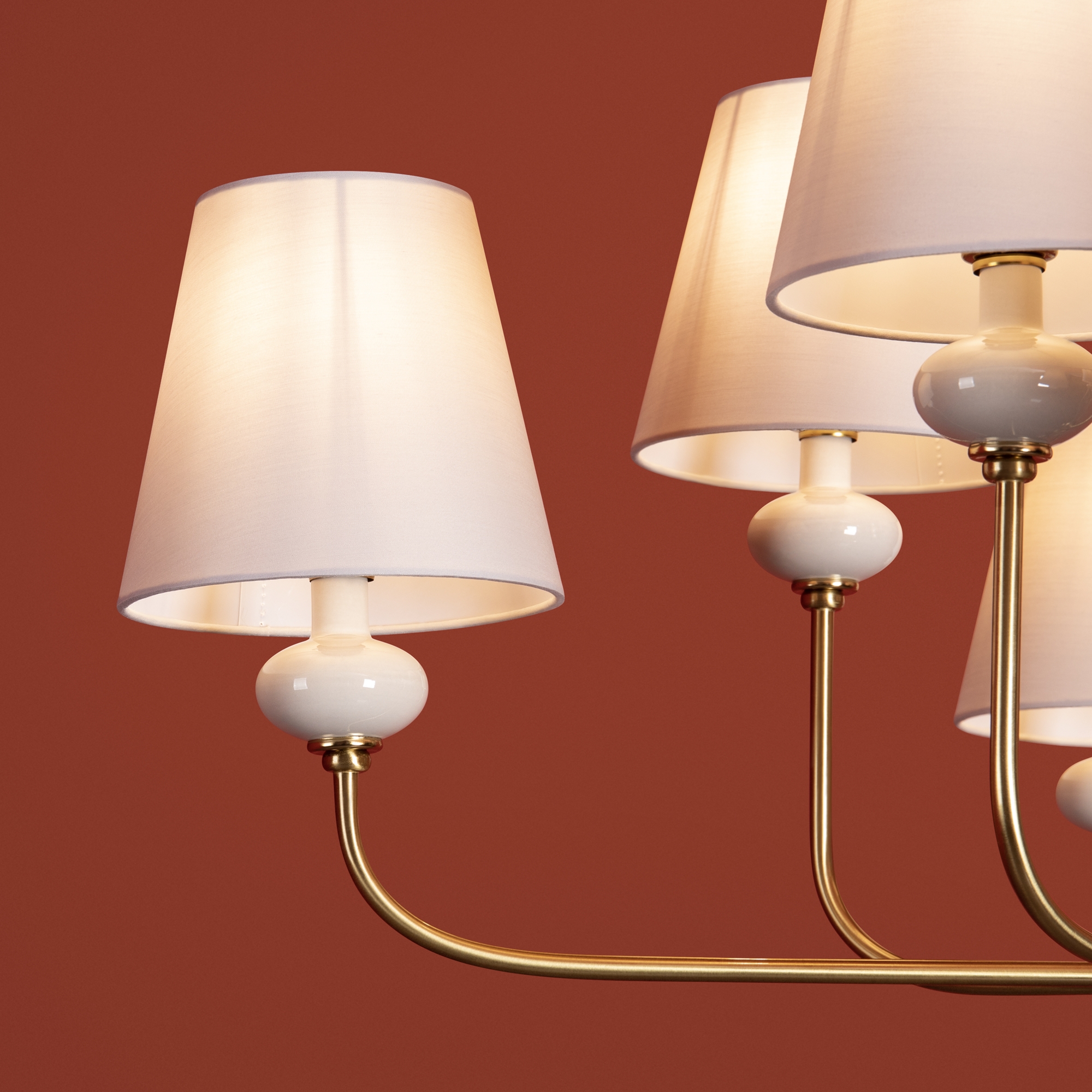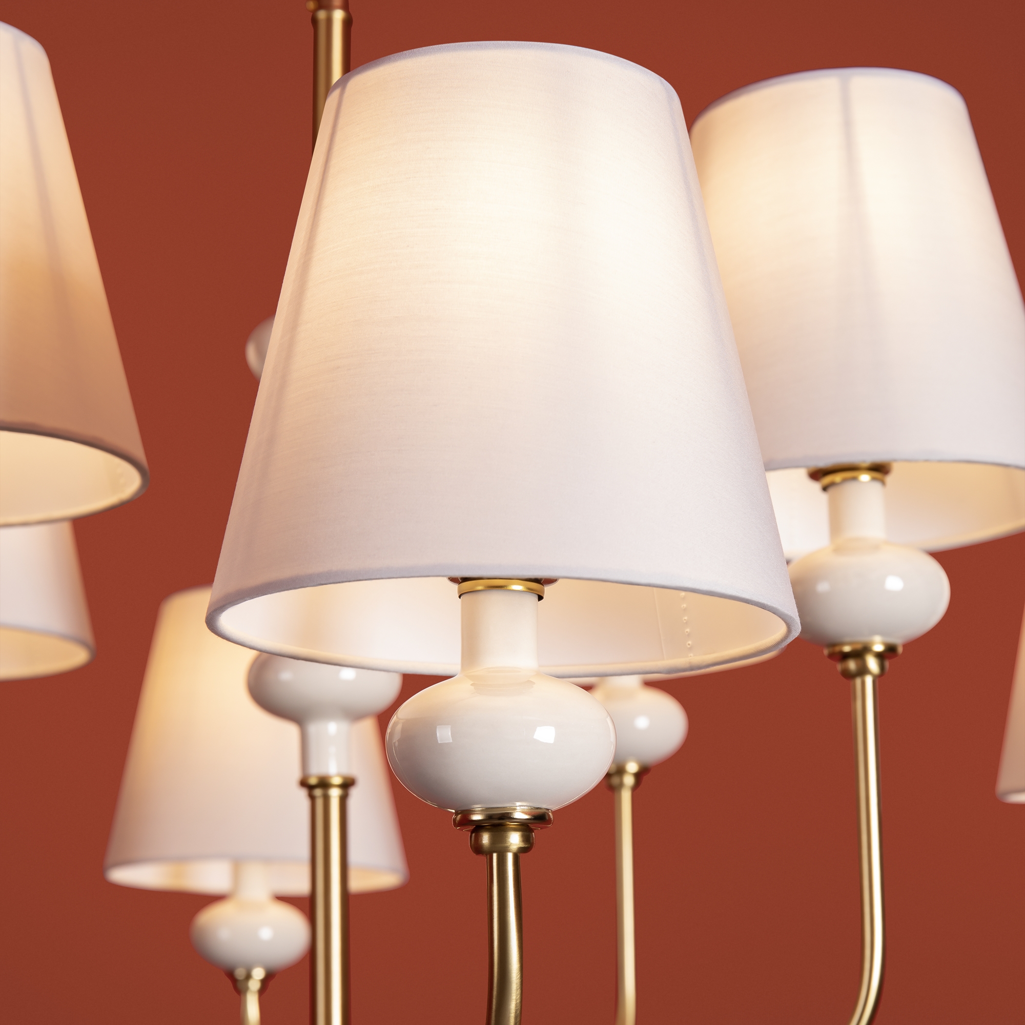 Материал арматуры — металл, цвет — латунь. Подвесные светильники с цоколем E14. Светильники с керамическими декоративными элементами серо бежевых оттенков. Белый абажур, выполнен из натуральной ткани. Сочетание классической элегантности с современным дизайном создает утонченную атмосферу в интерьере.
