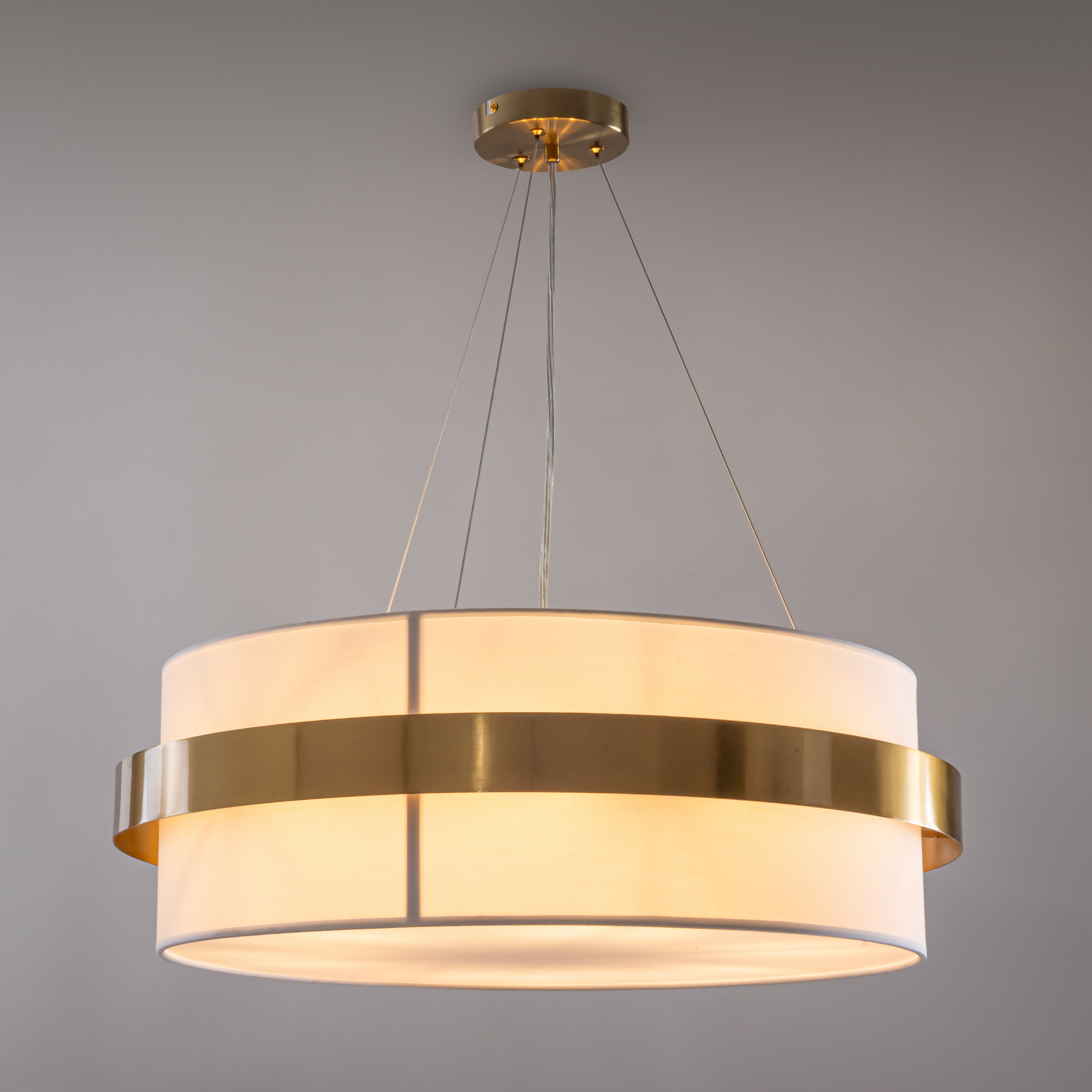 Цилиндрической формы абажур из ткани белого цвета. Декоративная парящая окантовка из металла в цвет арматуры. Регулируется по длине. Компактные размеры подходят для низких потолков и небольших интерьеров. Металлическая арматура, цвет - латунь и никель. Источник света — лампа с цоколем Е14, E27 и для настенного бра дополнительный LED с температурой свечения 3000 K.