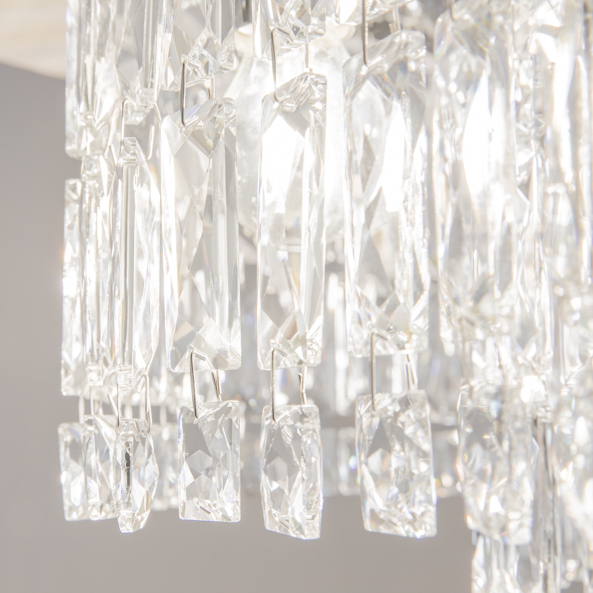 Металлическая арматура в двух оттенках: хром, золото. Декор – прозрачные кристаллы. Потолочные модели имеют два яруса подвесок. Высота подвесной люстры регулируется тросом.