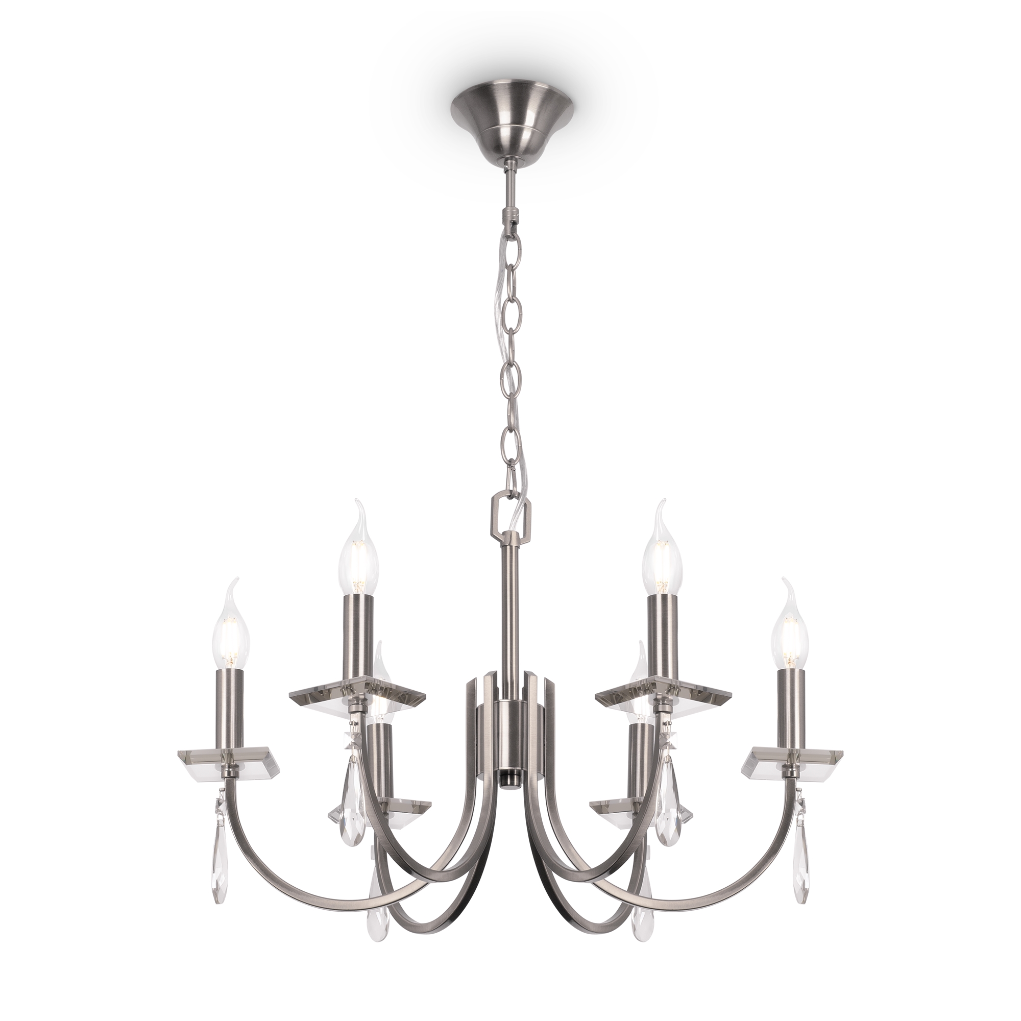 Металлическая арматура в двух оттенках: латунь и никель. Классическая форма плафона в виде свечи. Торшер и настольная лампа имеют тканевые абажуры. Белые – для арматуры цвета никель, оттенка кремовый шампань – для латунной. Декор – прозрачные хрустальные подвесы каплевидной формы. Торшер с цоколем Е27, лампа, бра и люстры – Е14.