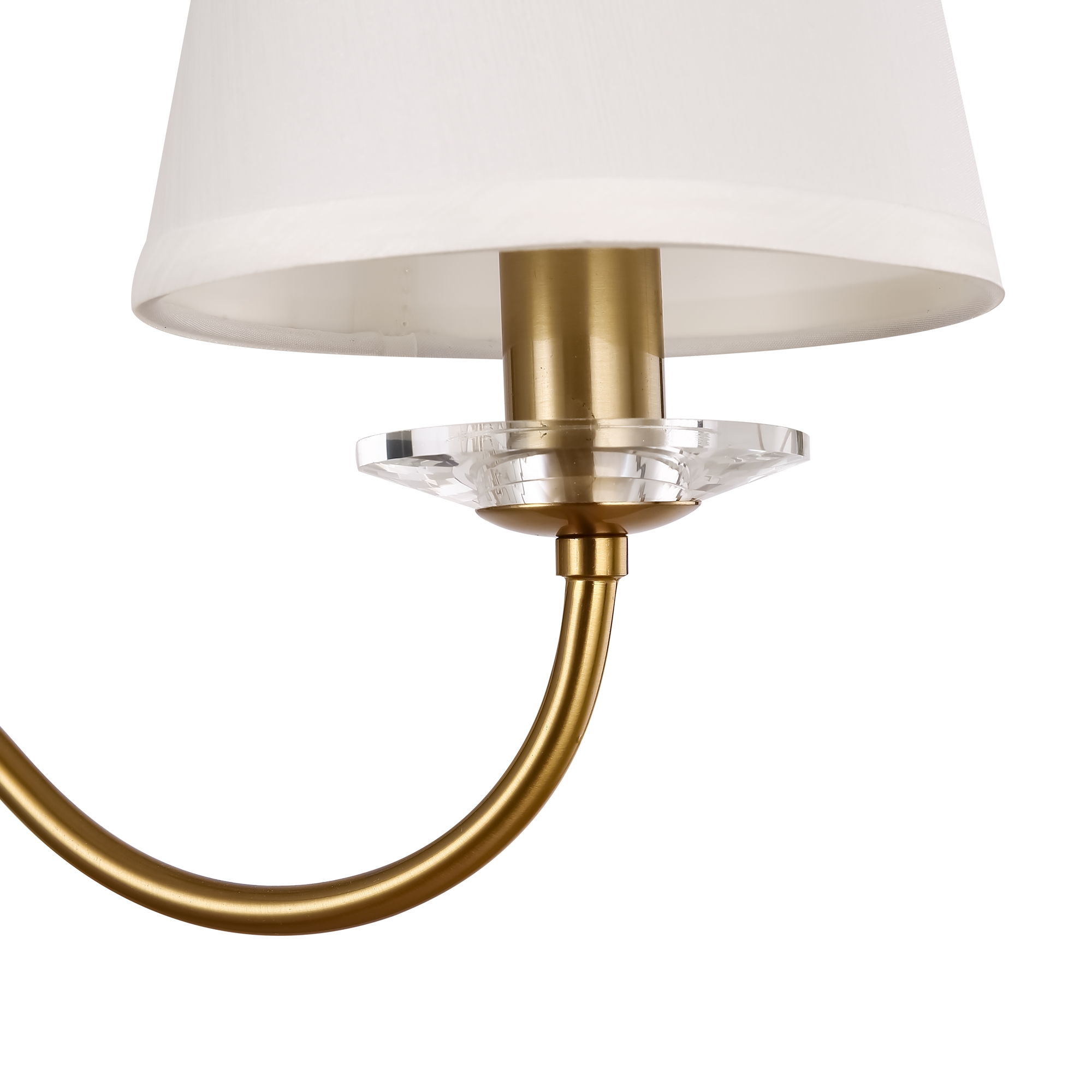 Металлическая арматура в двух оттенках на выбор: латунь и никель. Абажуры – текстиль белого цвета. Декоративные элементы из прозрачного стекла. Источник света – лампа с цоколем E14.
