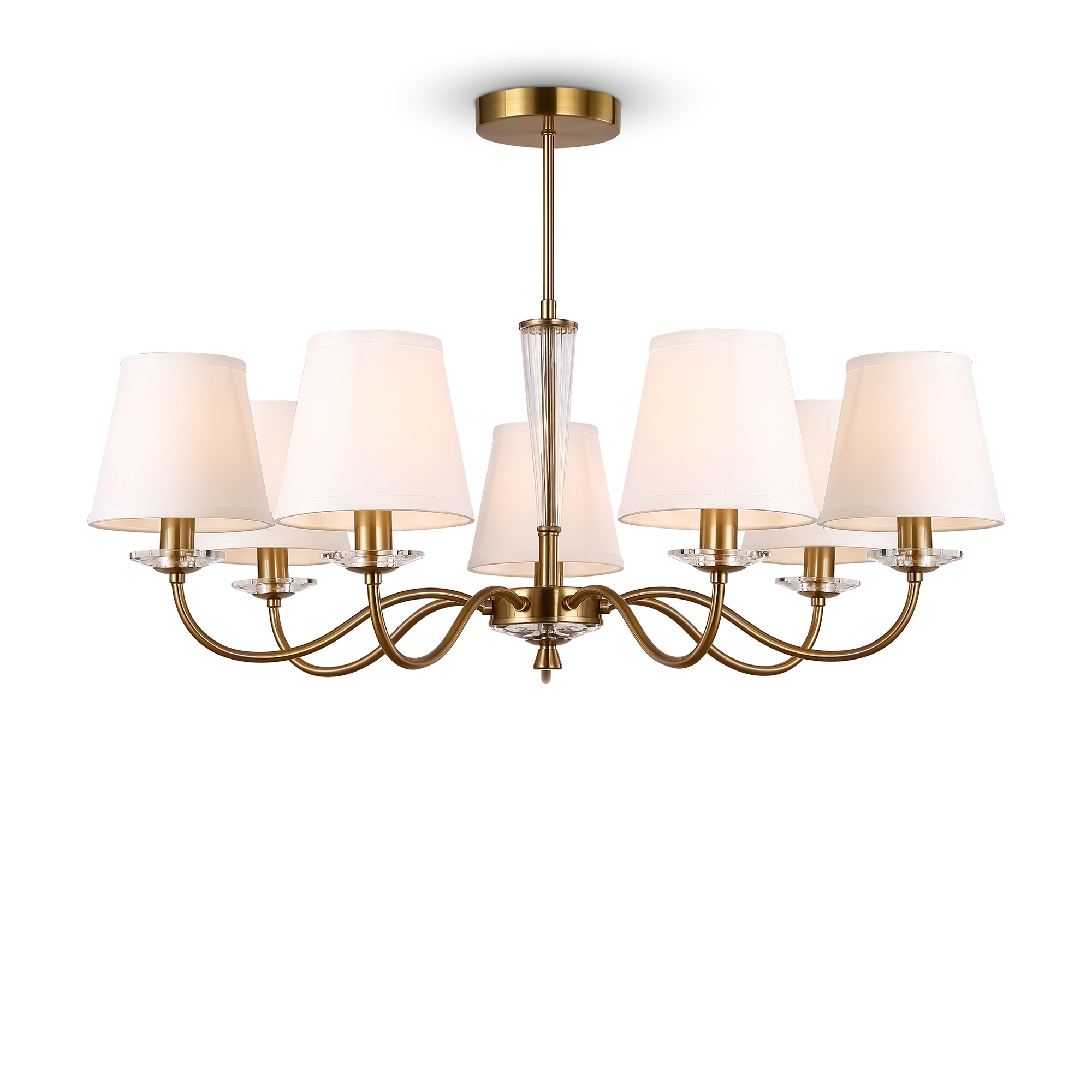 Металлическая арматура в двух оттенках на выбор: латунь и никель. Абажуры – текстиль белого цвета. Декоративные элементы из прозрачного стекла. Источник света – лампа с цоколем E14.