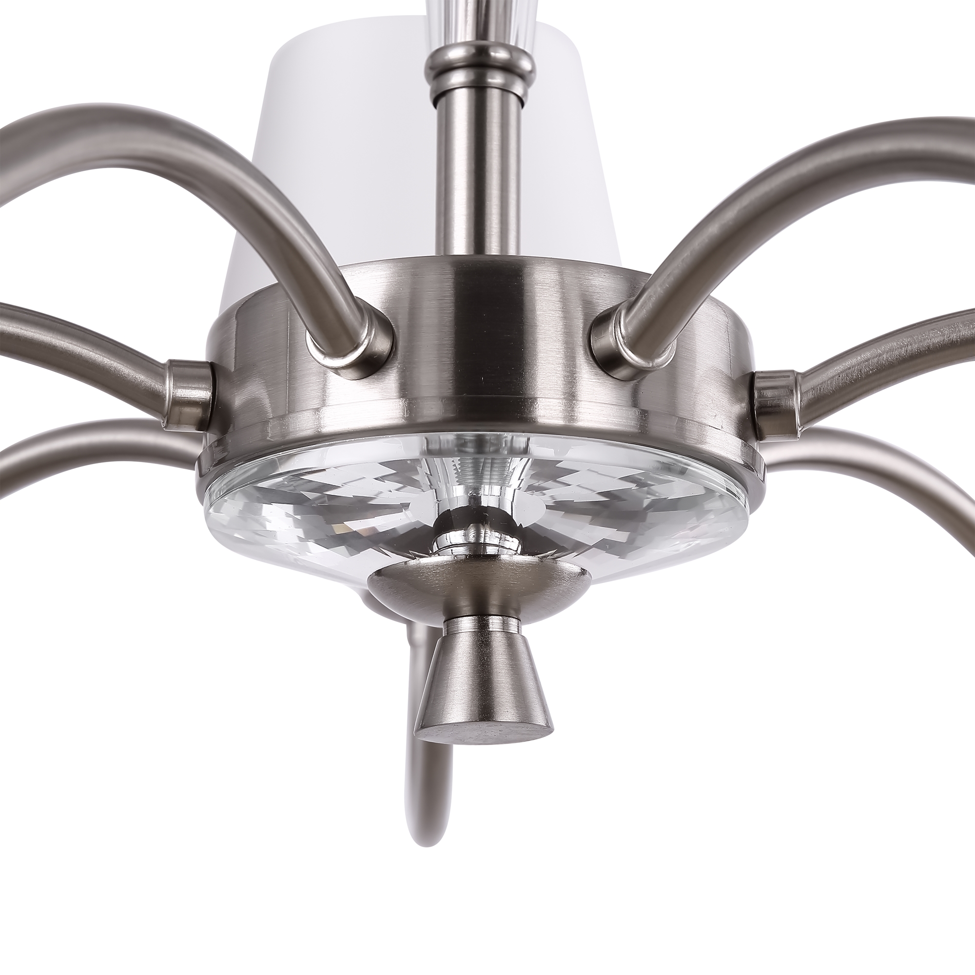 Металлическая арматура в двух оттенках на выбор: латунь и никель. Абажуры – текстиль белого цвета. Декоративные элементы из прозрачного стекла. Источник света – лампа с цоколем E14.
