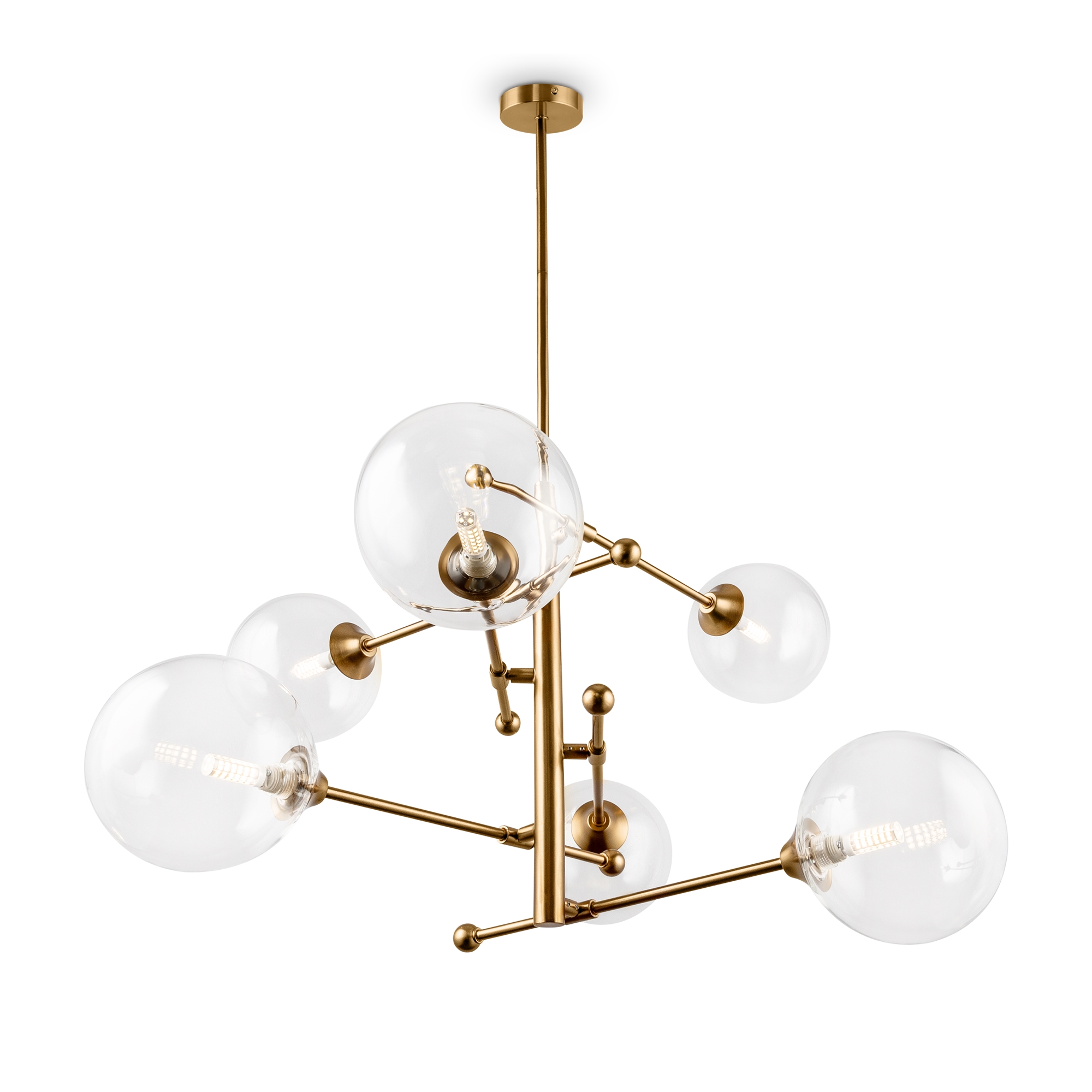 Материал арматуры – металл. Цвет – золотая бронза. Плафоны сферической формы. Материал – прозрачное дутое стекло. Регулируемое крепление плафонов позволяет менять дизайн и направление светового потока. Источник света – лампа G9.