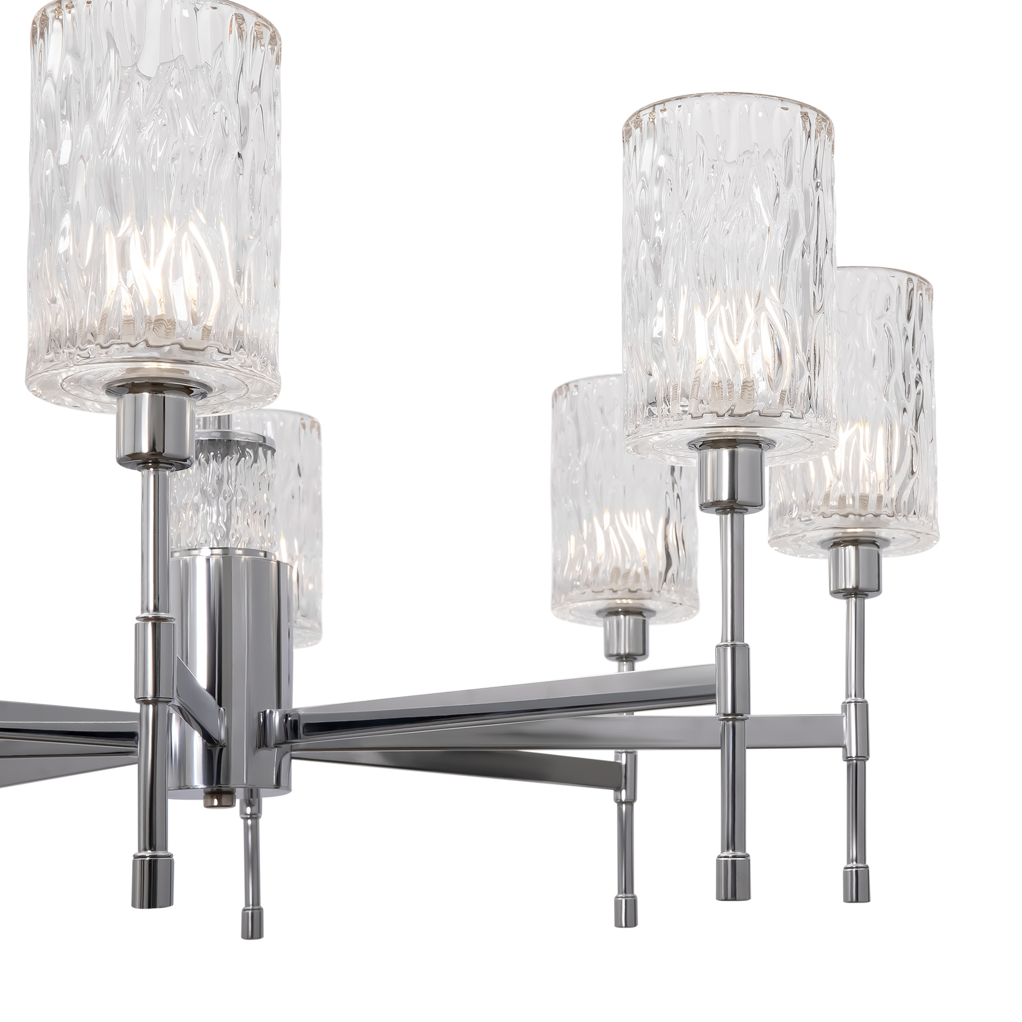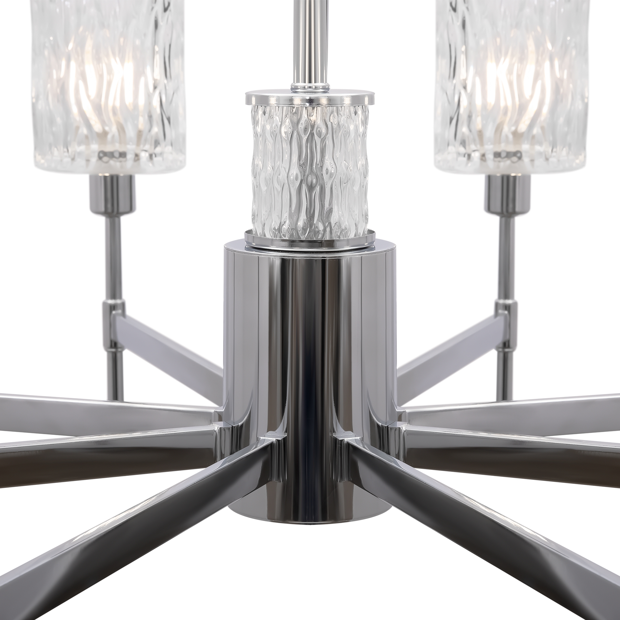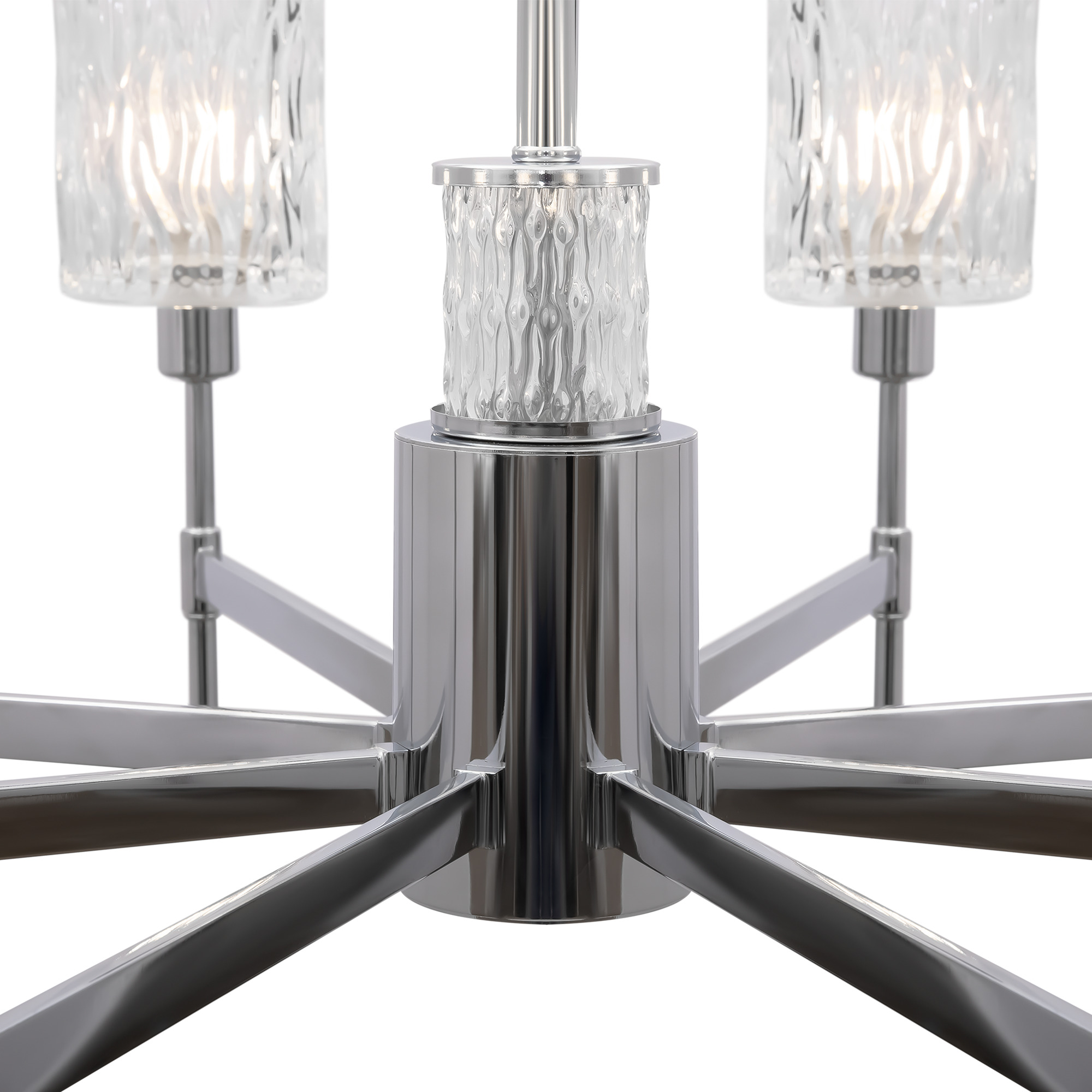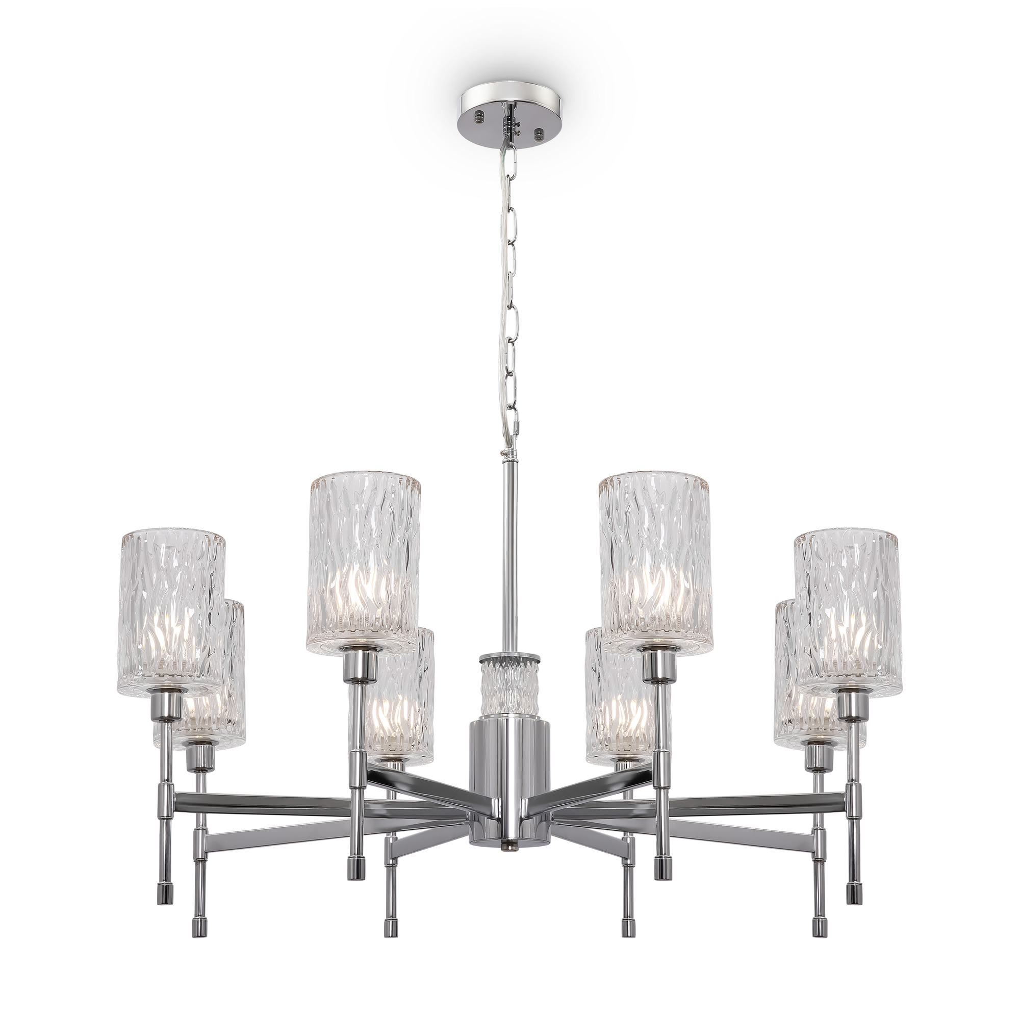 Хромированная металлическая арматура. Плафоны – фактурное прозрачное стекло. В качестве источника света используется лампа с цоколем Е14.