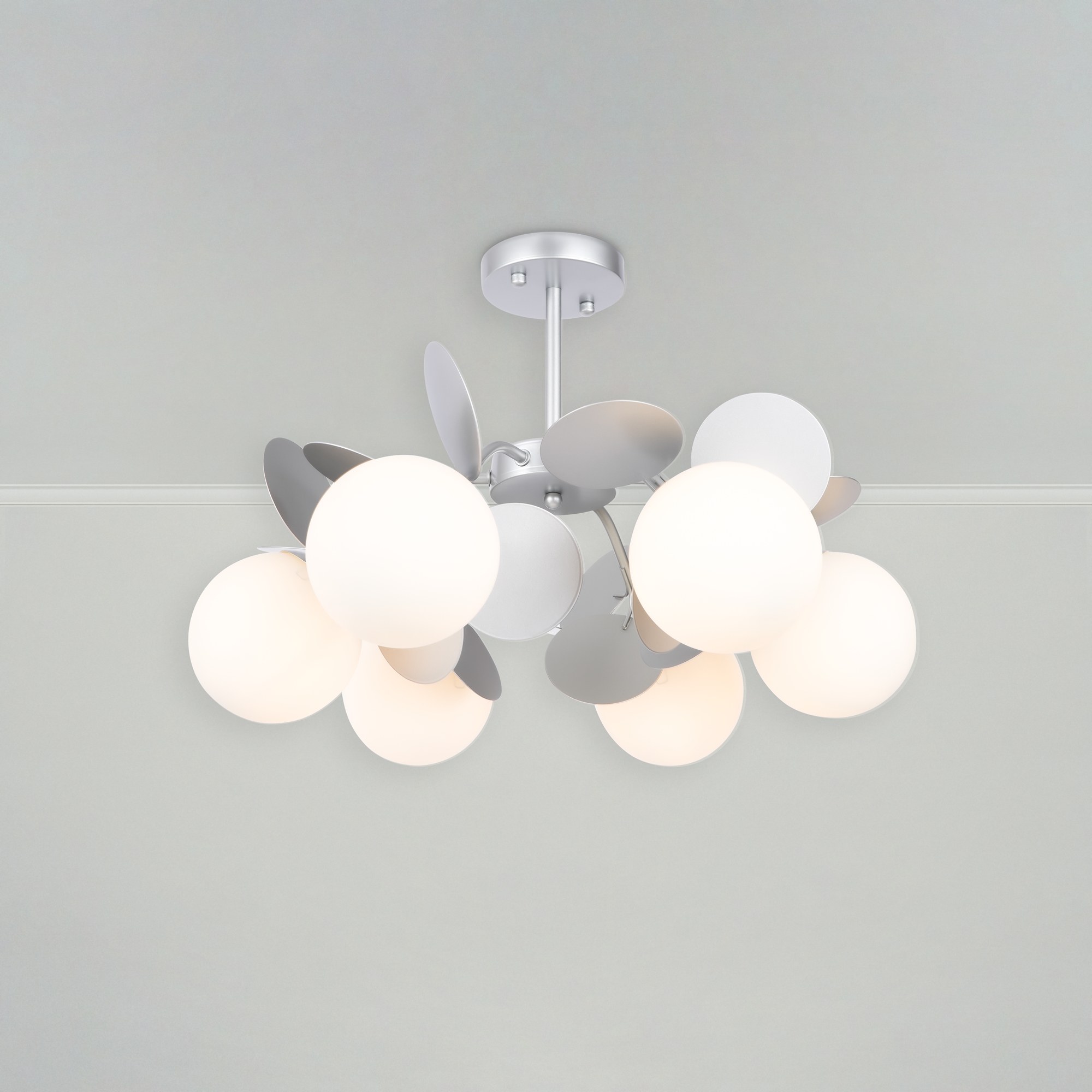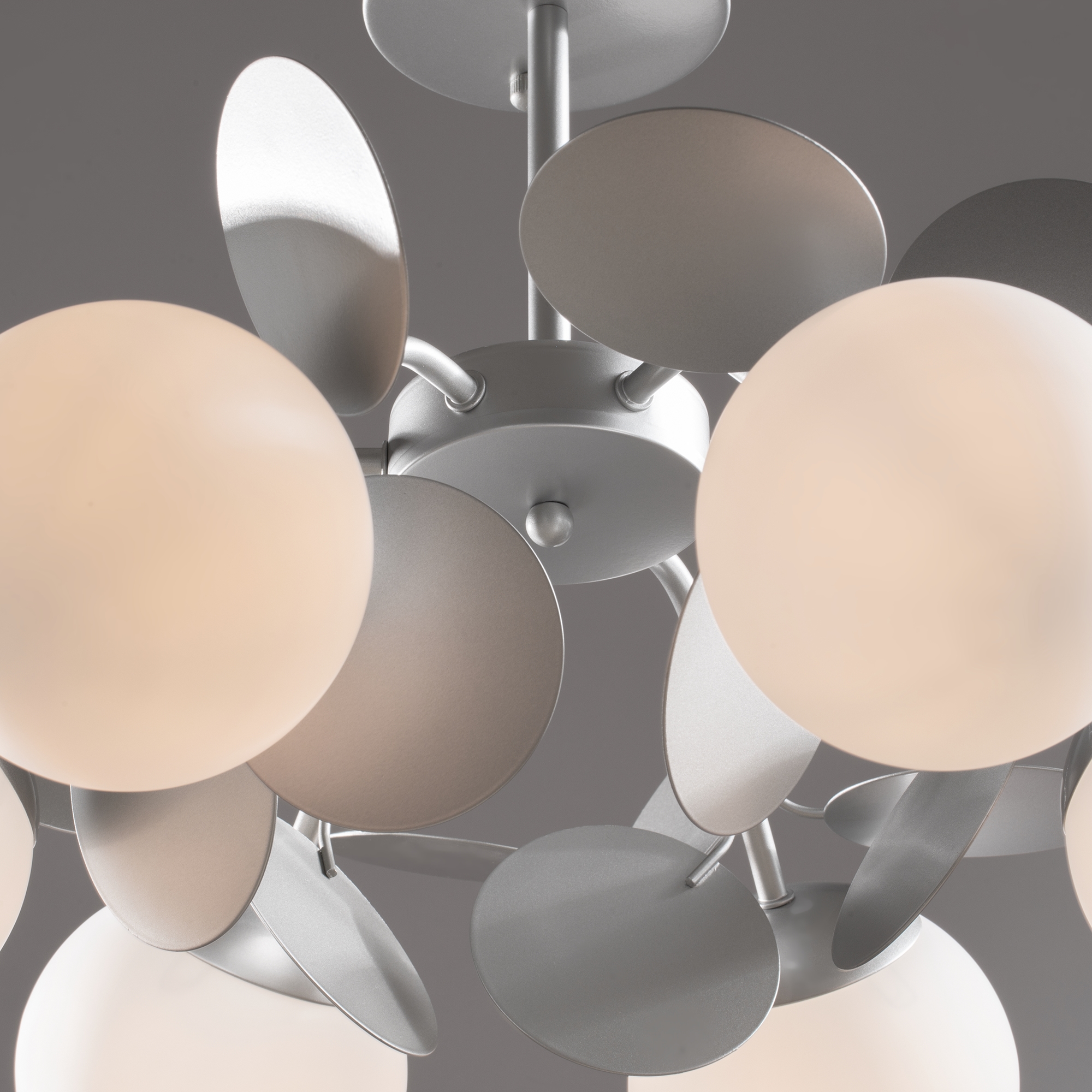 Металлическая арматура, оттенки – черный, белый. Плафоны-споты перемеща ются по кольцу, вращаются на 340° по горизонтали и 90° по вертикали. LED- модуль, акриловый рассеиватель.