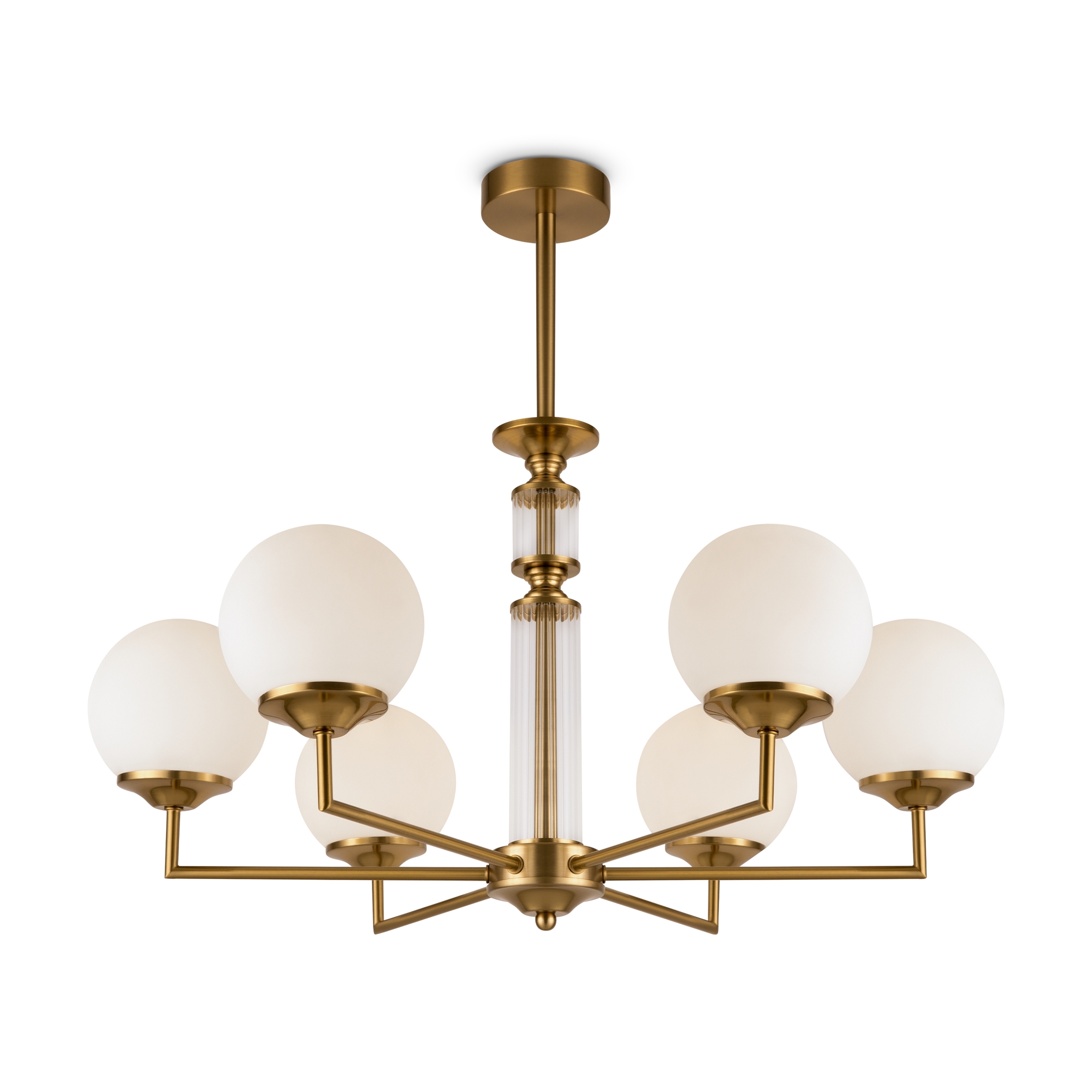 Металлическая арматура окрашена в цвет латуни. Плафоны-сферы из матового белого стекла. Декор – прозрачное рельефное стекло. Источник света – лампа с цоколем Е27.