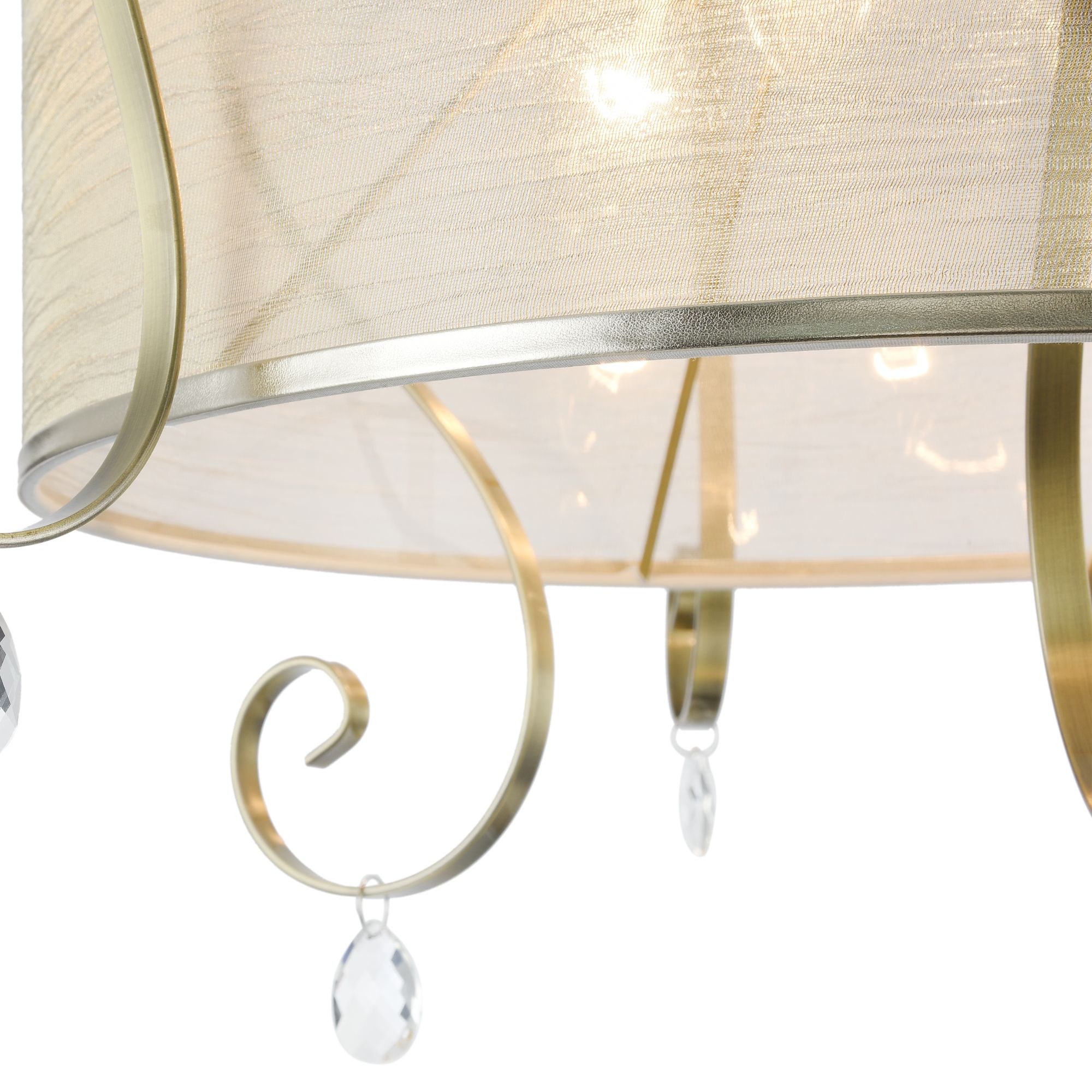 Абажуры и арматура светильников выполнены в разных цветах, с несколькими видами арматуры. Основание люстры украшено стеклянным декоративным элементом, а завитки рожков украшают подвески.