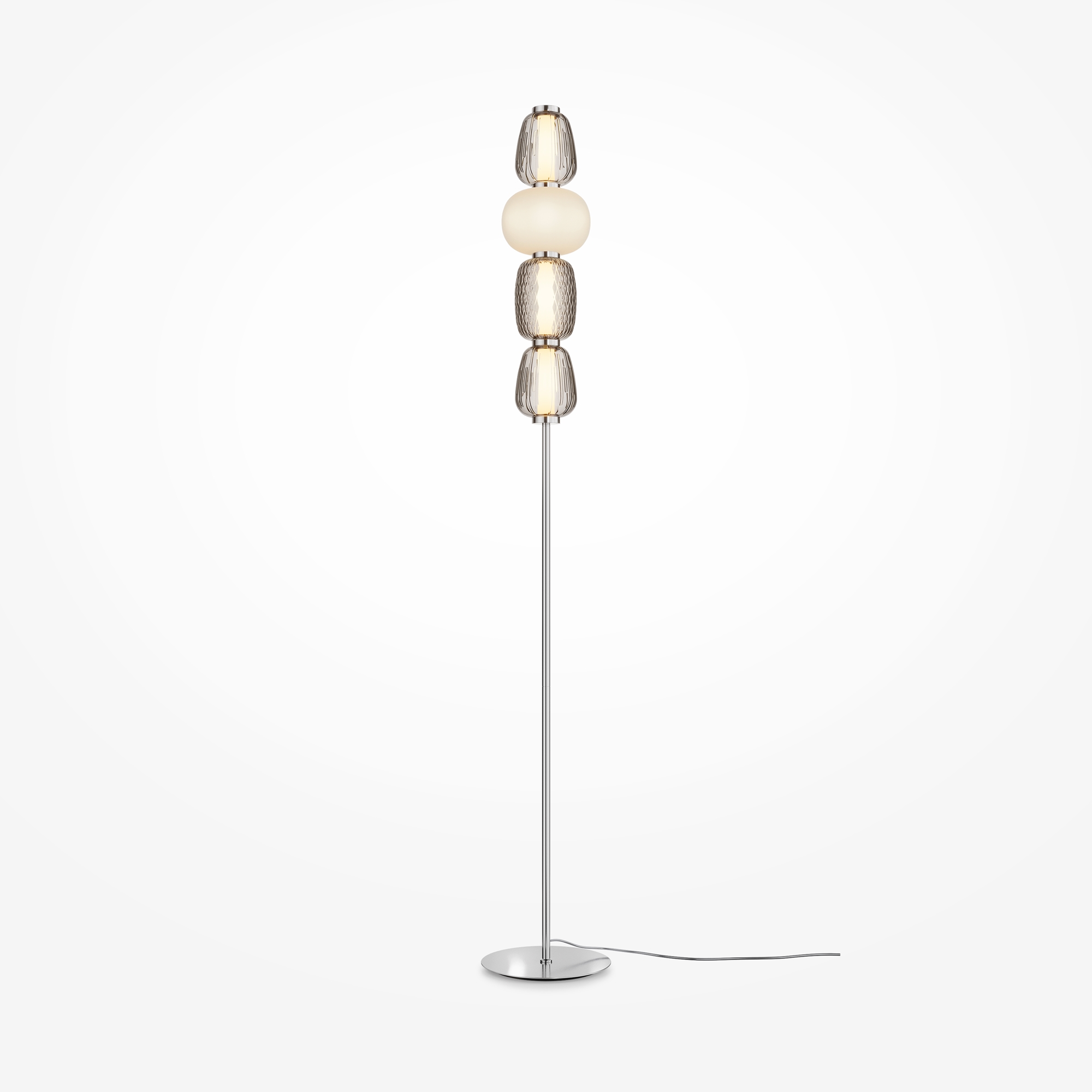Металлическая арматура, цвет - золото, хром. Микс плафонов округлых и вытянутых форм из белого матового и прозрачного стекла с сетчатым и с линейным повторяющимся рельефным рисунком. Регулируемая высота подвесных моделей, провод - 3 метра. LED-источник света, цветовая температура 3000К.